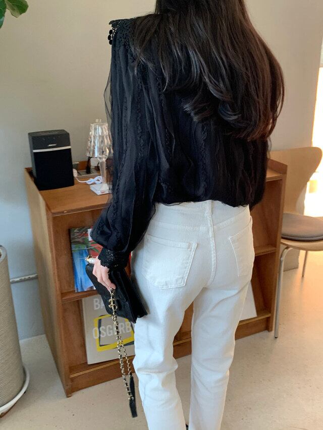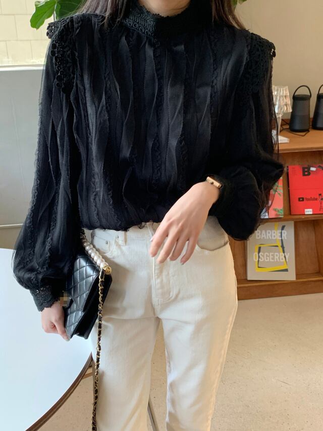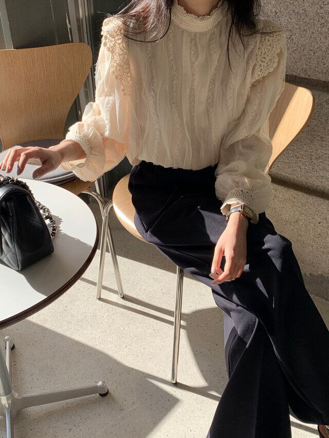 この秋あなたにおすすめしたい、上品でかわいい一枚が登場。レースとシフォンの組み合わせが女子力を高めてくれます。バブルスリーブが今年らしく、程よくボリューム感がありつつかわいらしさをプラスしてくれます。