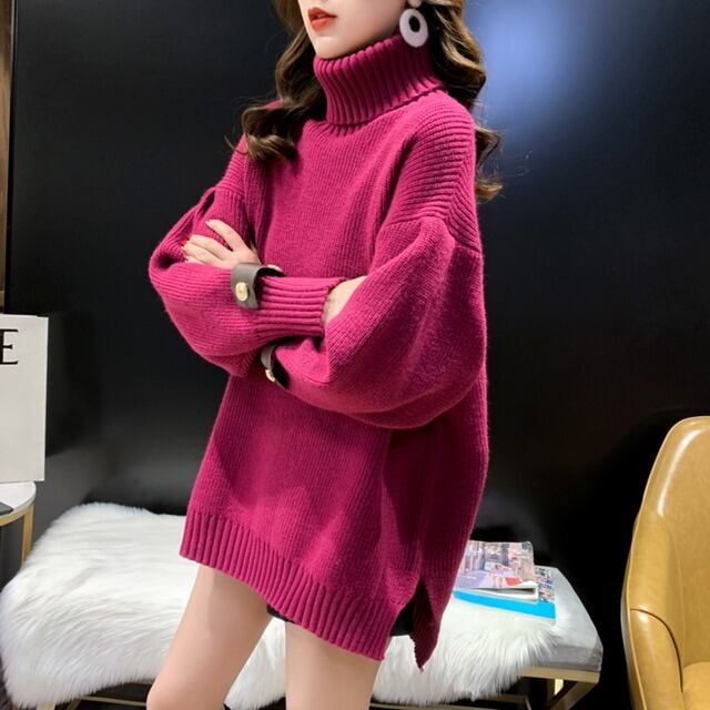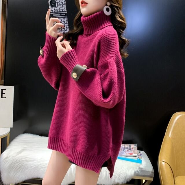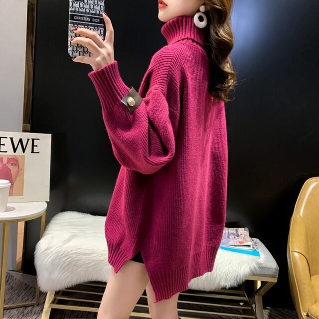 トレンド感あふれるタートルネックと適度なざっくり感が魅力のニットセーターをご紹介します。 袖は長めのデザインで手首まで覆い、リブが入った袖口で冷たい風から手首を守ってくれます。 丈は長めで、ボタンが付いているため前開きで着やすく、トップスやシャツのインナーにもぴったりです。 スリットもあるので、着こなしも自由自在です。 カラーバリエーションも豊富に取り揃えています。 あたたかくて、体型カバーになる優れもの。 このニットセーターがあれば、オシャレな季節のおでかけもさらに楽しいものになるはず。 ぜひお気に入りの一枚として、ご活用ください。