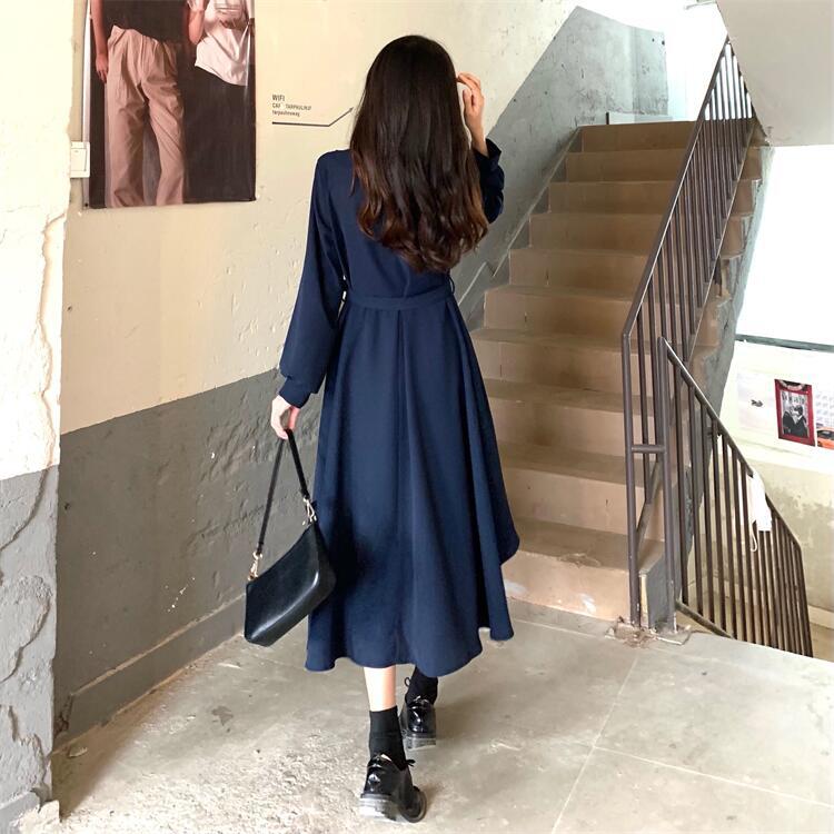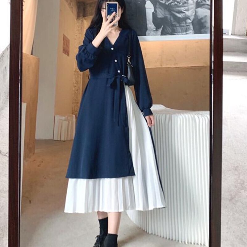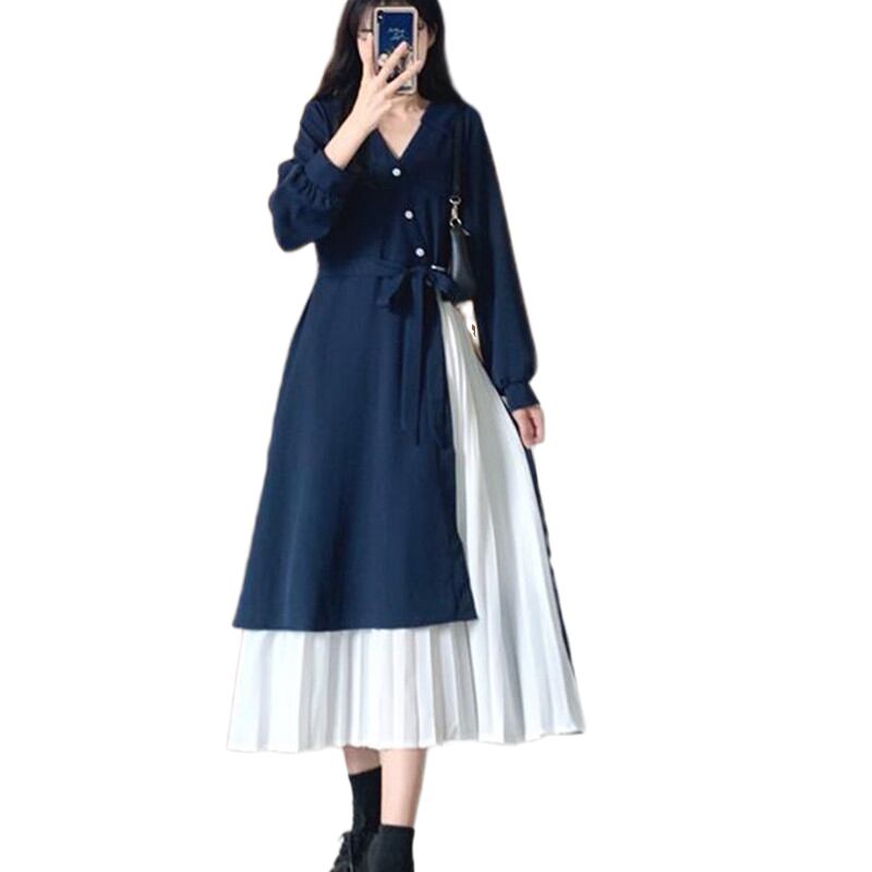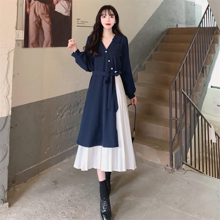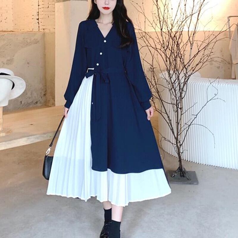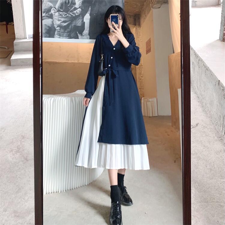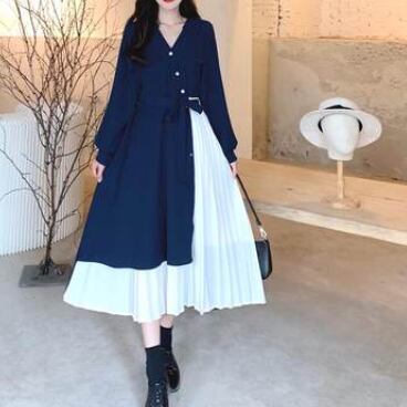 ワンピース パッチワーク プリーツ ミモレ丈 袖あり 長袖 Vネック かわいい 大人可愛い きれいめ シンプル 大人 上品 おしゃれ お洒落 大人可愛い 大人女子 こなれ感 ラフ メンズライク 春 秋 10代 20代 レディース 学生 ファッション コーデ スタイル 楽ちん モテ 体系カバーS M L XL 2XL 3XL 4XL 青 ブルー お出かけ 韓国系 韓流ファッション 女子会 個性的 女性用 女の子 デート 公園デビュー お泊まり 休日 イベント 旅行 オルチャン コーデ モテ プレゼント