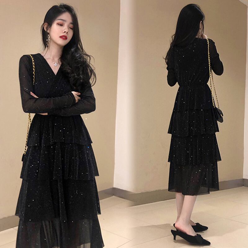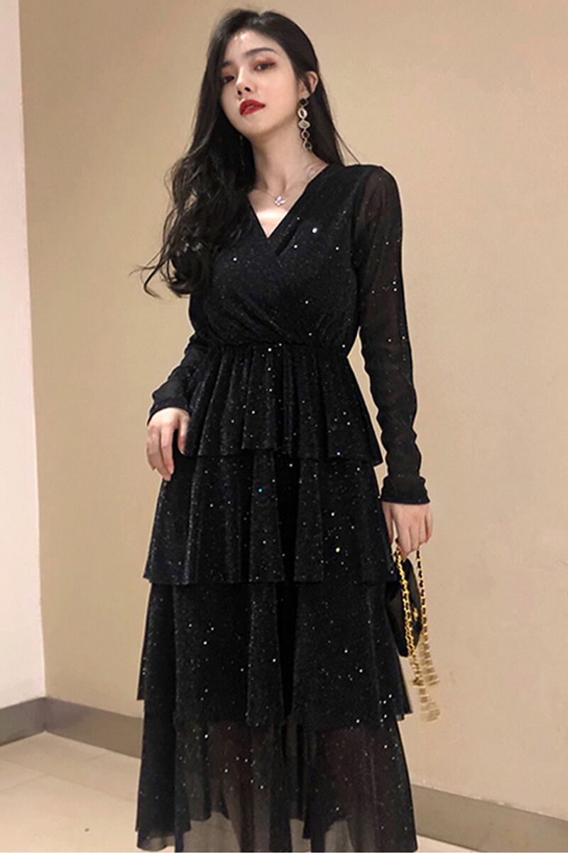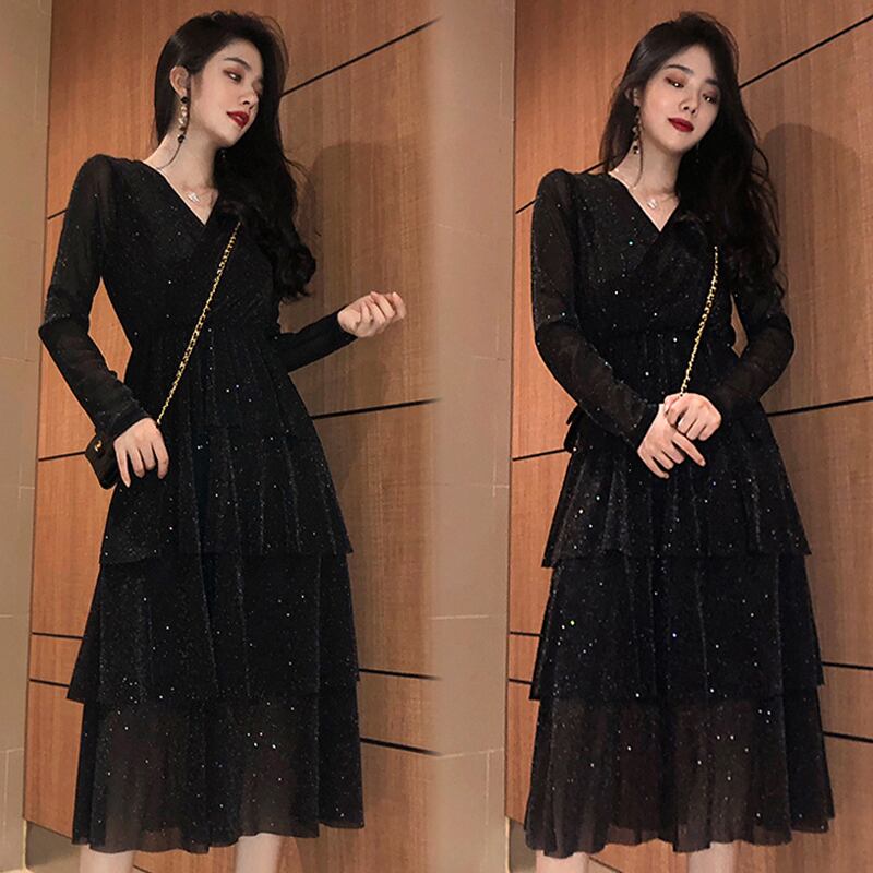 長袖ワンピース ドレス 魅せる ワンピース ミドル丈 袖あり 長袖 Vネック フレア ファスナー ジッパー フリル 大人女子 大人 上品 おしゃれ きれいめ シンプル モード系 エレガント レトロ レトロ風 個性的 デザイン 主役級 存在感 モダン 無地 秋 誕生日 謝恩会 披露宴 10代 20代 レディース 女性用 イベント リゾート 旅行 パーティ モテ トレンド ファッション コーデ 美脚 足長 スタイル 3XL 4XL 大きいサイズ M L XL 2XL ブラック