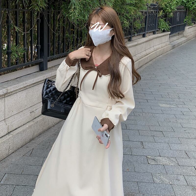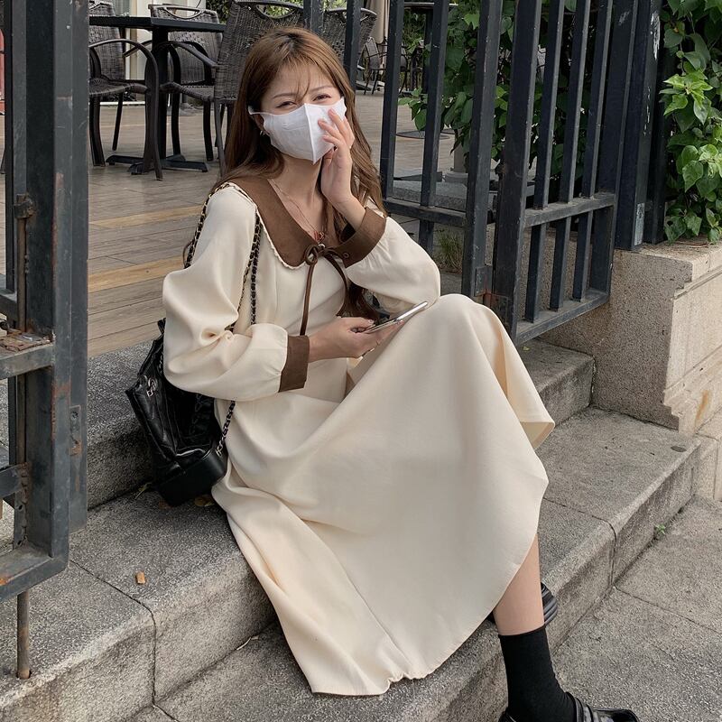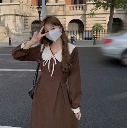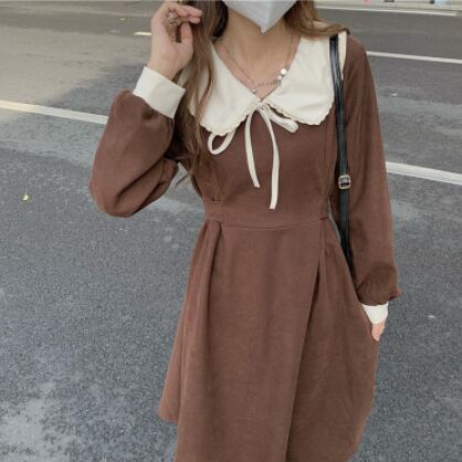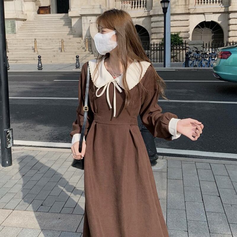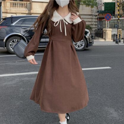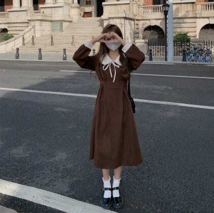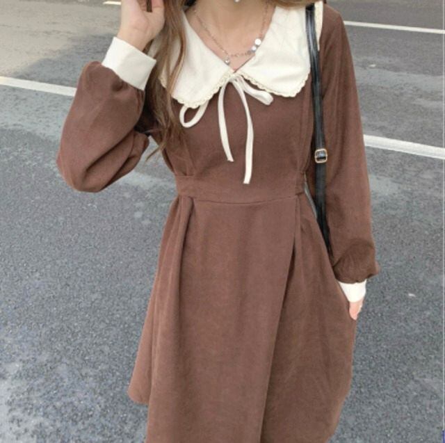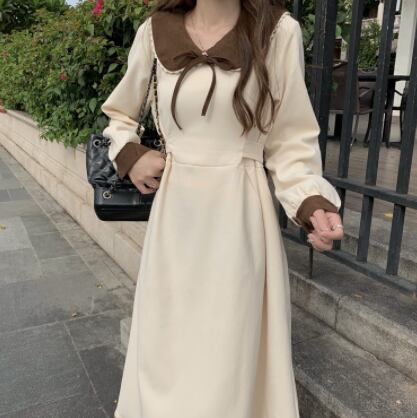 長袖ワンピース 魅せる ワンピース ミディアム丈 膝下 袖あり 長袖 襟付き フレア Aライン リボン 大人女子 大人 上品 おしゃれ きれいめ シンプル エレガント レトロ レトロ風 こなれ感 ラフ キュート ガーリー かわいい 女子 個性的 デザイン 主役級 存在感 ラブリー フェミニン 無地 冬 10代 20代 レディース 女性用 学生 通学 デート お出かけ 女子会 イベント リゾート 旅行 着回し 普段使い ファッション コーデ ワンサイズ ブラウン アプリコット