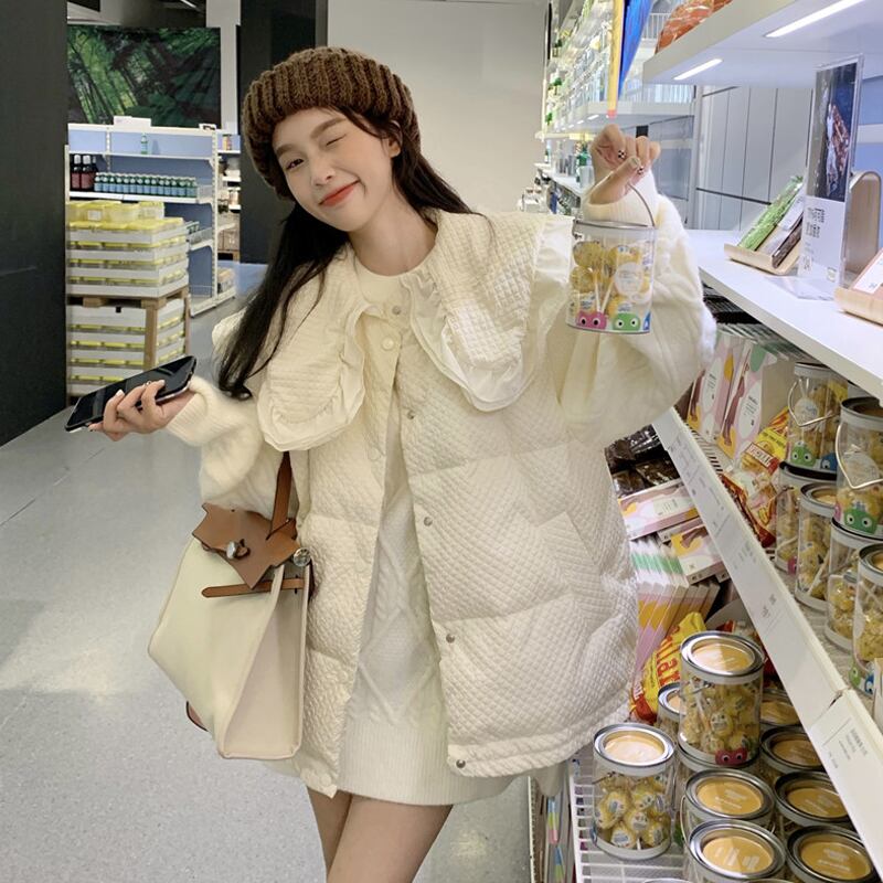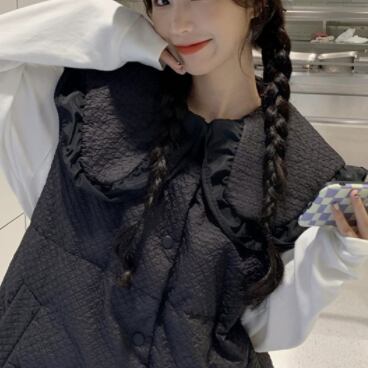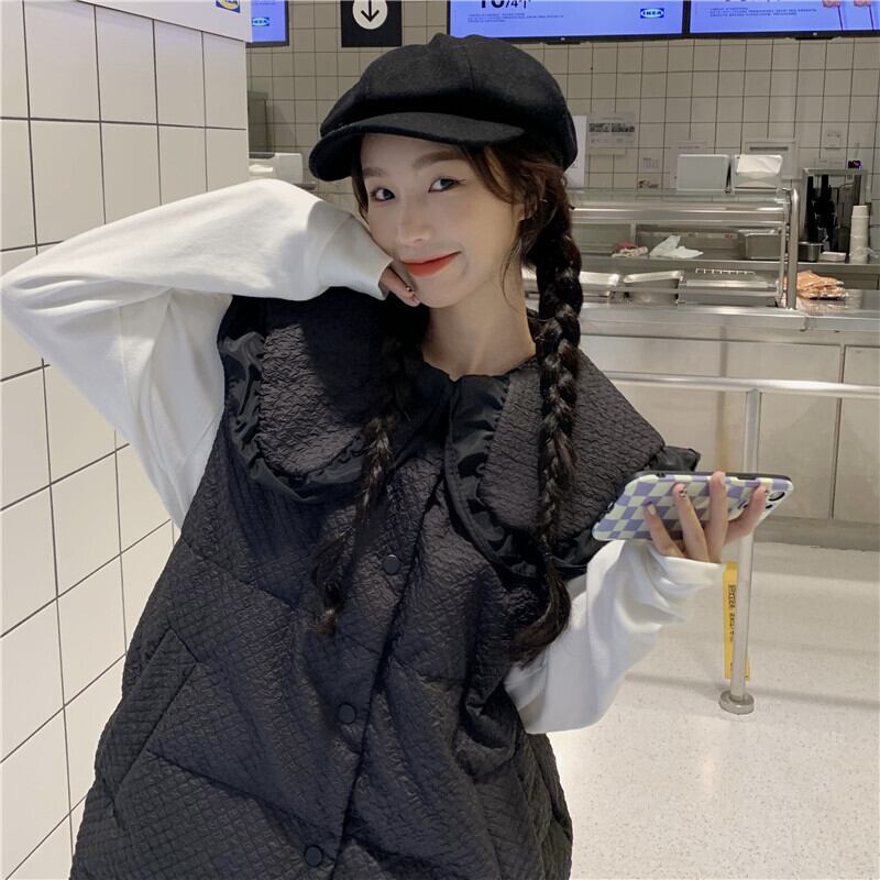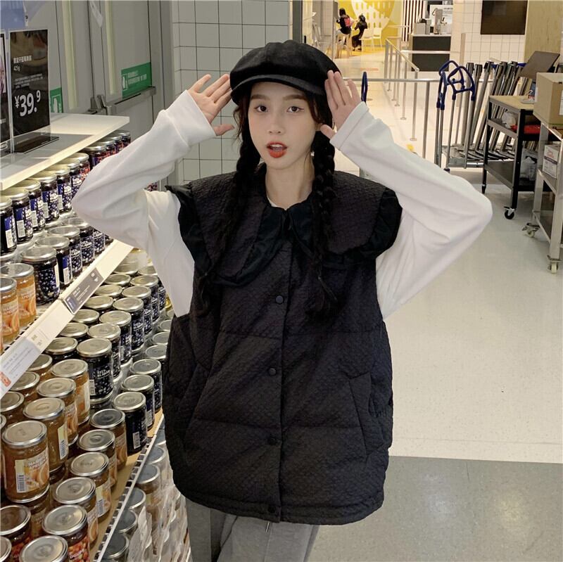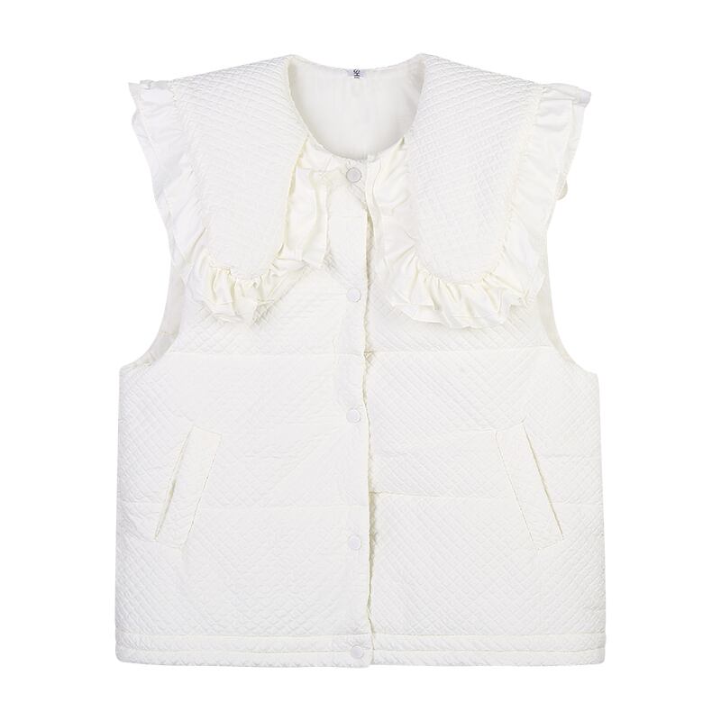 トップス ベスト ノースリーブ ラウンドカラー 襟付き フリル ダウン風 もこもこ かわいい シンプル おしゃれ 大人可愛い 大人女子 メンズライク キュート ガーリー 無地 秋 冬 10代 20代 レディース 学生 通学 デート お出かけ 公園デビュー 女子会 休日 普段使い 韓国系 オルチャン ファッション コーデ スタイル 暖かい モテ プチプラ トレンド 流行 インスタ映え 白 ホワイト 黒 ブラック 女の子プレゼント 安いお得 合わせやすい 低価格 コスパ 値段重視 低予算 インポート