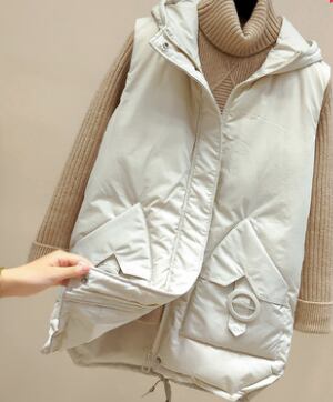 このダウン風ジャケットは、オールシーズン活躍する便利なトップスです。袖なしデザインで、アウターとしてもインナーとしても重宝します。フード付きで、急な雨や風にも対応できるよう、ファスナーはしっかりとした付け根スタイル。ポケットも付いているので小物も収納可能。シンプルできれいめなデザインは、大人な雰囲気を演出してくれます。