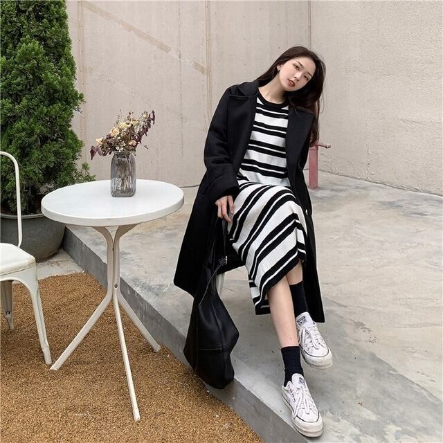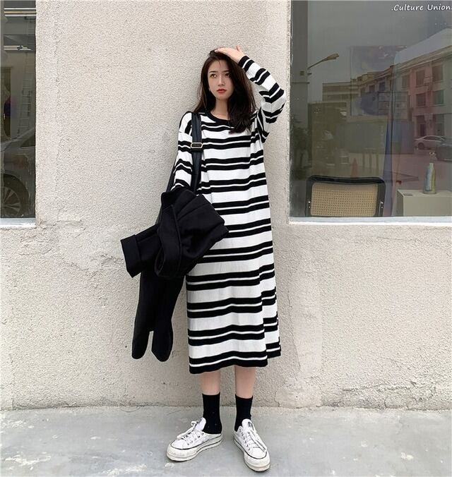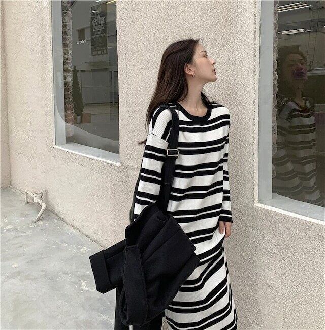 ワンピース ニットワンピ 長袖 ラウンドネック 襟なし ドロップショルダー パイピング ボーダー 総柄 ロングスカート Iライン モノトーン 白 ホワイト 黒 ブラック ゆったりサイズ かわいい 大人可愛い 大人 大人女子 カジュアル おしゃれ お洒落 定番 キュート ナチュラル 10代 20代 30代 通勤 学生 通学 デート お出かけ 女子会 休日 イベント 普段使い リラックスモード リモートワーク こなれ感 抜け感 ゆる 幼稚園送迎 ラフ リゾート 旅行 着回し 簡単コーデ お買い得 トレンド
