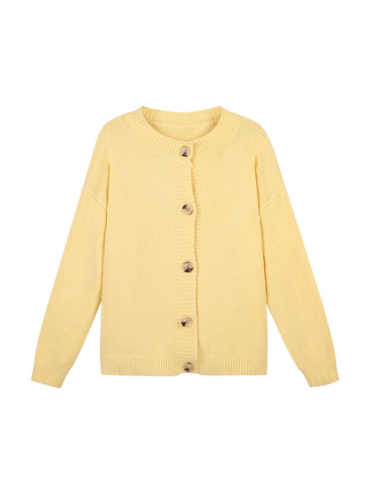 明るい色の映えるニットカーディガンです。