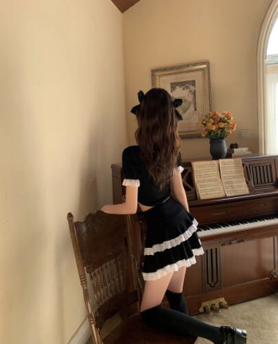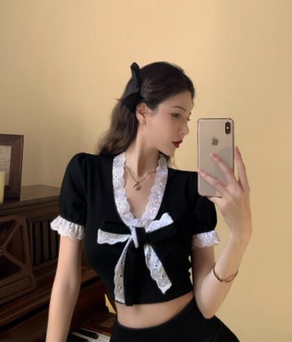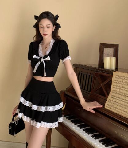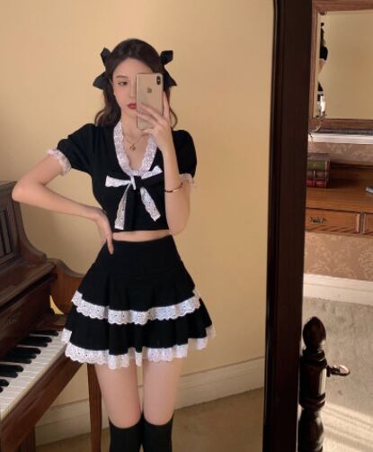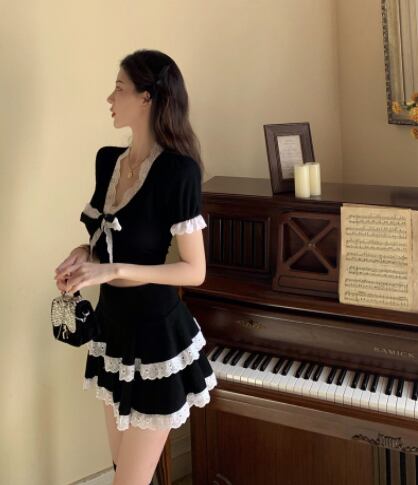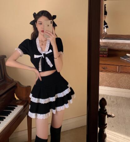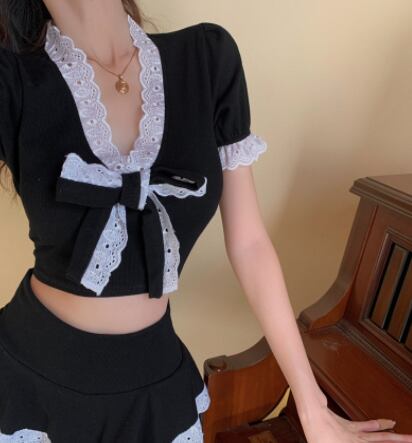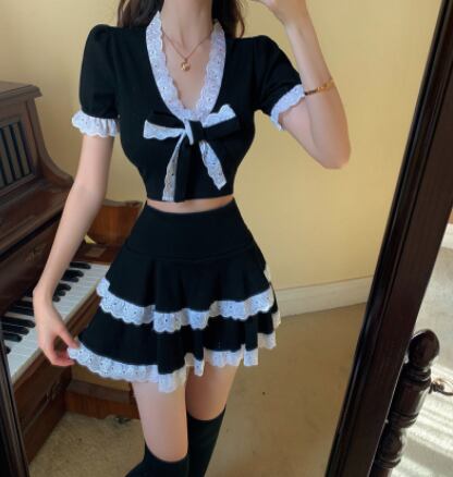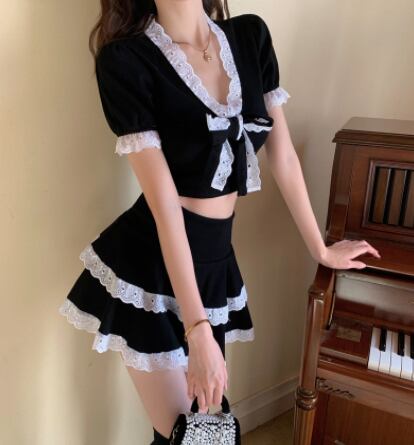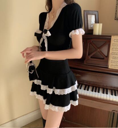 ツーピースセット 魅せる トップス スカート ミニ丈 ショート丈 袖あり 半袖 Vネック スリム タイト リボン レース 上下セット 2点セット ツーピース エレガント レトロ レトロ風 こなれ感 ラフ キュート ガーリー かわいい 女子 個性的 デザイン 主役級 存在感 ラブリー 無地 春 夏 ハロウィン 10代 20代 レディース 女性用 休日 イベント リゾート 旅行 パーティ 着回し 普段使い モテ トレンド ファッション コーデ 美脚 足長 細見え スタイル インスタ映え S M ブラック