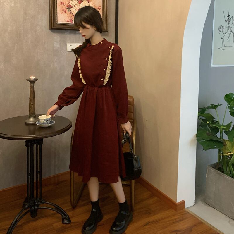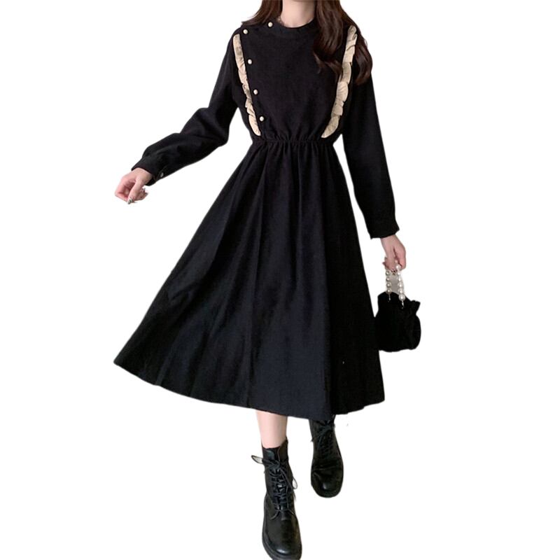 長袖ワンピース 魅せる ワンピース ミディアム丈 袖あり 長袖 ラウンドネック フレア Aライン ボタン ベルト ウエストマーク フリル 大人女子 大人 上品 おしゃれ きれいめ シンプル エレガント レトロ レトロ風 こなれ感 ラフ キュート ガーリー かわいい 女子 個性的 デザイン 主役級 存在感 モダン ラブリー 無地 秋 冬 10代 20代 レディース 女性用 デート お出かけ 女子会 着回し 普段使い 3XL 4XL 大きいサイズ M L XL 2XL ブラック エンジ