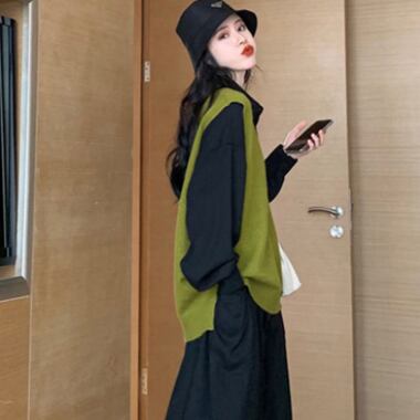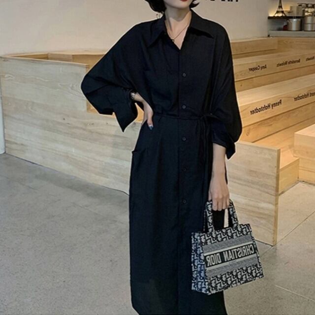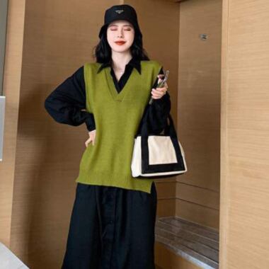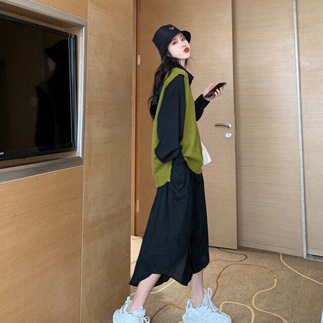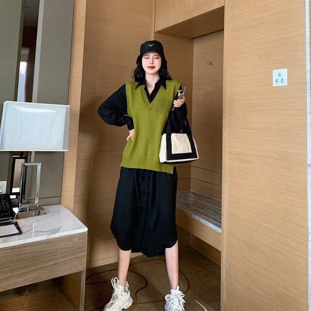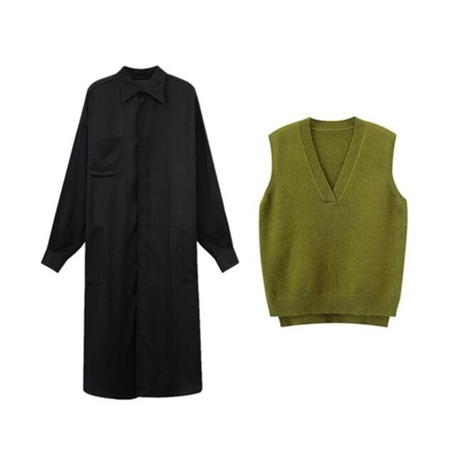 ワンピース ベスト レディース 女性用 胸ポケット ドレス セット 長袖 ロング丈 ポロ 前ボタン ニット セーター 襟あり Vネック シャツ バルーン袖 フレア袖 大人可愛い カジュアル 大人カジュアル かわいい ガーリー おしゃれ かっこいい 大人女子 メンズライク レディライク 単色 黒 ブラック 深緑 緑 グリーン カーキ お出かけ デート 秋 冬 春 韓国ファッション トレンド OL 通勤 通学 学生 10代 20代 30代 人気 ラフ こなれ感