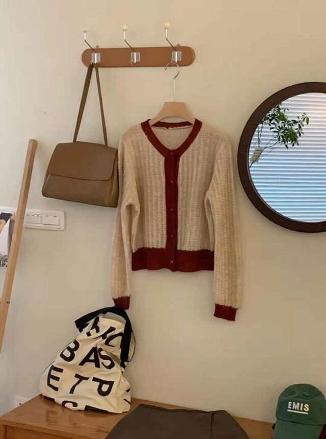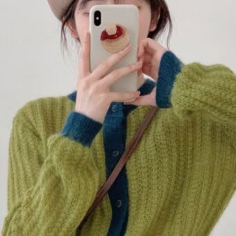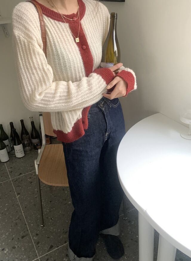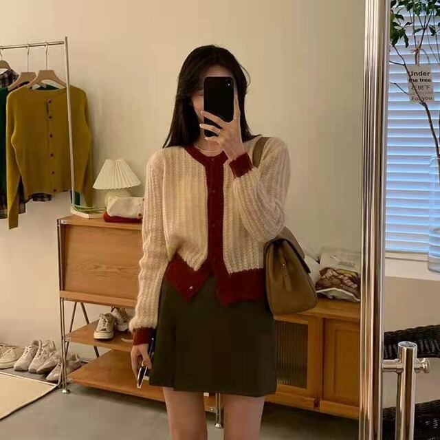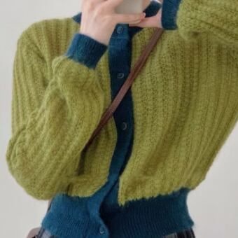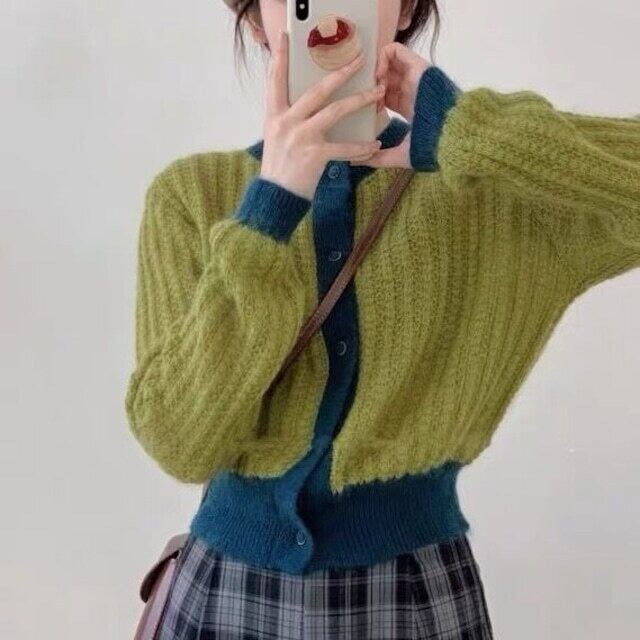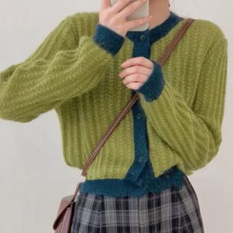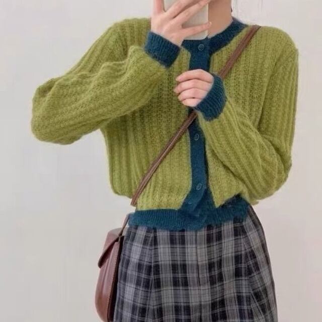 ニットカーディガン レディース 長袖 バイカラー ラウンドネック 前ボタン 前開き 配色ニット 寒色系 暖色系 定番カーディガン 短め丈 リブ袖 スクールガール風 畔編み グリーン オフホワイト ライン入り 着まわせる かわいい おしゃれ トレンド 重ね着 秋冬 オフィスカジュアル 公園デビュー デート ラフ カジュアル ワンマイルスタイル ナチュラル アクセントカラー 女の子っぽい 韓国服 インポート 韓国ファッション プチプラ お買い得 低価格 値段重視 10代 20代 30代 清潔感 好感度アップ