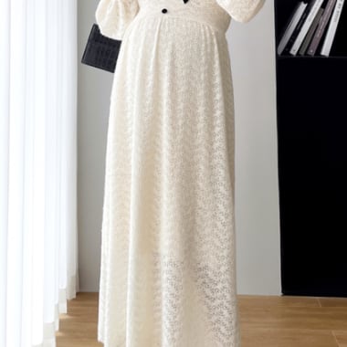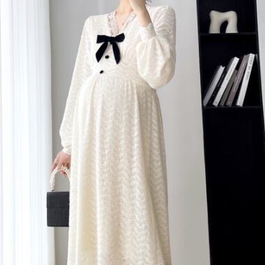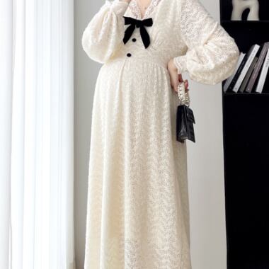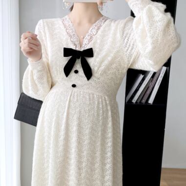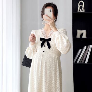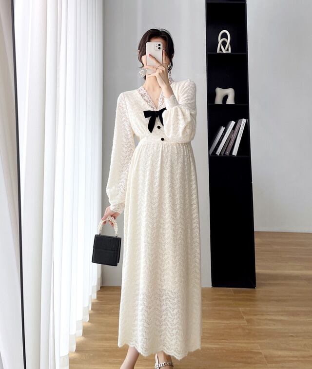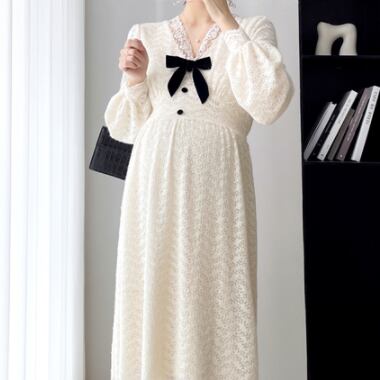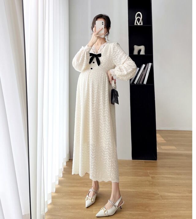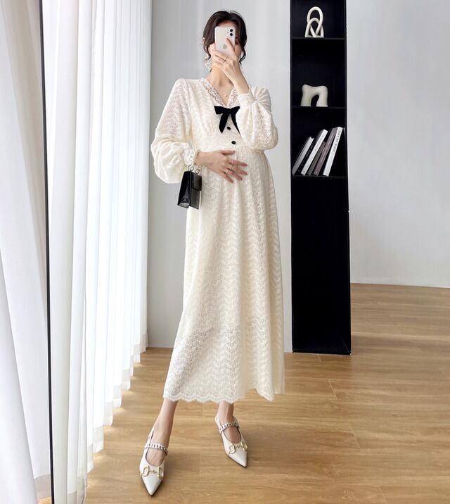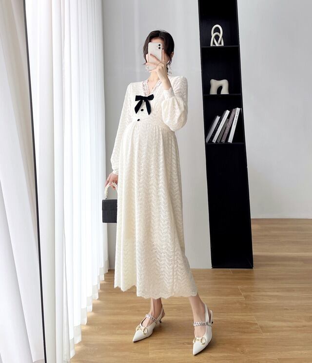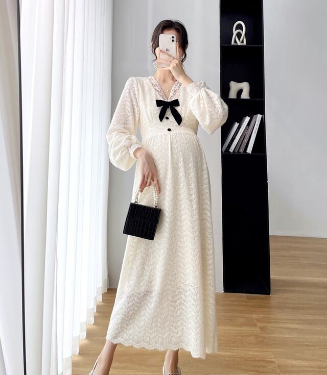 ワンピース 妊婦さん ニット ロングスカート ロング丈 ロング マタニティ マタニティウェア マタニティドレス 袖あり 長袖 袖長め シンプル アプリコット レース リボン ボタン Vネック ラフ ルーズ こなれ感 抜け感 大人可愛い かわいい 大人女子 OL ママ ミセス ショッピング 公園 休日 デイリー お出かけ 食事会 女子会 着回し 普段使い 韓国系 インポート 海外ファッション セレクト モテ おすすめ 人気 簡単コーデ 体型カバー スタイルアップ 楽ちん 伸縮性 トレンド ストレート