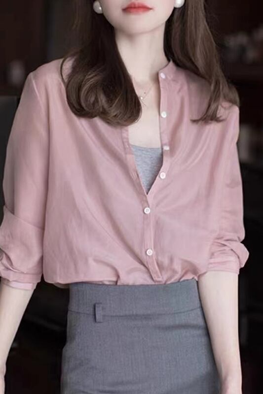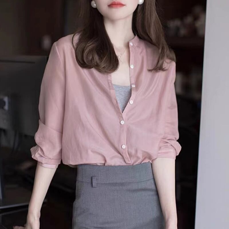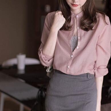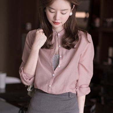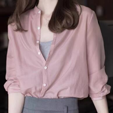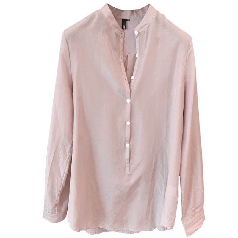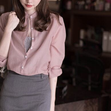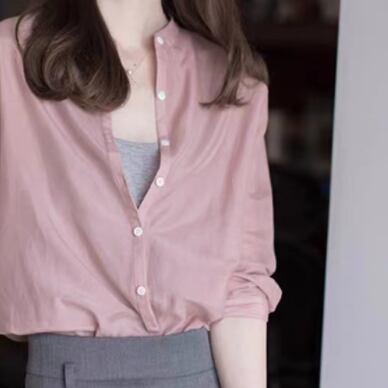長袖シャツ トップス ブラウス シンプル アプリコット ブルー 青 レギュラー丈 袖あり 長袖 襟なし ストレート シングルブレスト ボタン 大人女子 大人 上品 おしゃれ きれいめ シンプル エレガント レトロ レトロ風 こなれ感 ラフ 個性的 デザイン 主役級 存在感 無地 春 スプリング 秋 オータム 10代 20代 30代 40代 レディース 女性用 オフィス ビジネス OL 通勤 着回し 普段使い ファッション コーデ 定番 くすみカラー