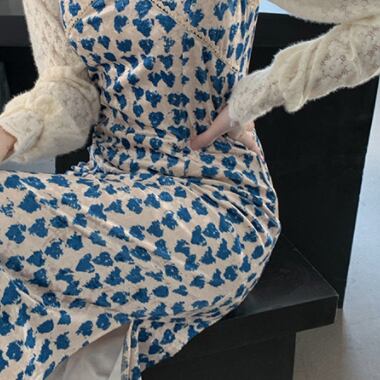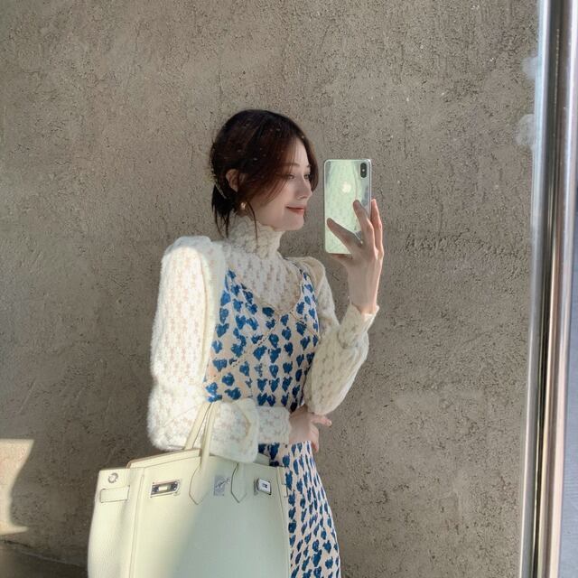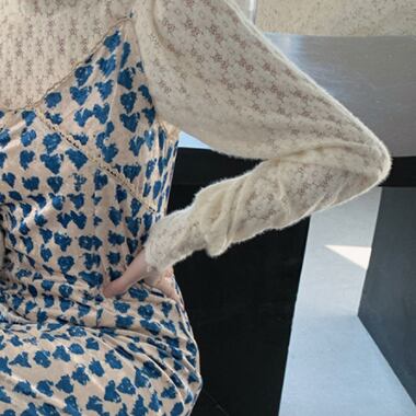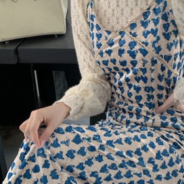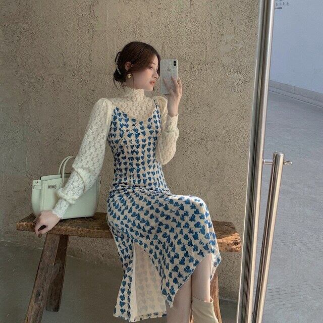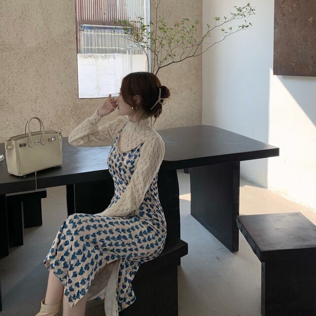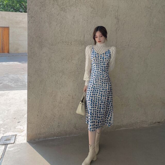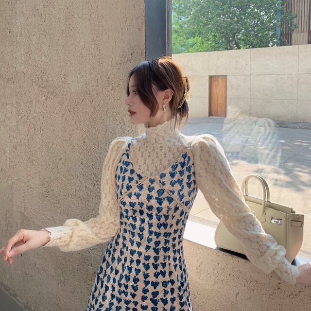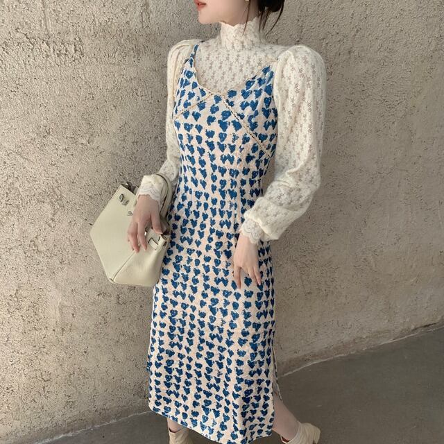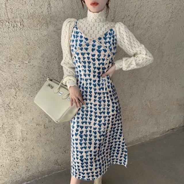 セットアップ レディース キャミワンピ スリット入り ハート柄 長袖ブラウス レース 花柄レース ハイネック 白ブラウス ミモレ丈 ロングスカート ハイウエスト 青 白 総柄 爽やか かわいい おしゃれ トレンド エンパイアライン スタイルアップ 脚長効果 大人っぽい 大人可愛い 大人女子 好感度アップ ナチュラル クラフト柄 手書き風 ツーピース ショッピング ランチ 女子会 幼稚園送迎 デート 普段使い 春秋 ピュア 清潔感 高見え お買い得 韓国ファッション 韓国服 インポート 低価格 プチプラ