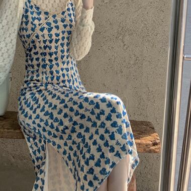セットアップのレディースが登場!キャミワンピにスリット入りのロングスカート、そして花柄レースの長袖ブラウスをセットにしたトレンド感あふれる一着。爽やかな青と白の総柄で、夏らしい清潔感とナチュラルな魅力を演出してくれます。ハート柄などかわいいデザインが盛り込まれているため、女性らしい大人可愛いスタイルが表現できます。