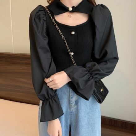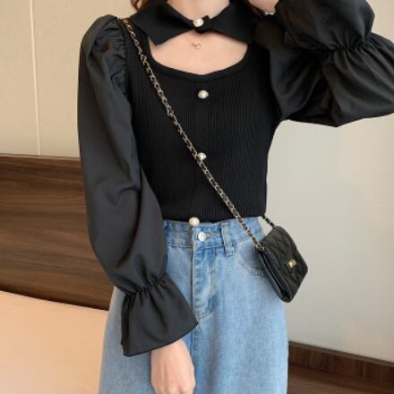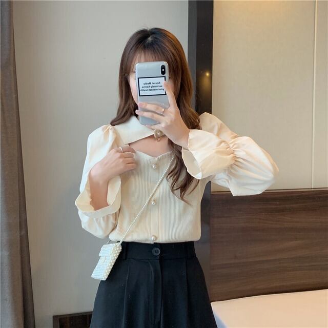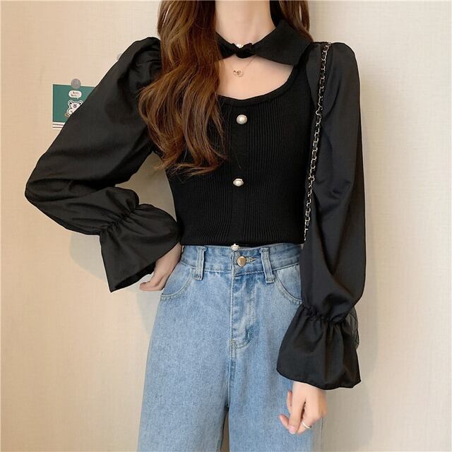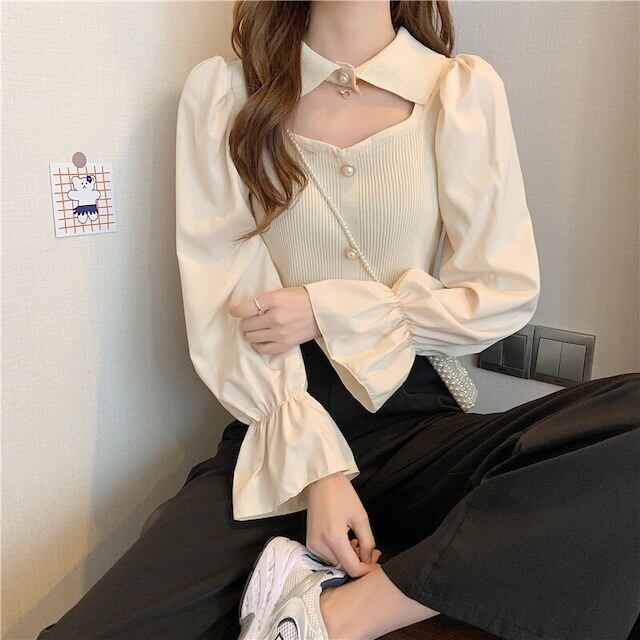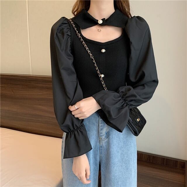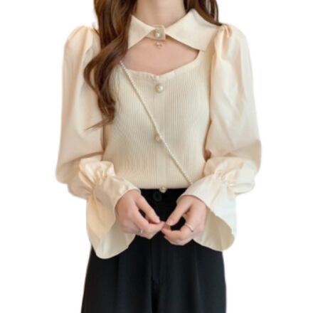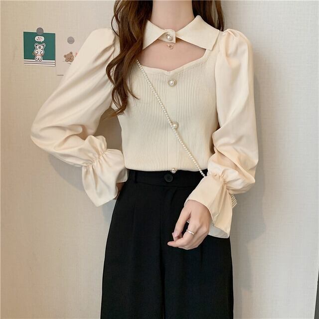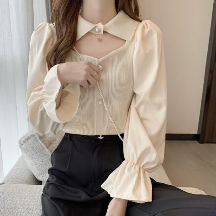 ニット トップス 襟付き 肌見せ ガーリー 上品 ブラウス モテ 長袖 きちんと感 お出かけ デート お食事 お呼ばれ 特別な日 秋 冬 ファッション 白 ホワイト アプリコット 黒 ブラック かわいい シック クラシック きれいめ 高見え 上品 大人かわいい 大人女子 通学 大学生 学生 OL ワンサイズ プルオーバー 韓国 韓国系 韓国ファッション 10代 20代 ラブリー キュート 清楚 個性的 異素材MIX フリル袖 女子会 お食事 イベント オルチャン おしゃれ お洒落 普段使い 着回し 重ね着