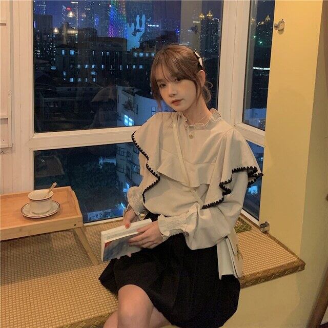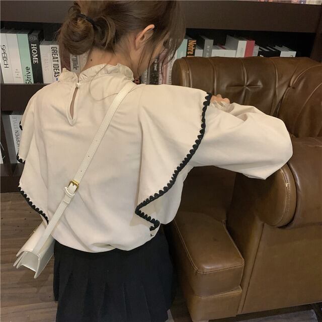 トップス シャツ ブラウス モノトーン 白 アプリコット 黒 ブラック 人気 トレンディ 長袖 ボリューム袖 ウイングショルダー フランジショルダー フリルカラー フリル かわいい 大人可愛い 大人 大人女子 きれいめ おしゃれ お洒落 シンプル ラブリー キュート ガーリー フェミニン 10代 20代 30代 通勤 学生 通学 デート お出かけ 女子会 休日 普段使い カジュアル 可憐 シック ふんわり こなれ感 ラフ ルーズ 抜け感 ゆったり ゆる 上品 エレガント 披露宴 パーティー イベント