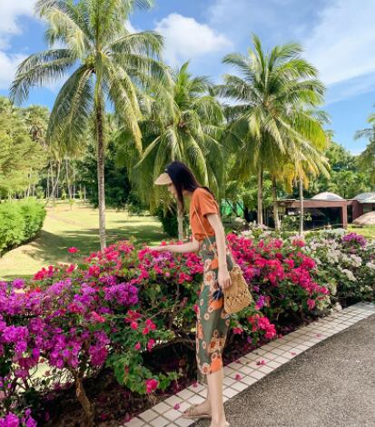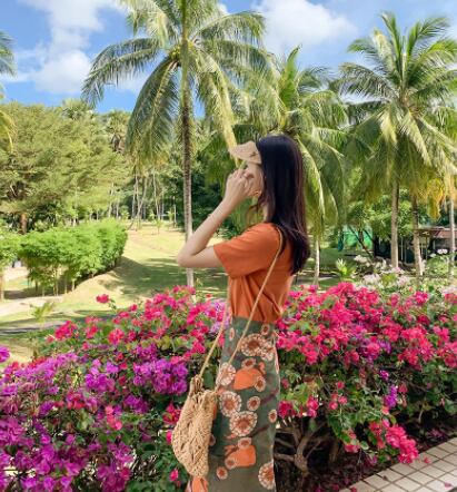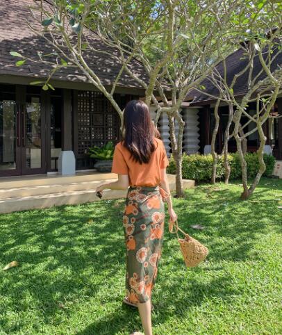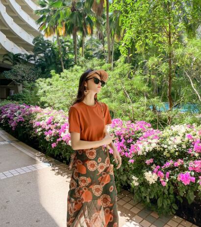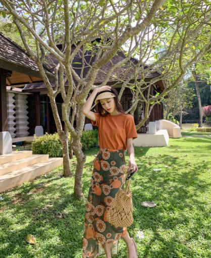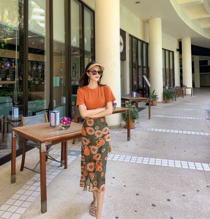 魅せるトップスとスカートの2点セットです。ミディアム丈で大人女子にぴったりなデザイン。袖ありの半袖Tシャツとラウンドネックが、シンプルでエレガントな印象を与えます。サイドスリットが入っているため、歩くときに足さばきが良く、重たく見えません。柔らかな風合いが特徴のオレンジ色の花柄柄で、春夏のコーディネートに大活躍します。