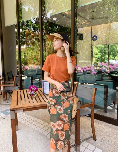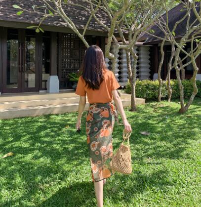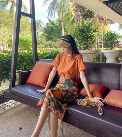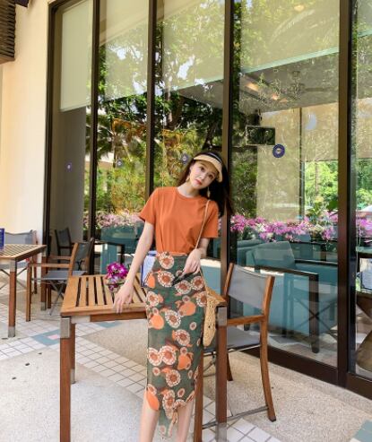 ツーピースセット 魅せる トップス スカート Tシャツ ミディアム丈 袖あり 半袖 ラウンドネック サイドスリット 上下セット 2点セット 大人女子 大人 上品 おしゃれ カジュアル エレガント レトロ レトロ風 こなれ感 ラフ 個性的 デザイン 主役級 存在感 柄 花柄 フラワー 春 夏 20代 30代 40代 レディース 女性用 デート お出かけ 女子会 イベント リゾート 旅行 プール 高原 ガーデン 着回し 普段使い トレンド ファッション コーデ スタイル S M オレンジ