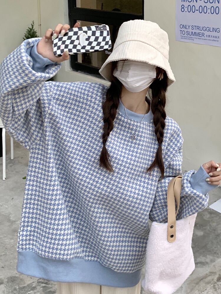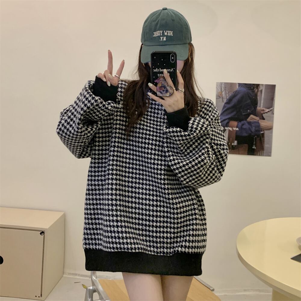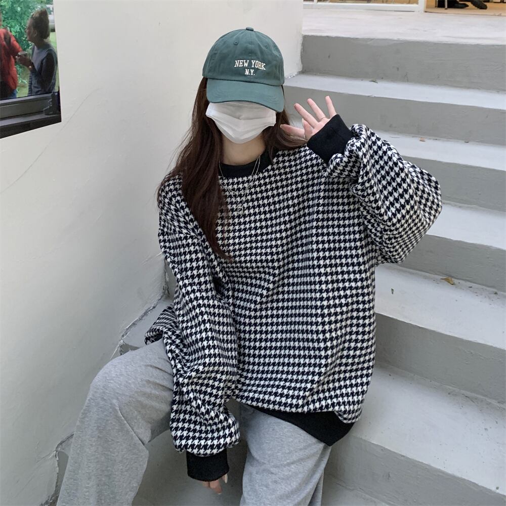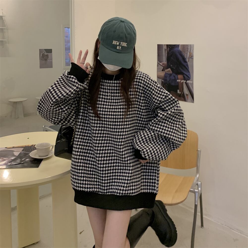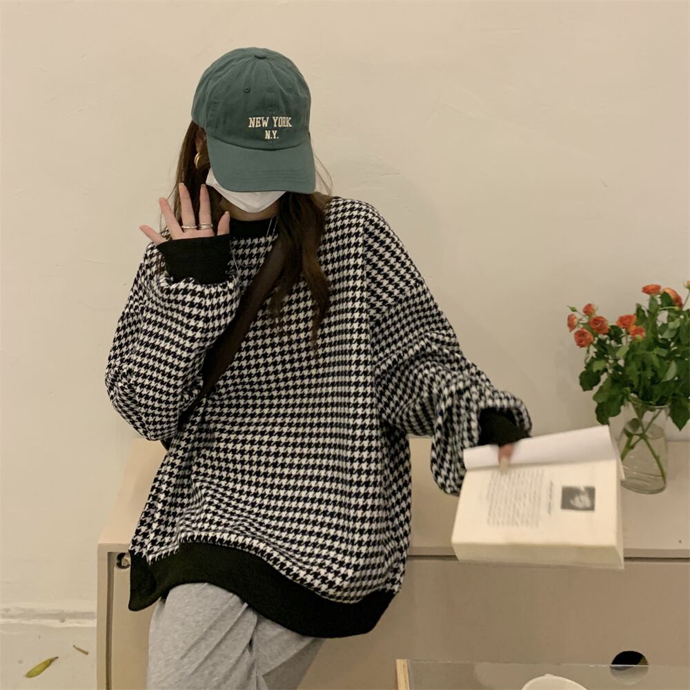 トレーナー 魅せる トップス セーター ブラック ブルー 韓国ファッション プルオーバー レギュラー丈 袖あり 長袖 ラウンドネック ストレート 大人女子 大人 上品 おしゃれ カジュアル レトロ レトロ風 こなれ感 ラフ ルーズ シルエット 個性的 デザイン 主役級 存在感 スポーティー 柄 チェック柄 格子柄 千鳥格子 秋 春 10代 20代 30代 レディース 女性用 ママ 学生 通学 運動 アウトドア 動きやすい 着回し 普段使い トレンド ファッション コーデ スタイル ワンサイズ