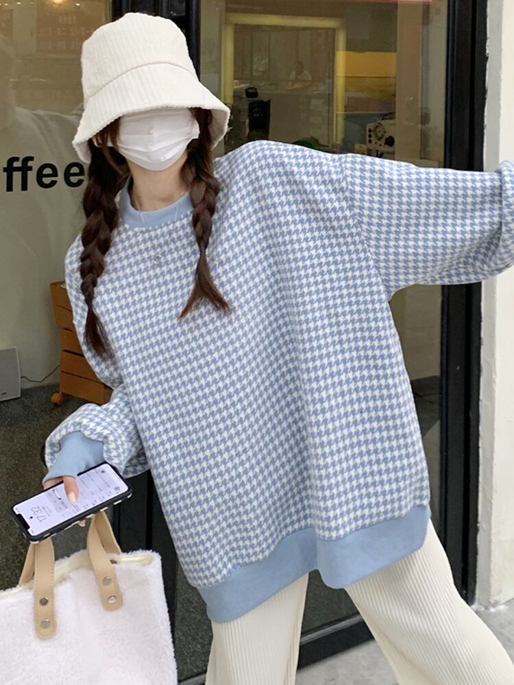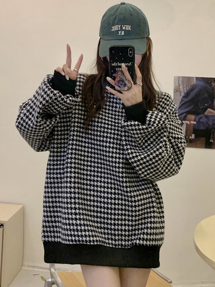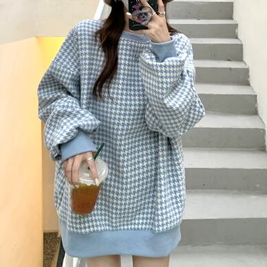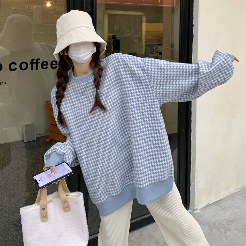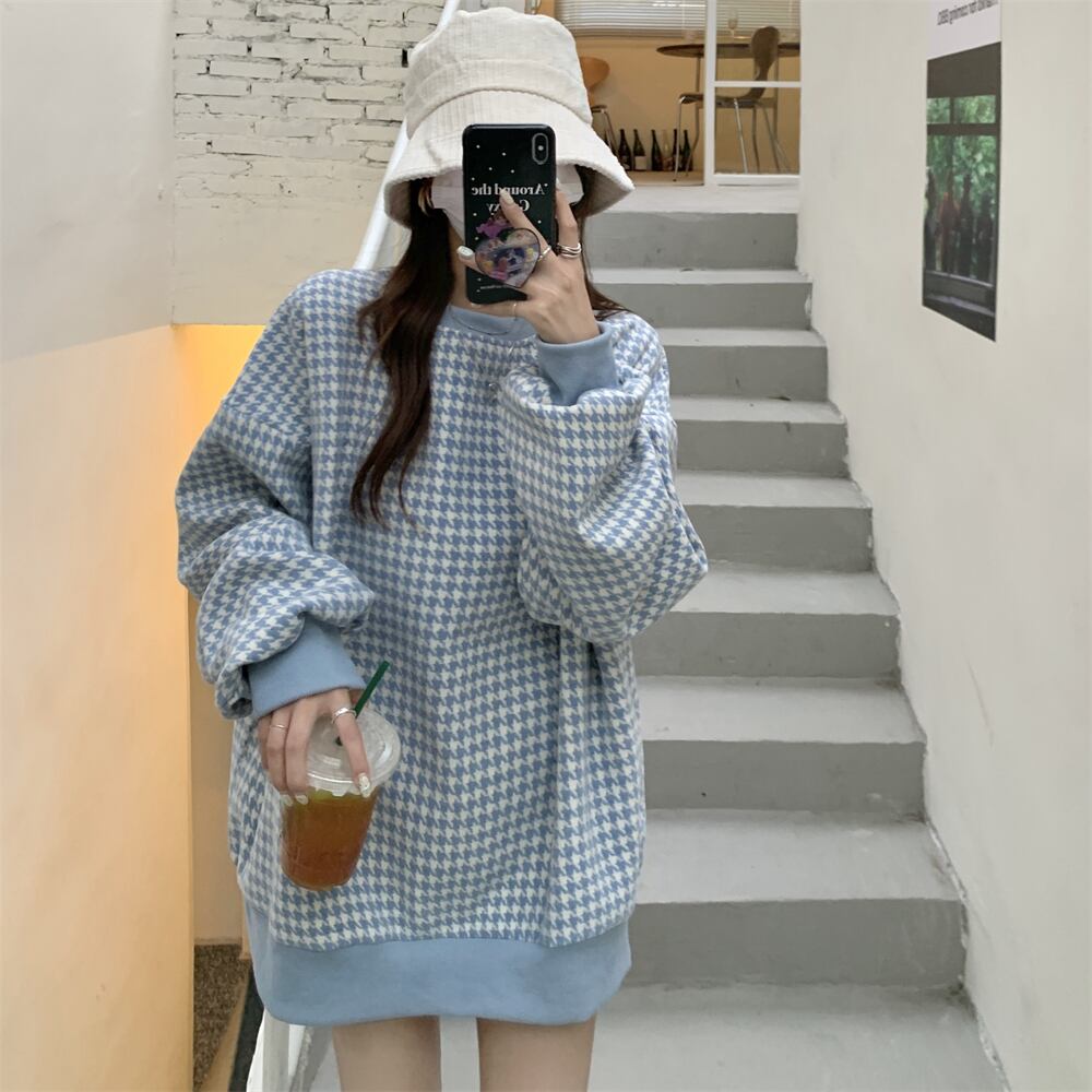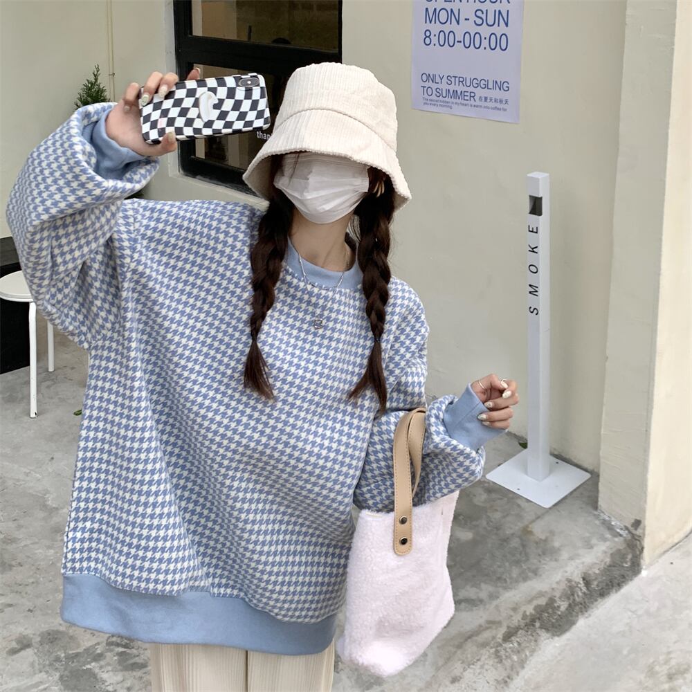 トレーナー 魅せる トップス セーター ブラック ブルー 韓国ファッション プルオーバー レギュラー丈 袖あり 長袖 ラウンドネック ストレート 大人女子 大人 上品 おしゃれ カジュアル レトロ レトロ風 こなれ感 ラフ ルーズ シルエット 個性的 デザイン 主役級 存在感 スポーティー 柄 チェック柄 格子柄 千鳥格子 秋 春 10代 20代 30代 レディース 女性用 ママ 学生 通学 運動 アウトドア 動きやすい 着回し 普段使い トレンド ファッション コーデ スタイル ワンサイズ