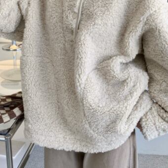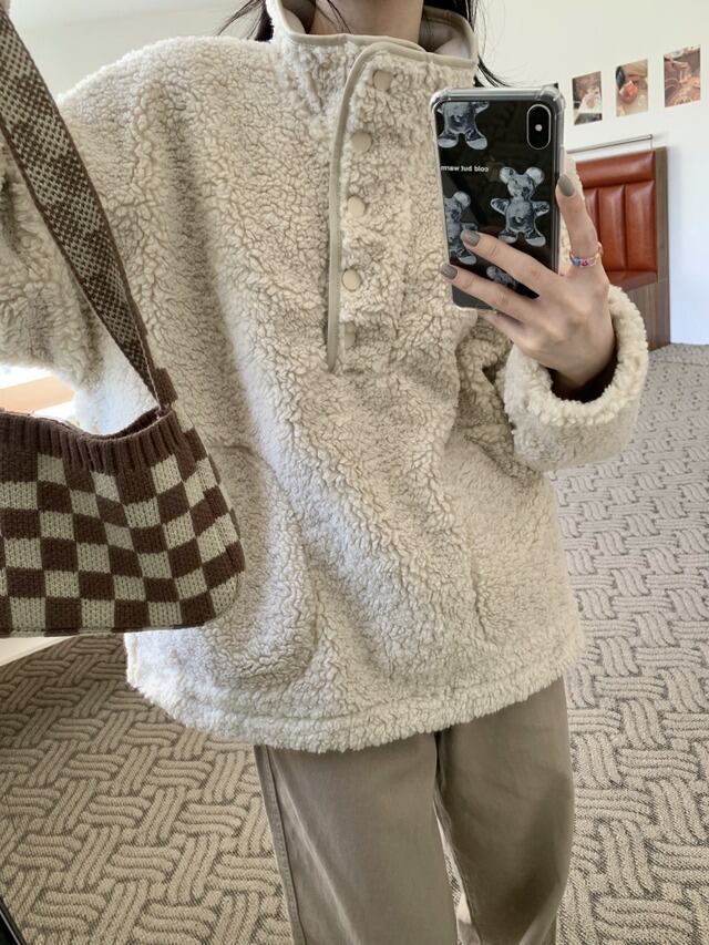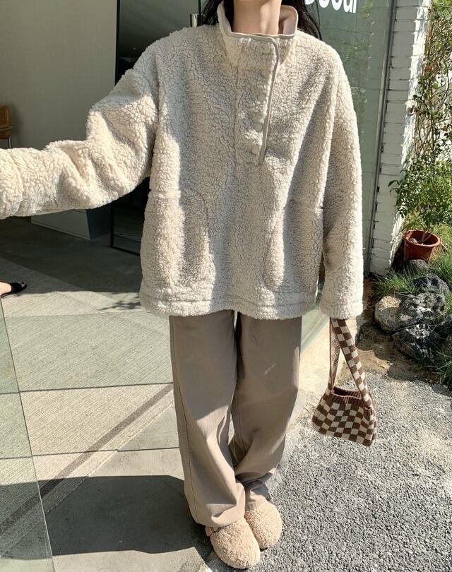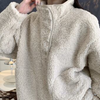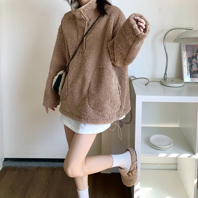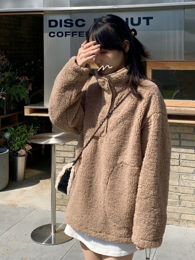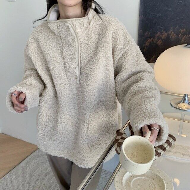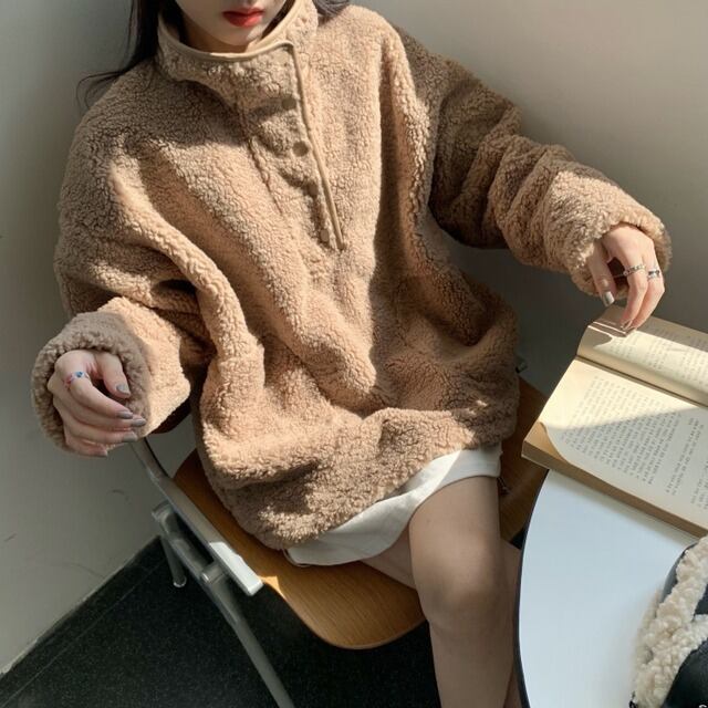 ボアトップス レディース フワモコ 長袖 立ち襟 ヘンリーネック プルオーバー 前ボタン ゆったりサイズ ドロップショルダー 袖長め 無地 単色 茶系 白系 ハイネック トレーナー オーバーサイズ 冬服 フワフワ リラックス 部屋着 ワンマイルスタイル 普段使い お買い物 カジュアル ラフ ルーズスタイル かわいい トレンド 大人可愛い ラテコーデ あったか 防寒 ナチュラル 10代 20代 30代 韓国ファッション お買い得 プチプラ 低価格 韓国服 インポート 輸入服 大きい 着まわせる 楽ちん