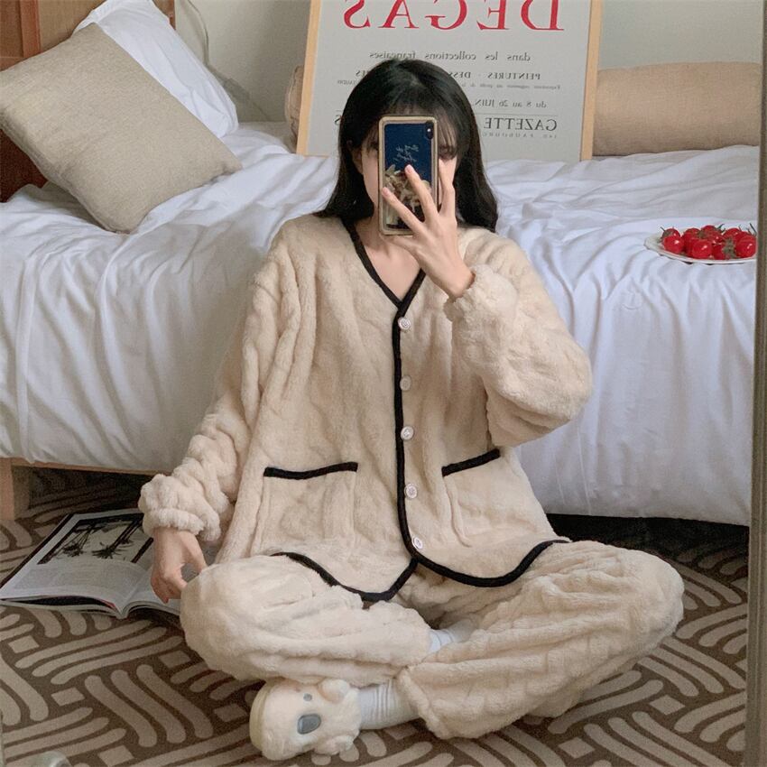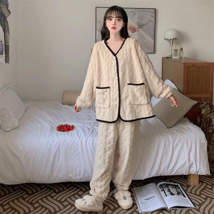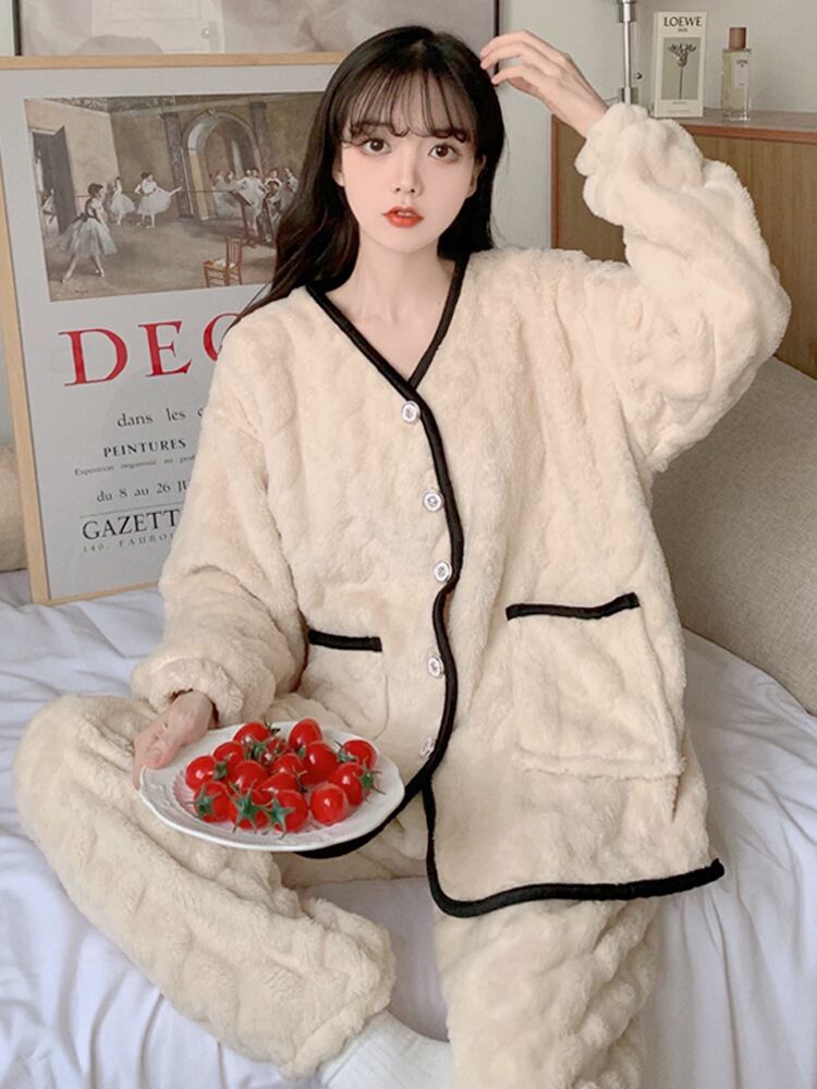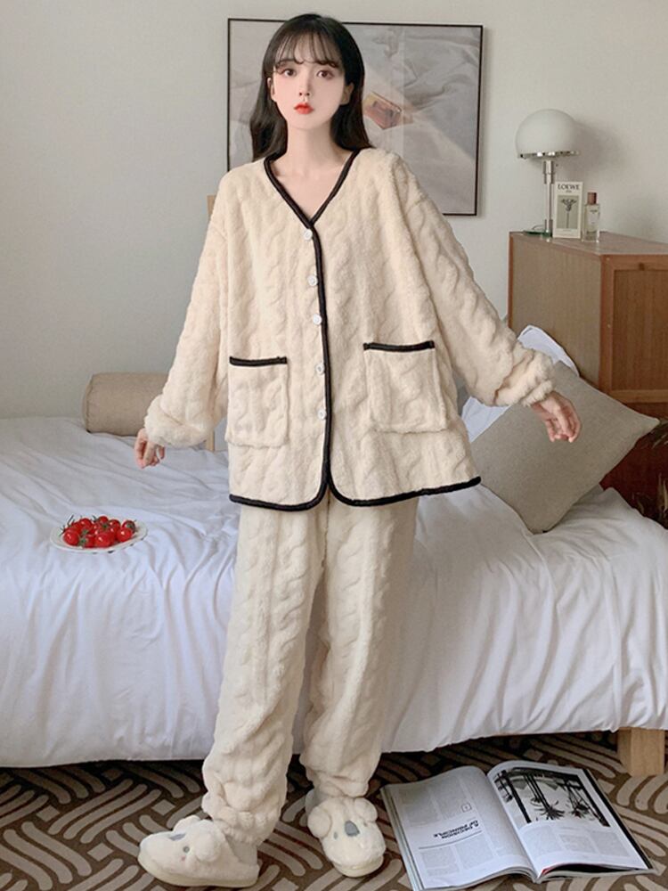 長袖パジャマ 魅せる パジャマ ルームウェア オフホワイト 部屋着 冬新作入荷 リラックス レギュラー丈 袖あり 長袖 Vネック ストレート シングルブレスト ウエストゴム モコモコ 薄手 大人女子 大人 上品 おしゃれ カジュアル レトロ レトロ風 こなれ感 ラフ ルーズ シルエット キュート ガーリー かわいい 女子 ラブリー 無地 秋 冬 10代 20代 レディース 女性用 休日 おうち 着回し 普段使い ファッション コーデ らくちん 暖かい 防寒 スタイル ワンサイズ