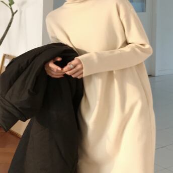 タートルネックがおしゃれなワンピースセーターが入荷しました!白、黒、茶色の無地でシンプルに、でも主役級の存在感がある一着。女性らしい立体感があり、体型をカバーしてくれるので、大人女子には特におすすめです。