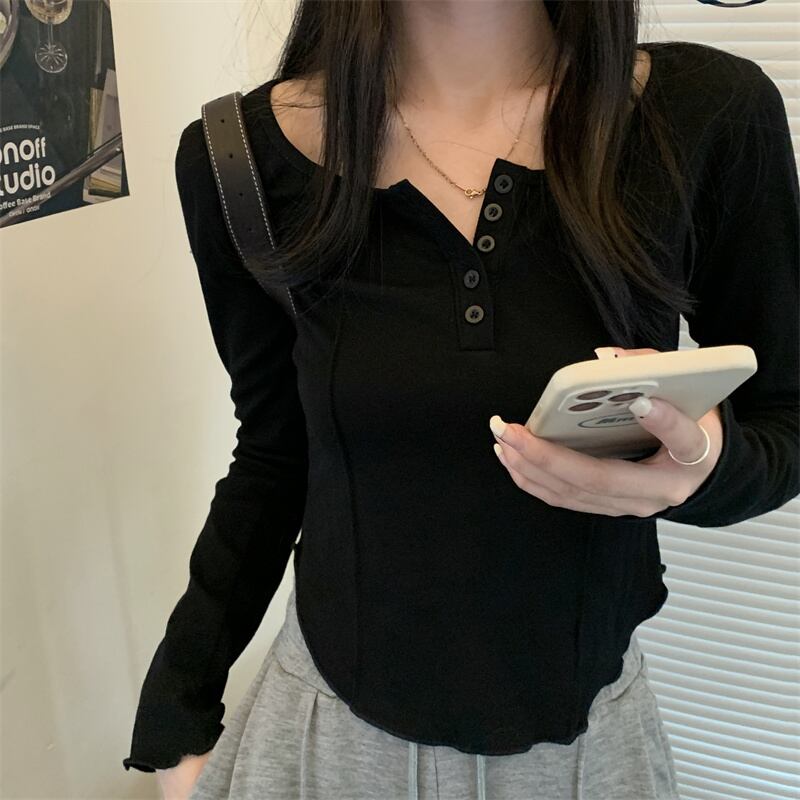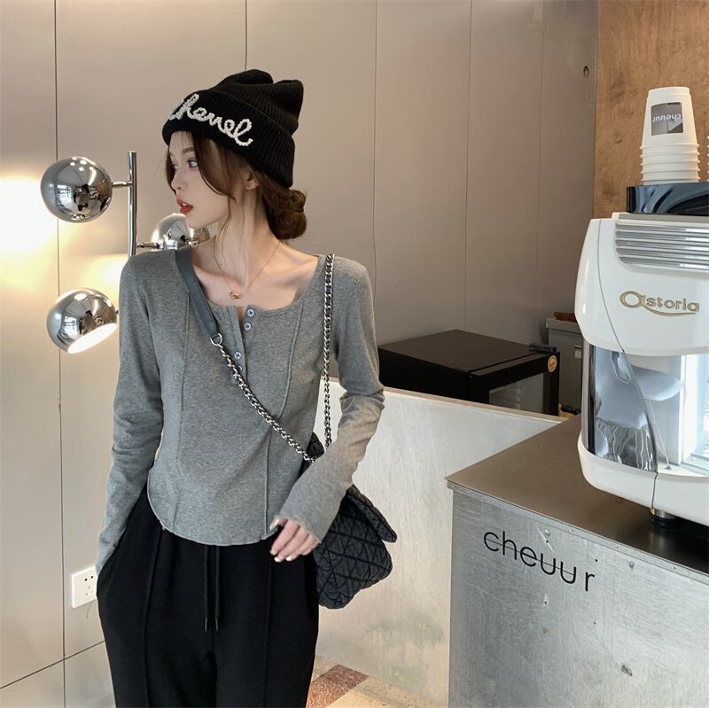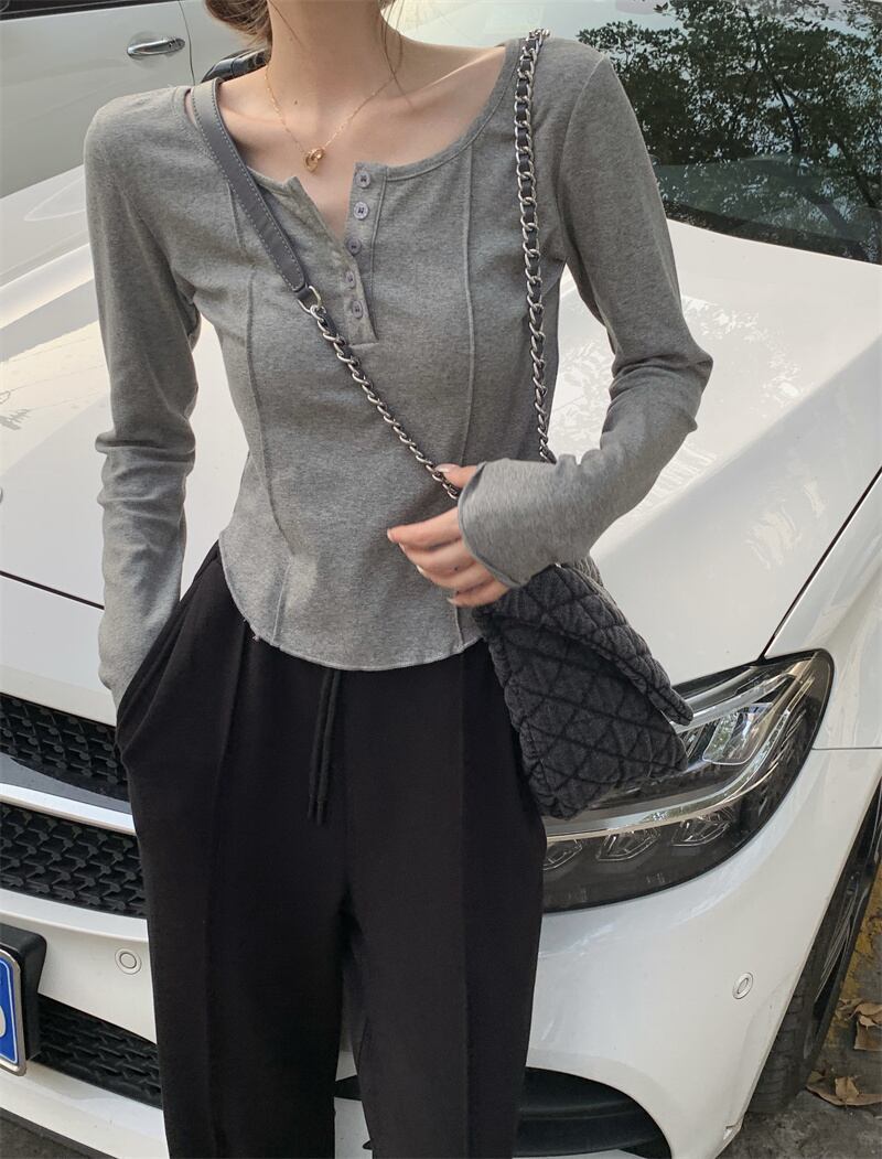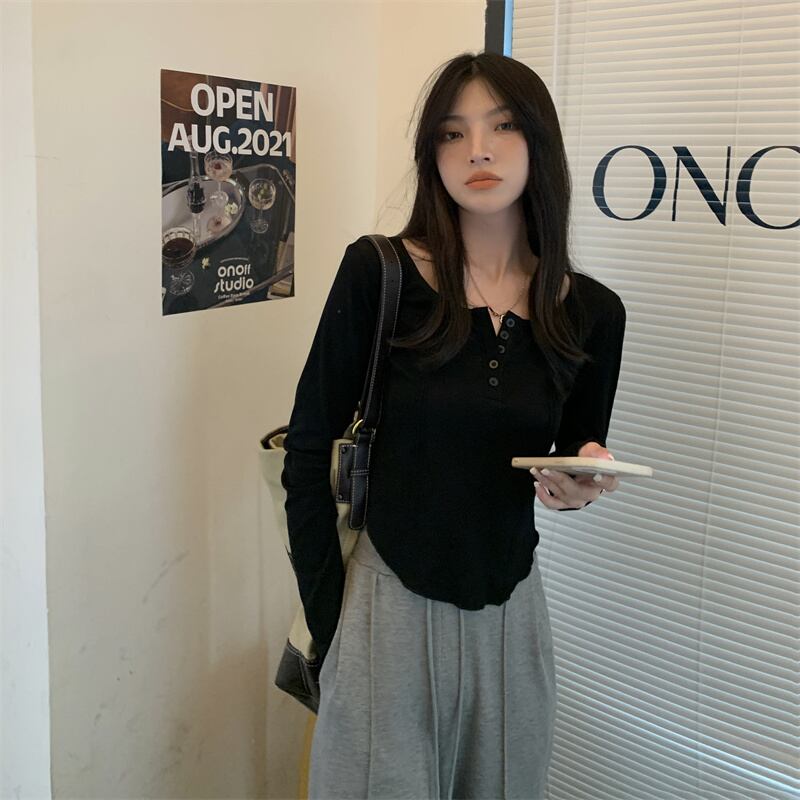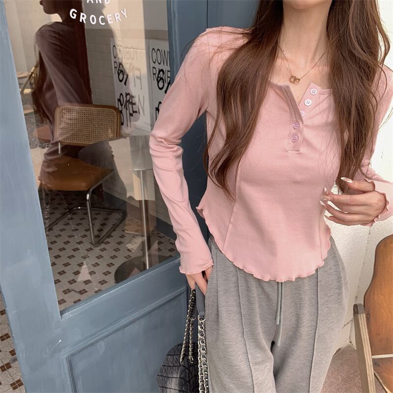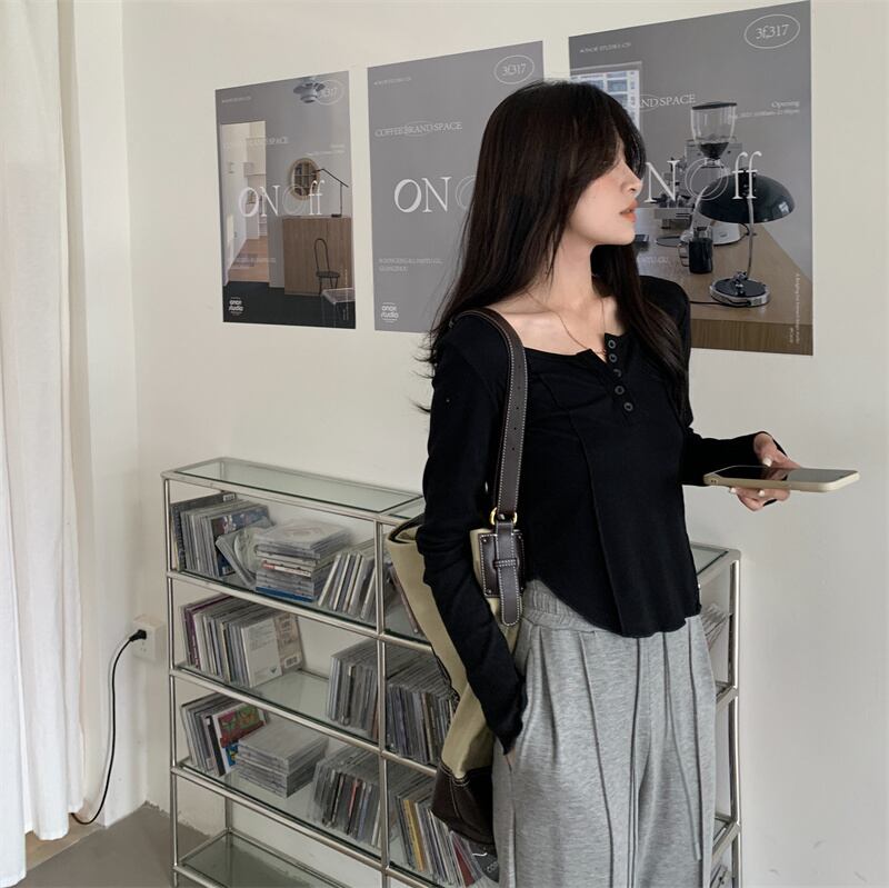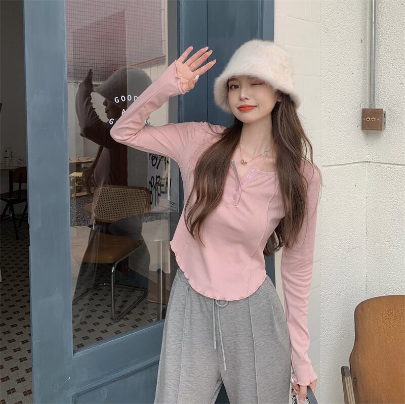ロンT トップス Tシャツ カットソー色展開 韓国流行 黒 ブラック 灰色 グレー ピンク カラバリ ショート ショート丈 長袖 萌袖 ラウンドネック 襟なし スリム ボタン 薄手 かわいい 大人可愛い シンプル カジュアル おしゃれ お洒落 大人可愛い 大人女子 こなれ感 ラフ スポーティー 個性的 抜け感 ピュア 無地 春 秋 冬 2021 10代 20代 レディース 学生 通学 デート お出かけ 女子会 休日 旅行 着回し 普段使い 重ね着 ファッション コーデ スタイル 楽ちん トレンド