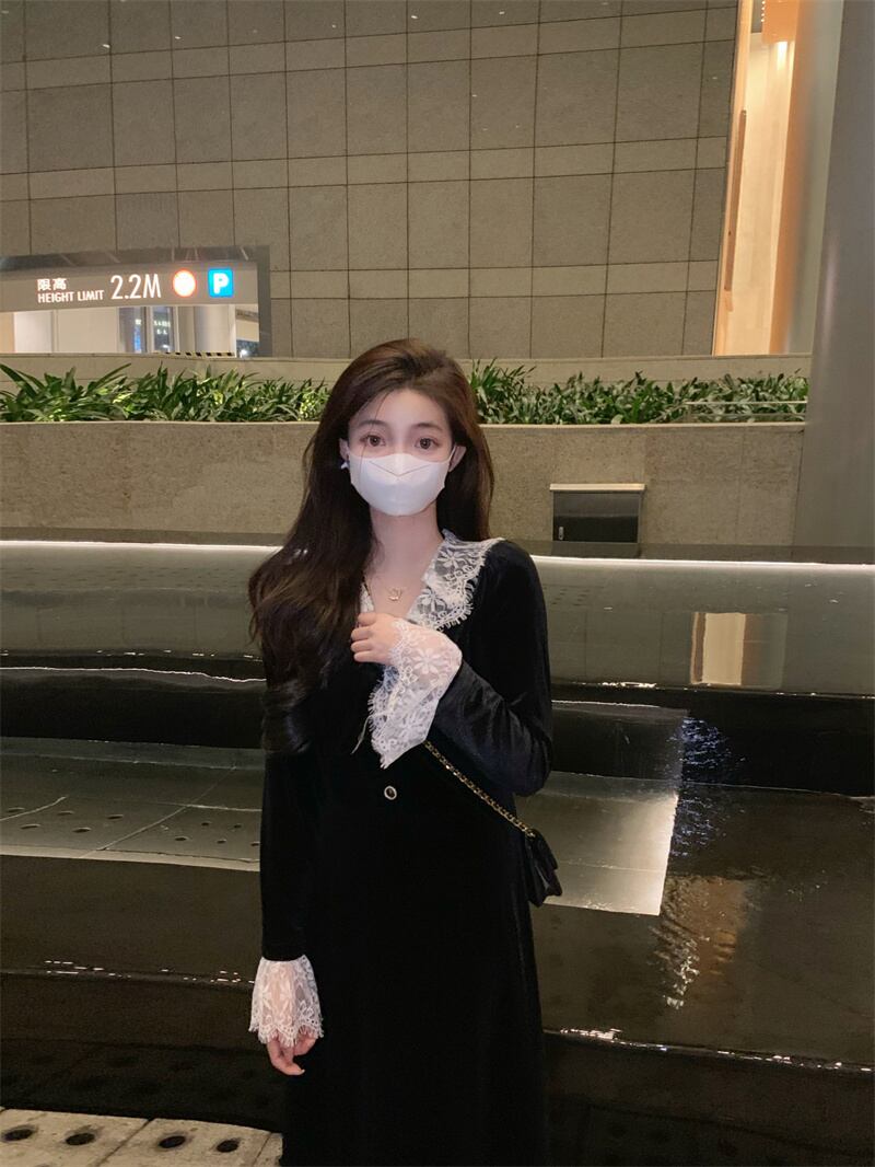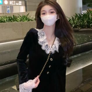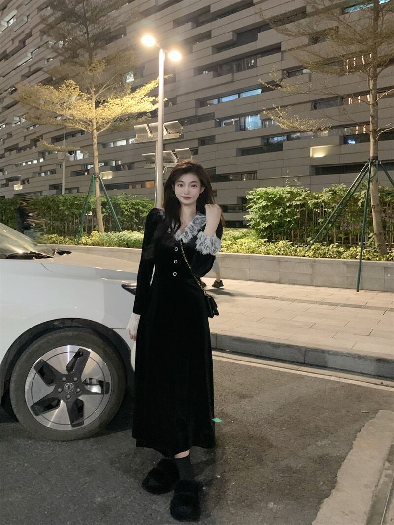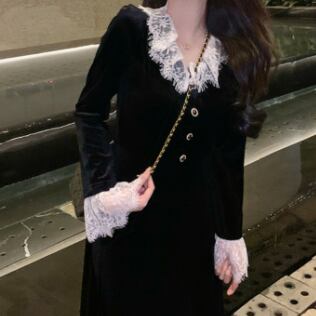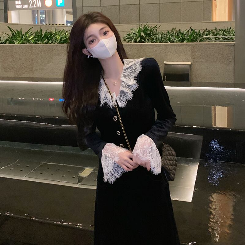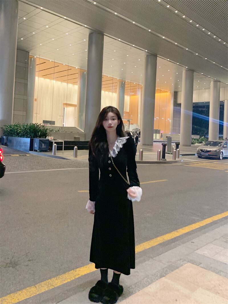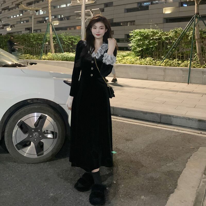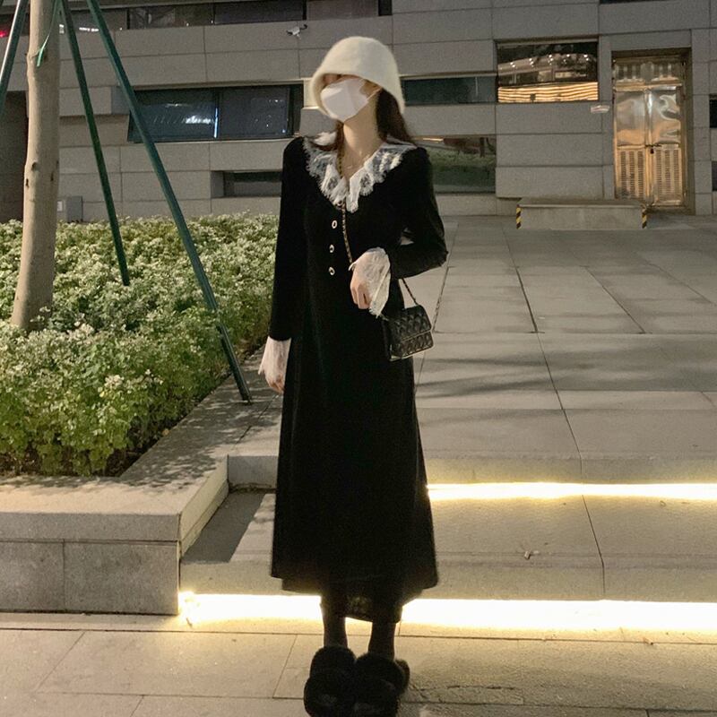 ワンピース ロング丈 長袖 襟付き レース 黒 ブラック かわいい 韓国ファッション 大人可愛い きれいめ シンプル カジュアル 大人 上品 おしゃれ お洒落 大人可愛い 大人女子 こなれ感 ラフ メンズライク キュート 個性的 主役級 存在感 抜け感 無地 秋 冬 10代 20代 レディース 学生 通学 デート お出かけ 女子会 お泊まり 休日 普段使い ファッション コーデ スタイル 楽ちん 暖かい 防寒 モテ 美脚 脚長 送料無料 トレンド 流行 インスタ映え S M L ゆったり