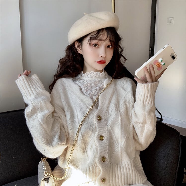 女の子らしいガーリーなニットカーディガンです。