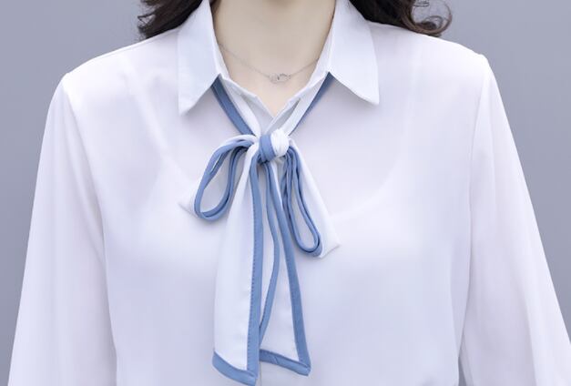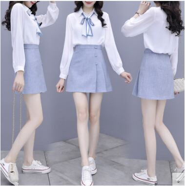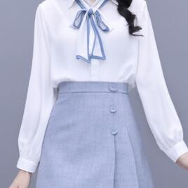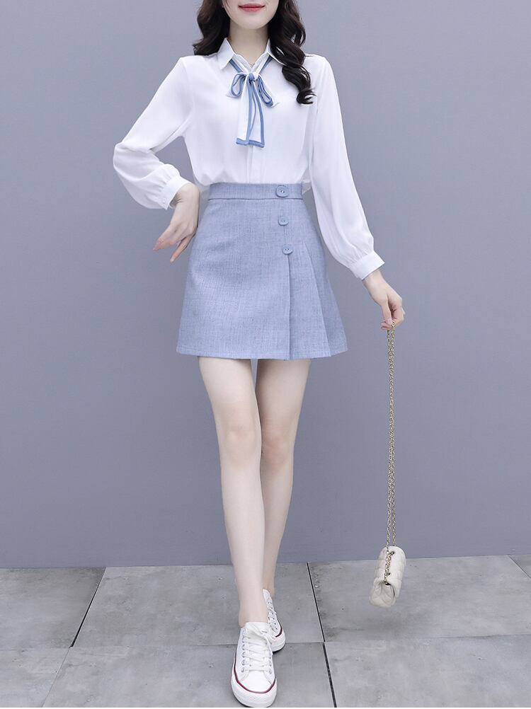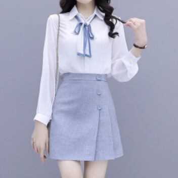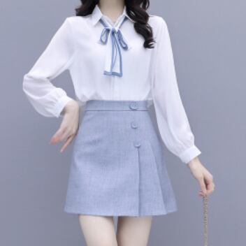 シフォンシャツ×ショートスカートのツーピーススーツ