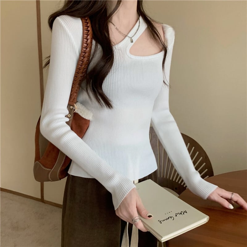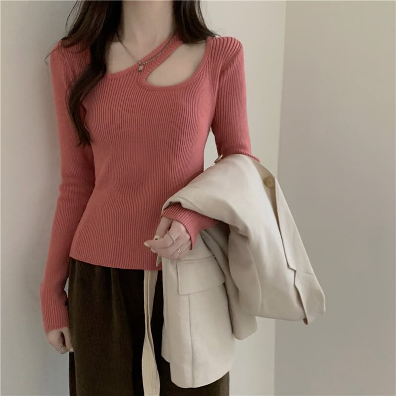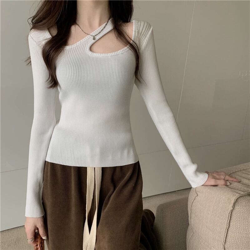 くり抜きデザインのスリムニットセーター