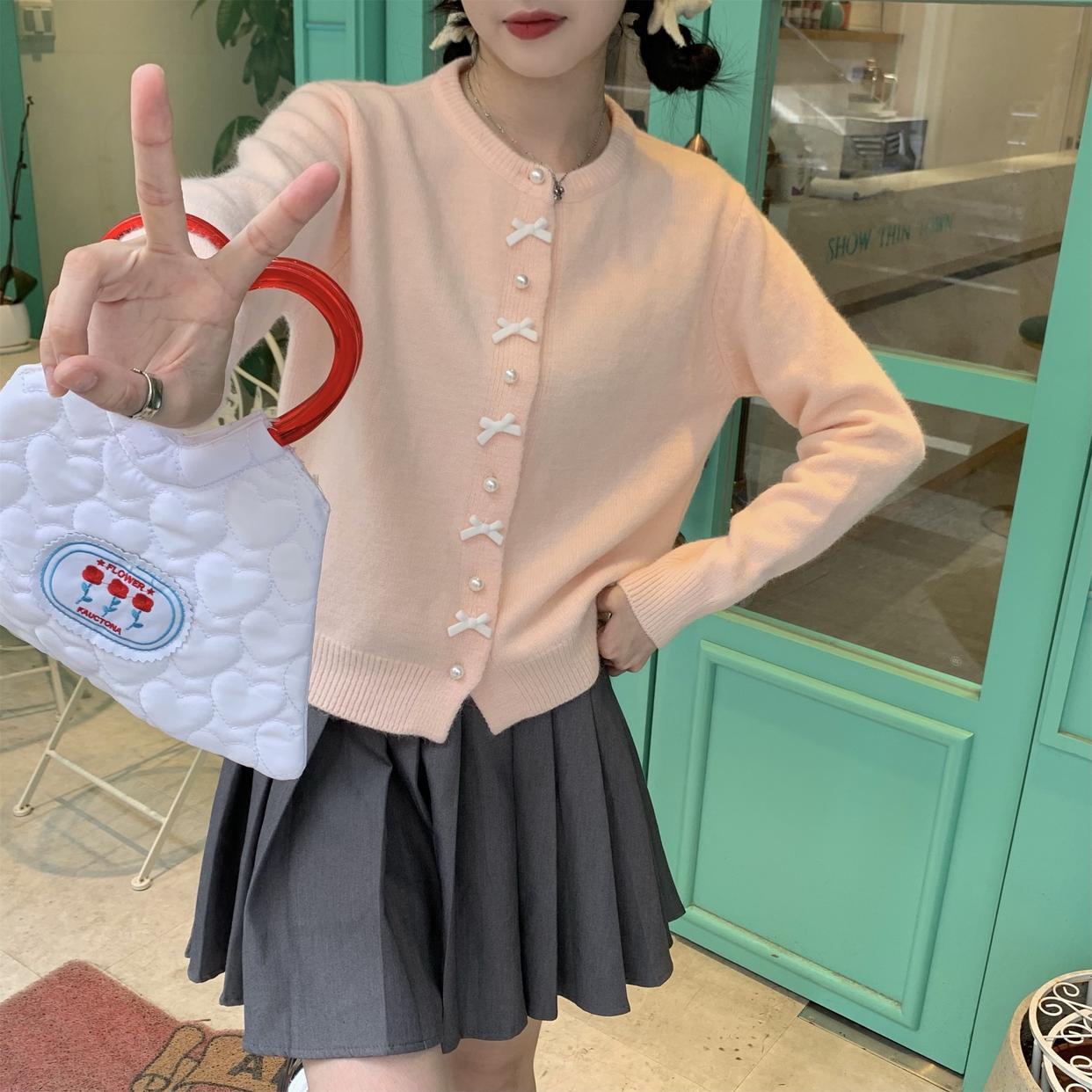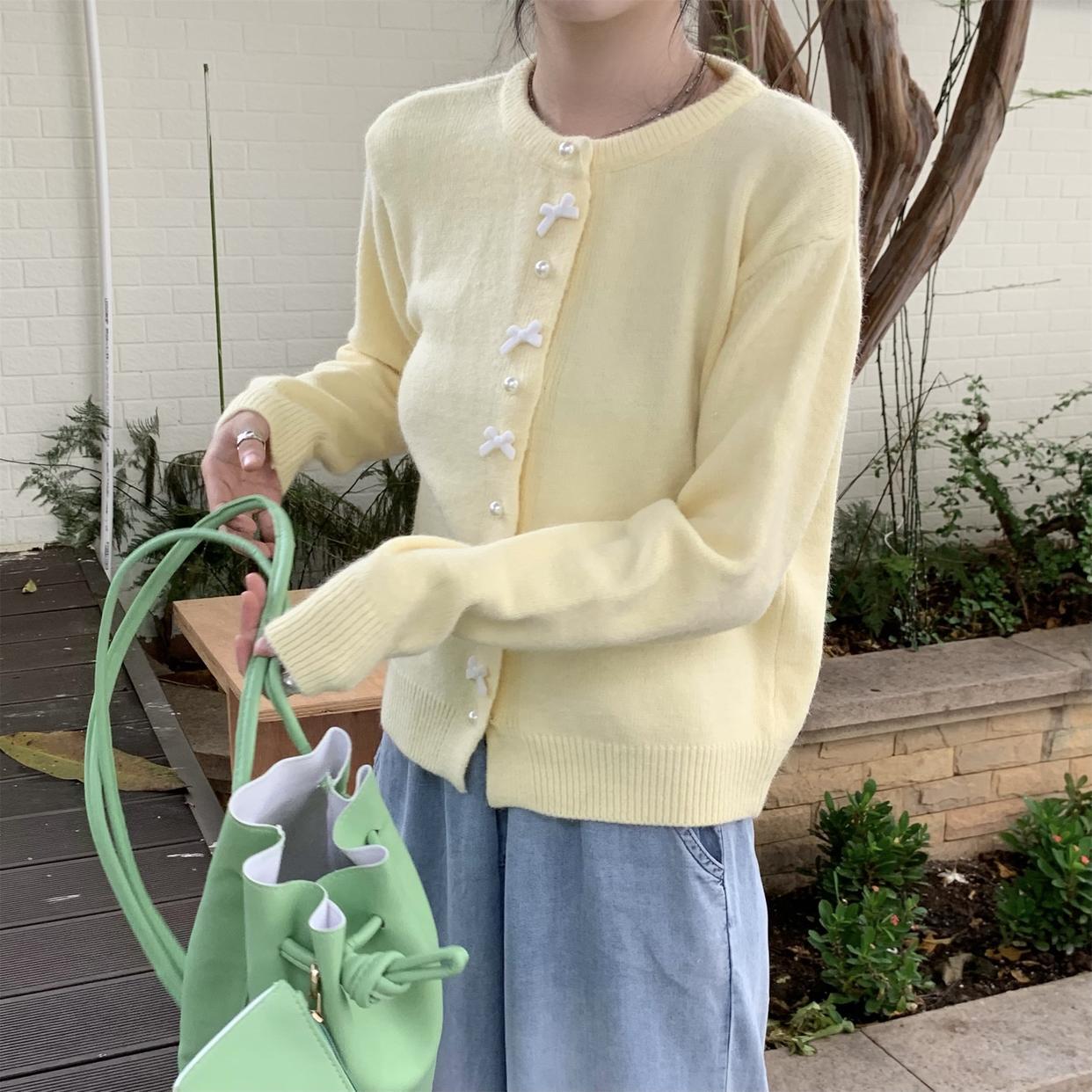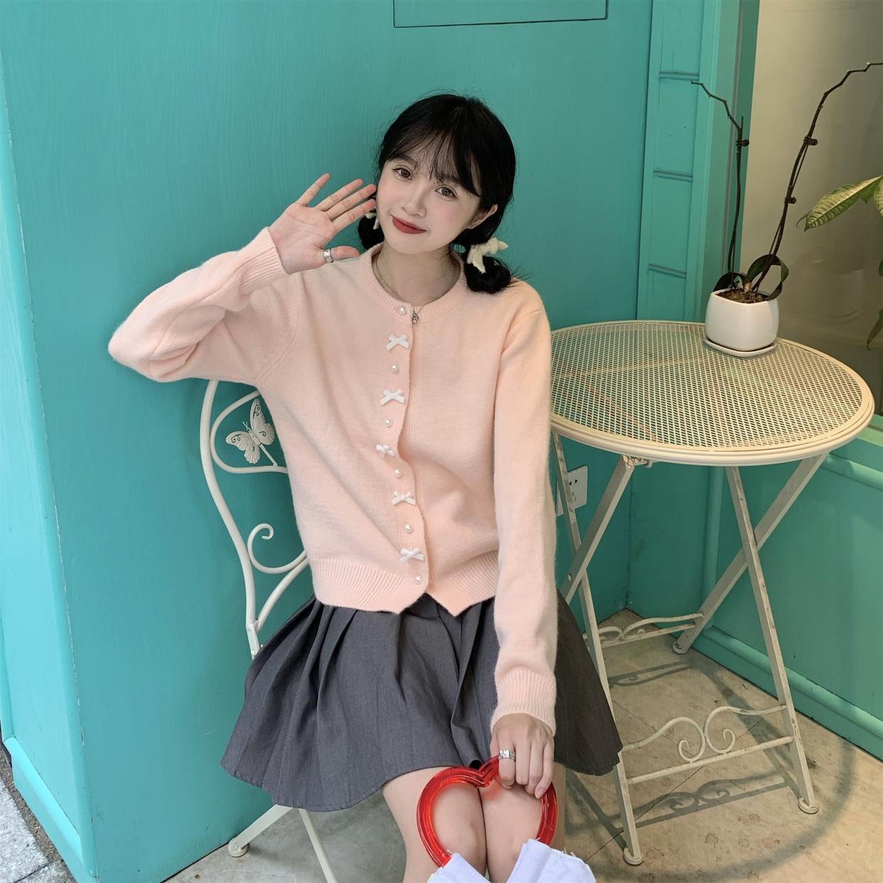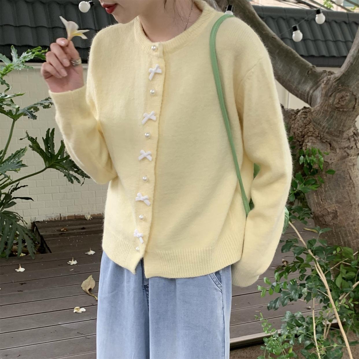 パールボタンとリボンの飾りがかわいいニットカーディガン