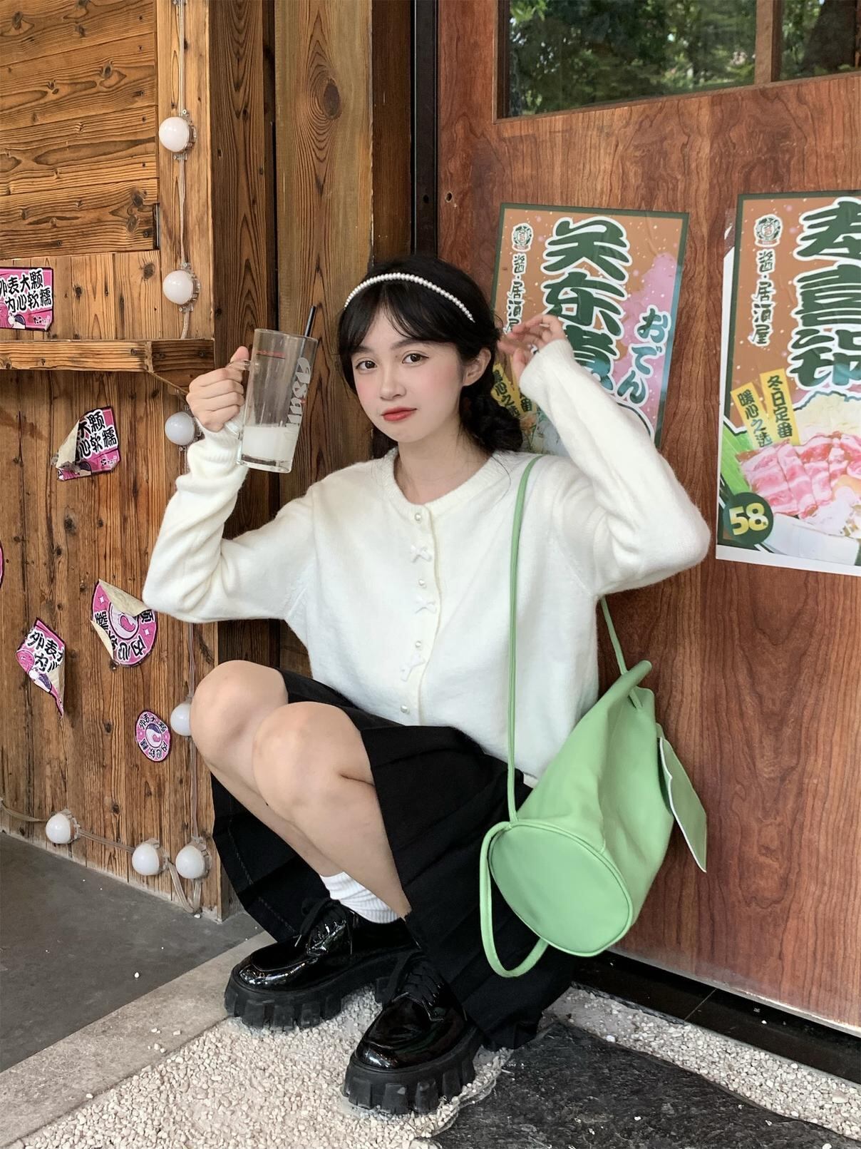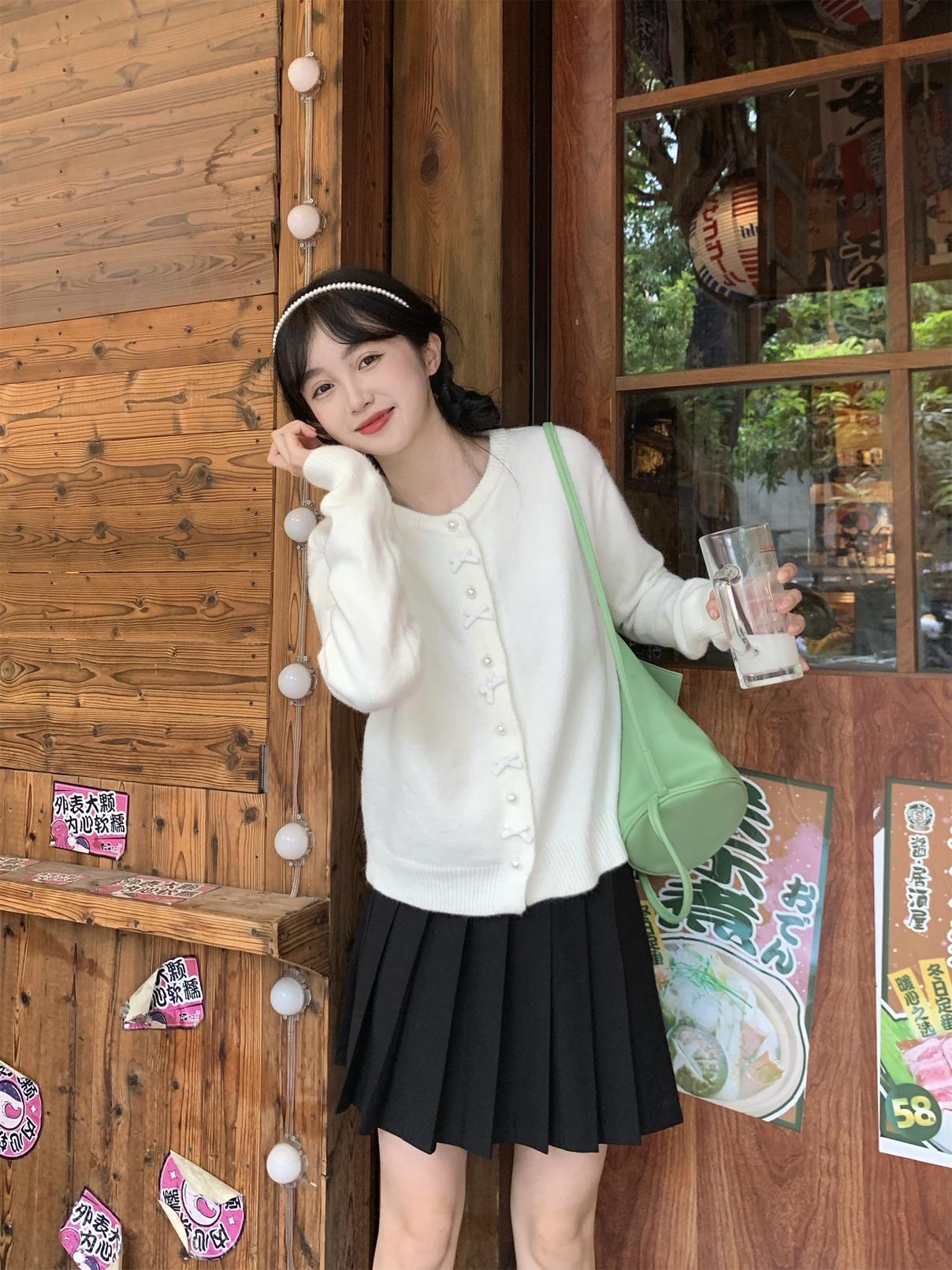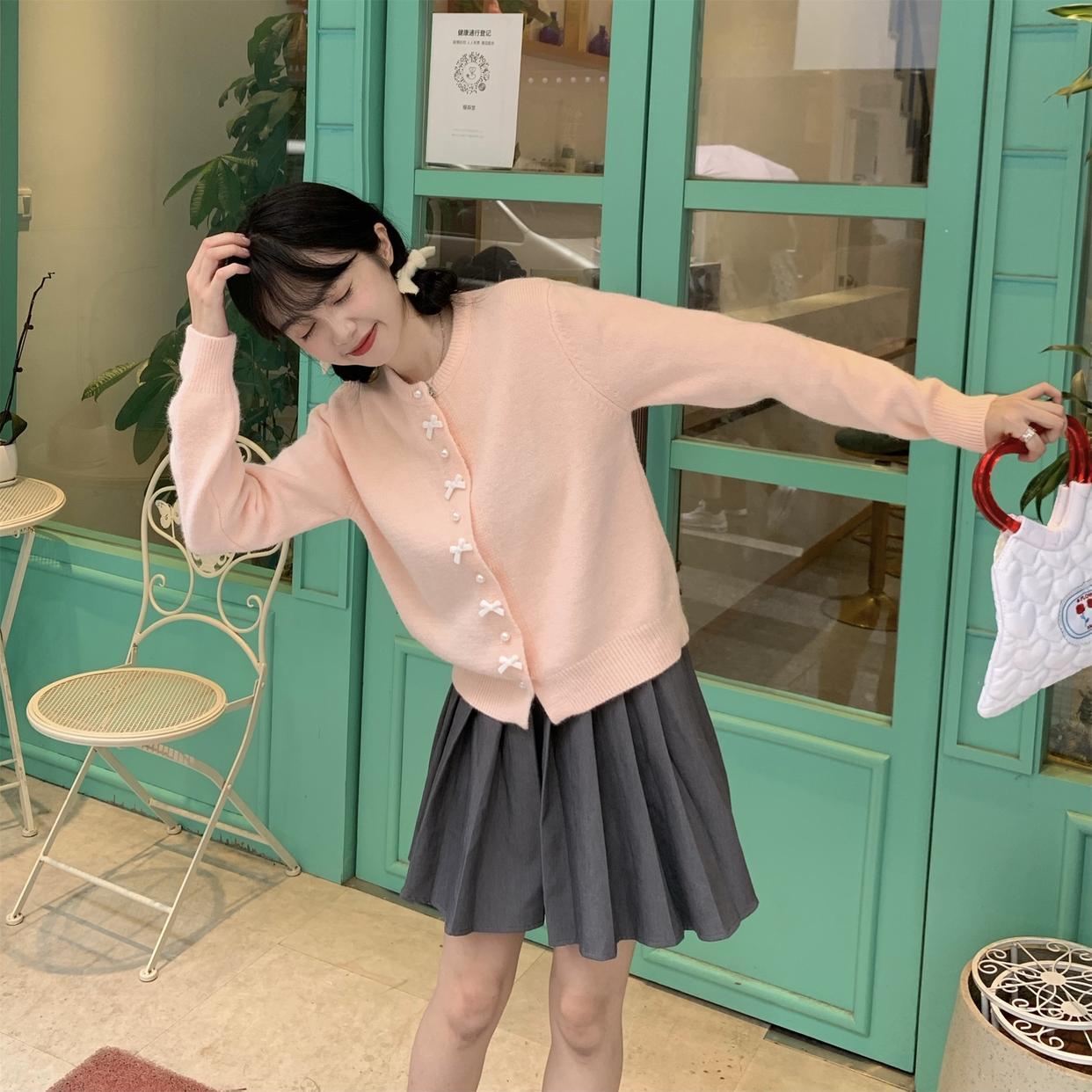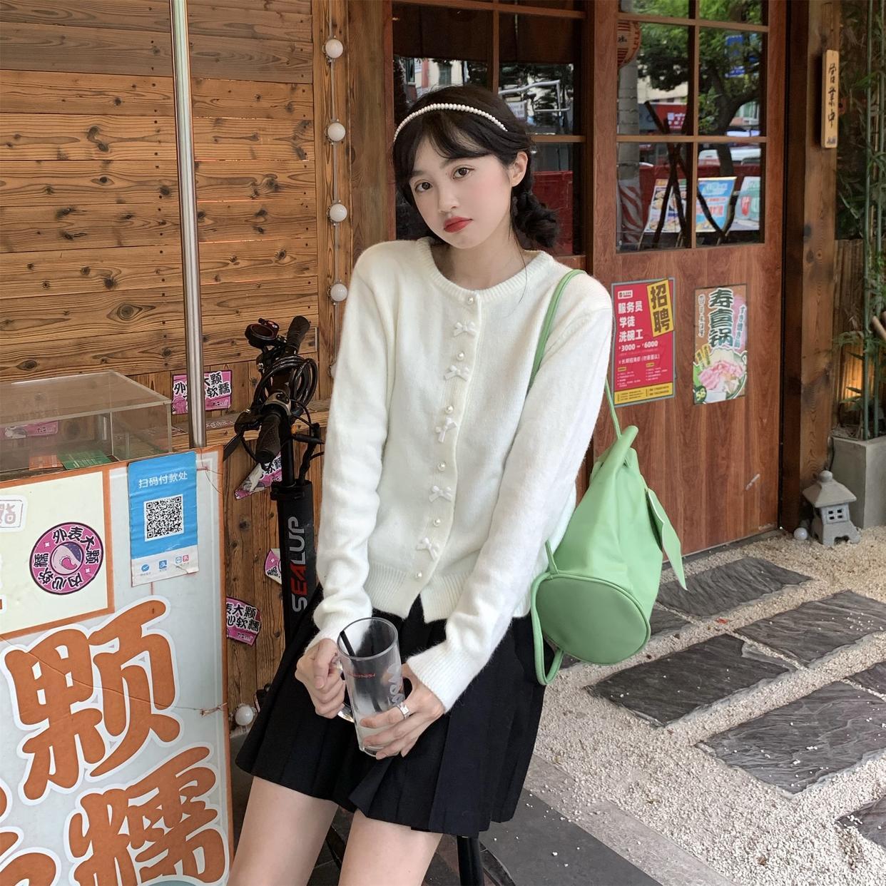 パールボタンとリボンの飾りがかわいいニットカーディガン