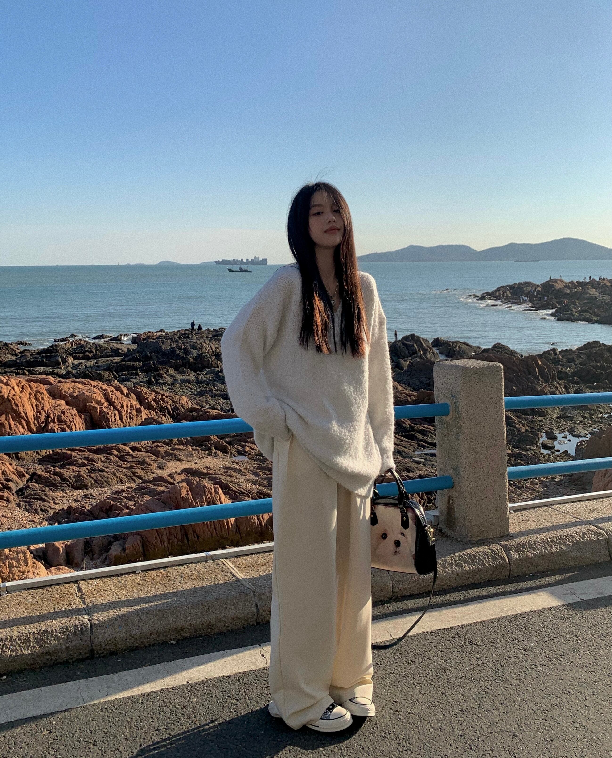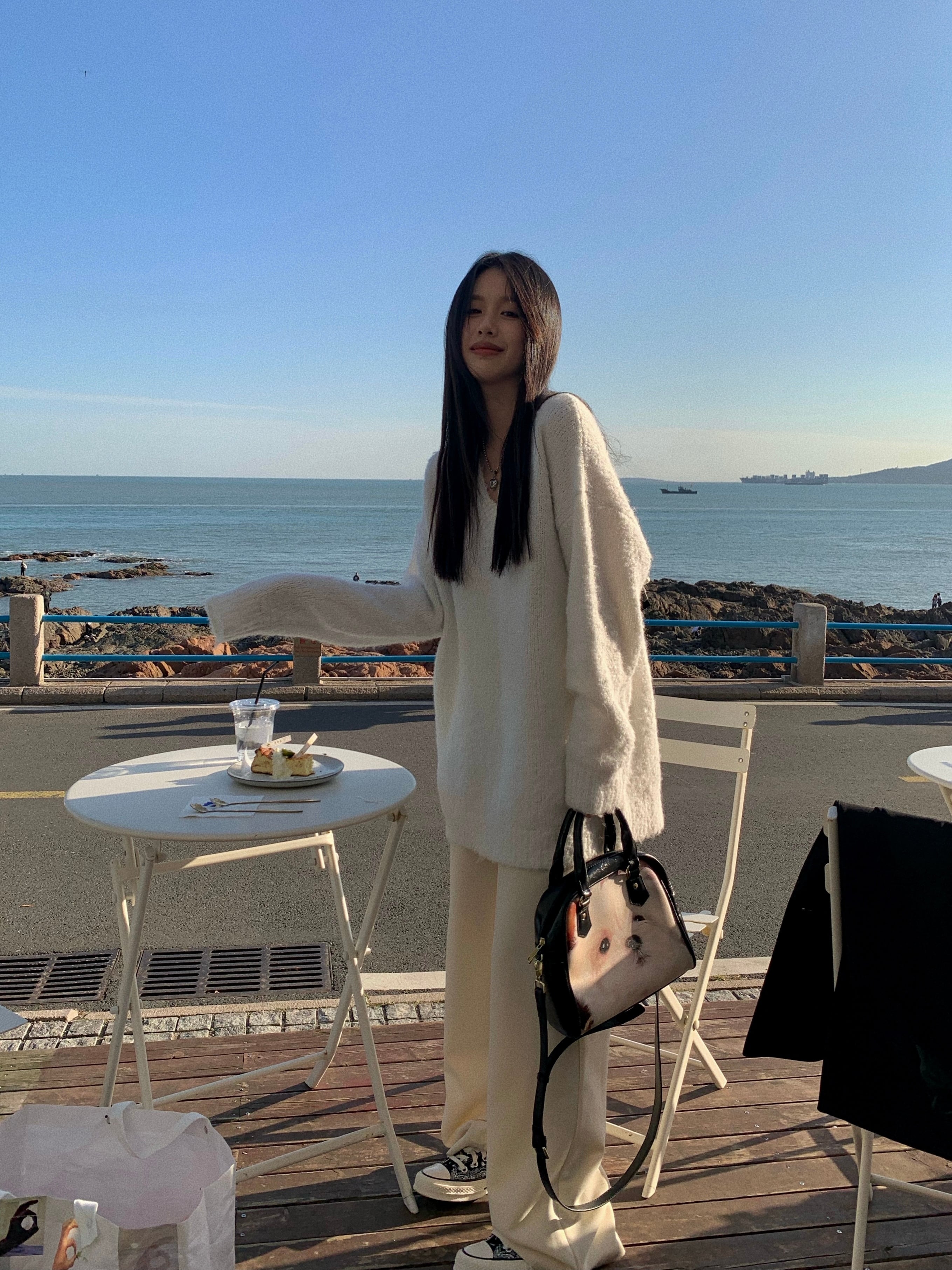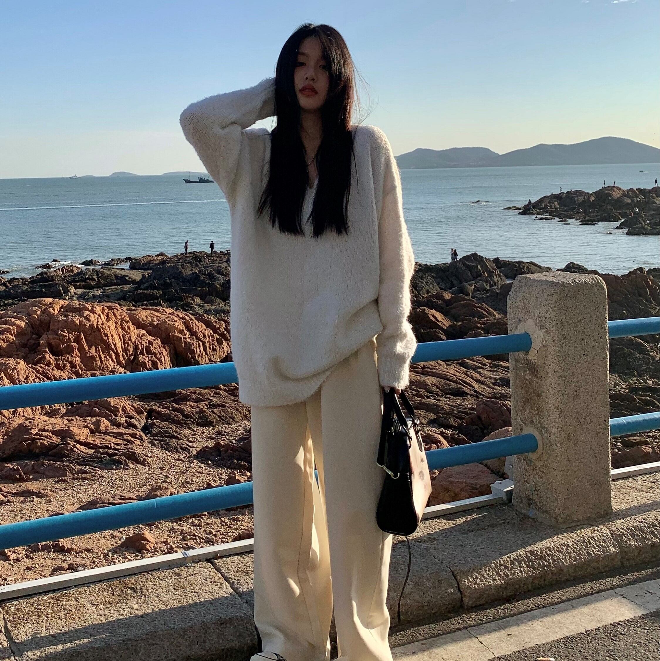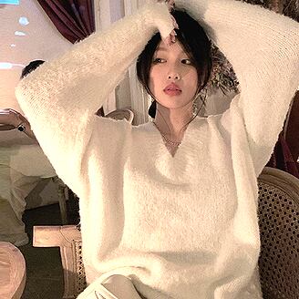 セーター トップス ミディアム丈 長袖 萌袖 Vネック 白 ホワイト 韓国ファッション 襟なし もこもこ ふわふわ かわいい きれいめ シンプル カジュアル 大人 おしゃれ 大人可愛い 大人女子 こなれ感 ラフ ルーズ 存在感 とろみ感 抜け感 ピュア 無地 春 秋 冬 クリスマス バレンタイン 2021 10代 20代 30代 レディース OL 通勤 学生 通学 デート お出かけ 女子会 お泊まり 休日 旅行 着回し 普段使い 重ね着 ファッション 暖かい プチプラ トレンド 着やせ効果 フリーサイズ