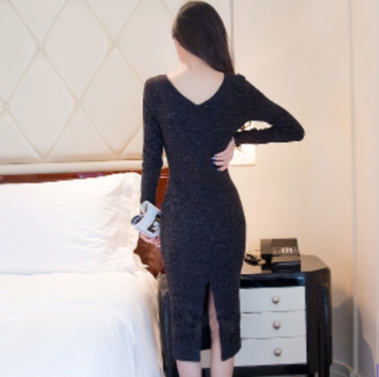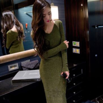 ニットワンピース 魅せる ワンピース 韓国流行 ロングワンピース ブラック 黒 グリーン 緑 ミディアム丈 袖あり 長袖 Vネック スリム 細身 スリット カシミア 大人女子 大人 上品 おしゃれ かっこいい クール きれいめ シンプル モード系 エレガント レトロ レトロ風 こなれ感 ラフ 主役級 存在感 無地 秋 冬 20代 30代 40代 レディース 女性用 デート お出かけ 女子会 着回し 普段使い トレンド ファッション コーデ S M L 大人カラー