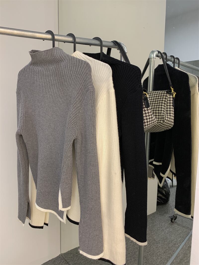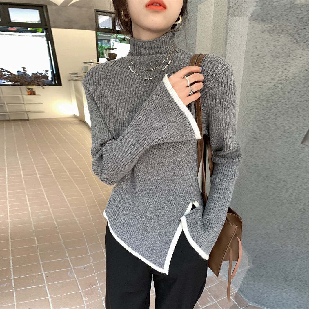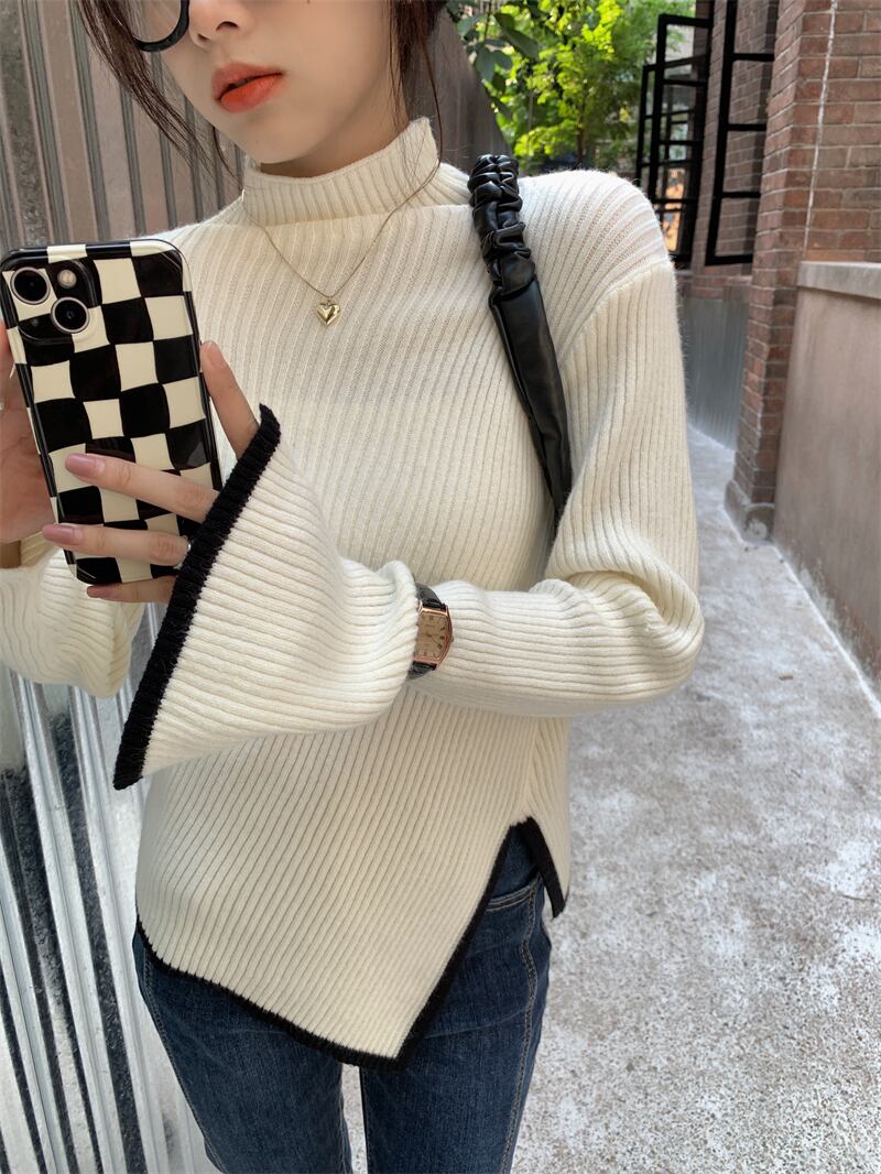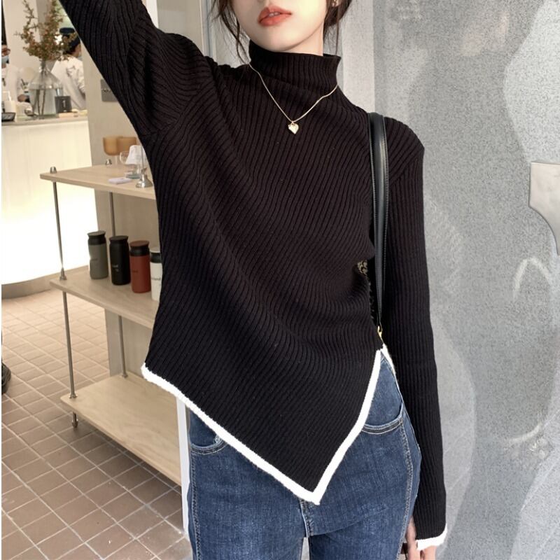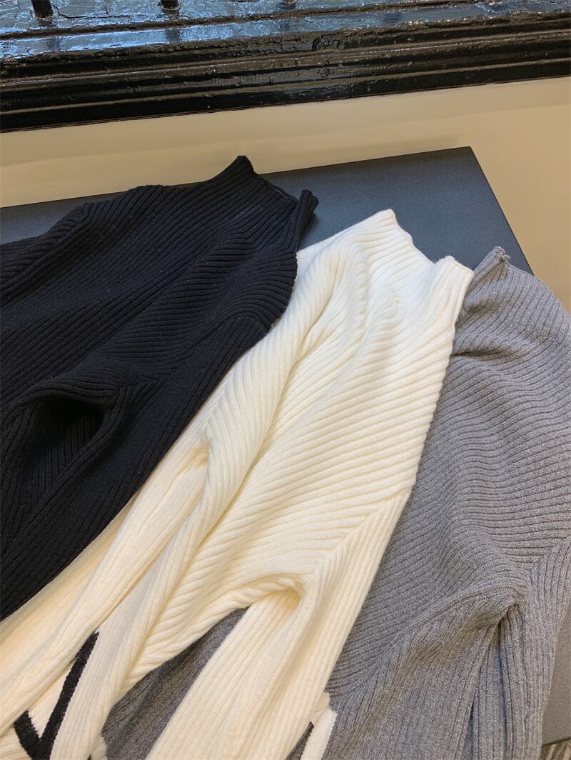 カットソー 技あり トップス ニットソー ブラック 韓国流行 黒 ホワイト 白 グレー 灰色 レギュラー丈 袖あり 長袖 ハイネック スリム ストレート アシンメトリー スリット 大人女子 大人 上品 おしゃれ かっこいい クール モード系 カジュアル レトロ レトロ風 こなれ感 ラフ 個性的 デザイン 主役級 存在感 無地 配色 秋 冬 10代 20代 30代 レディース 女性用 学生 通学 デート お出かけ 女子会 着回し 普段使い ワンサイズ モノトーン バイカラー ツートーンカラー