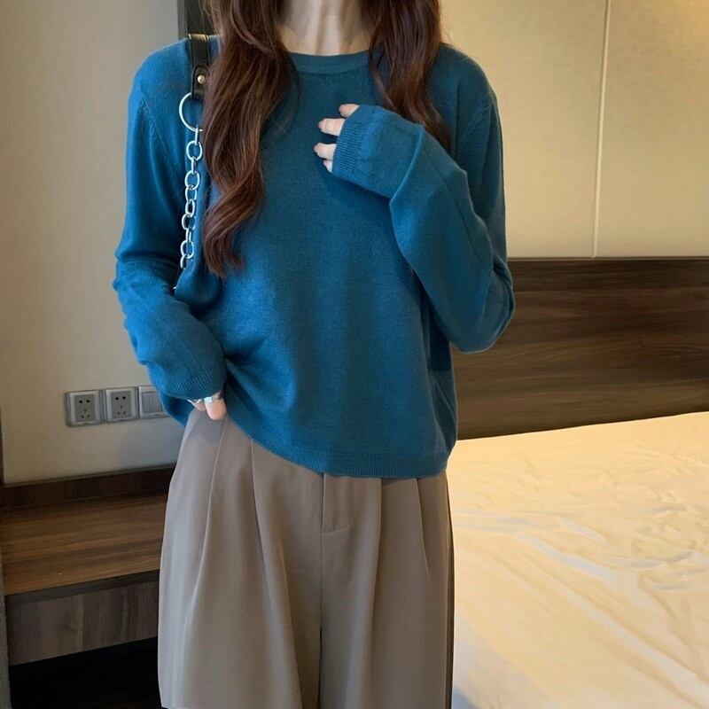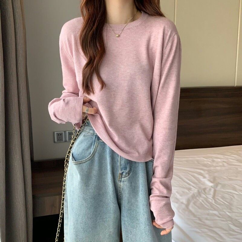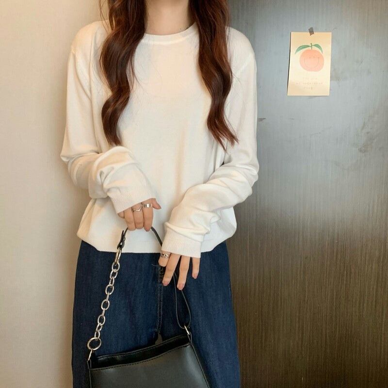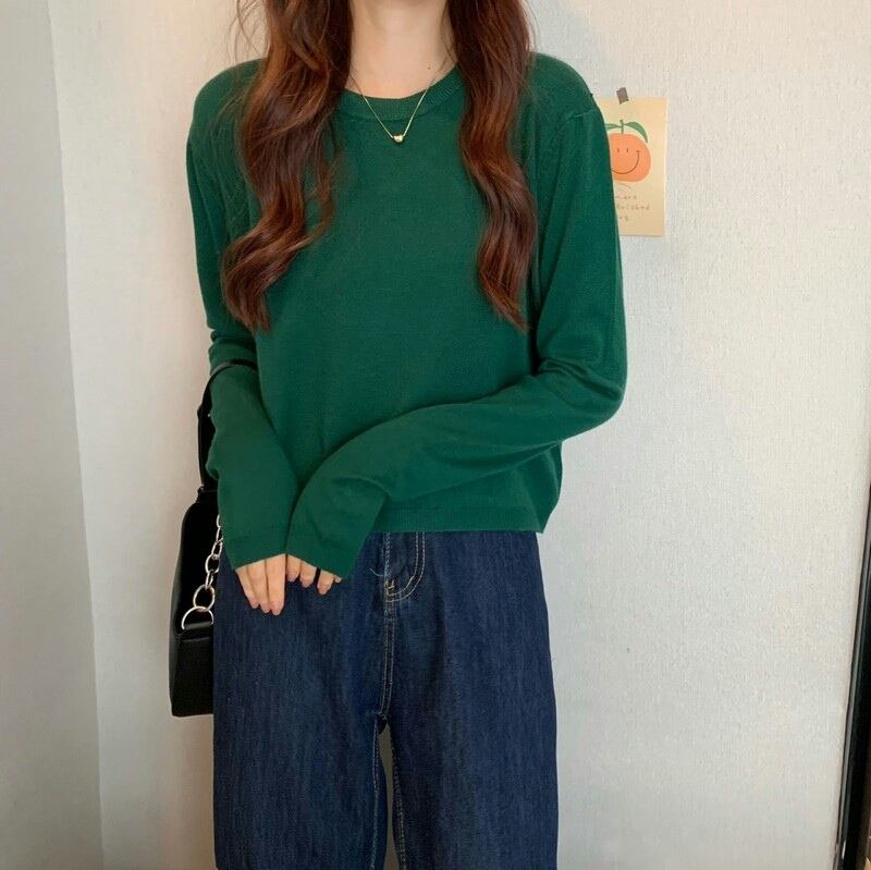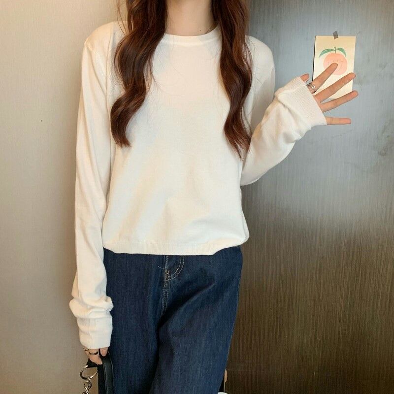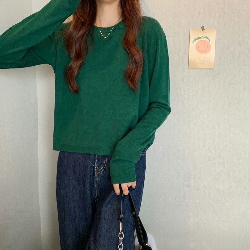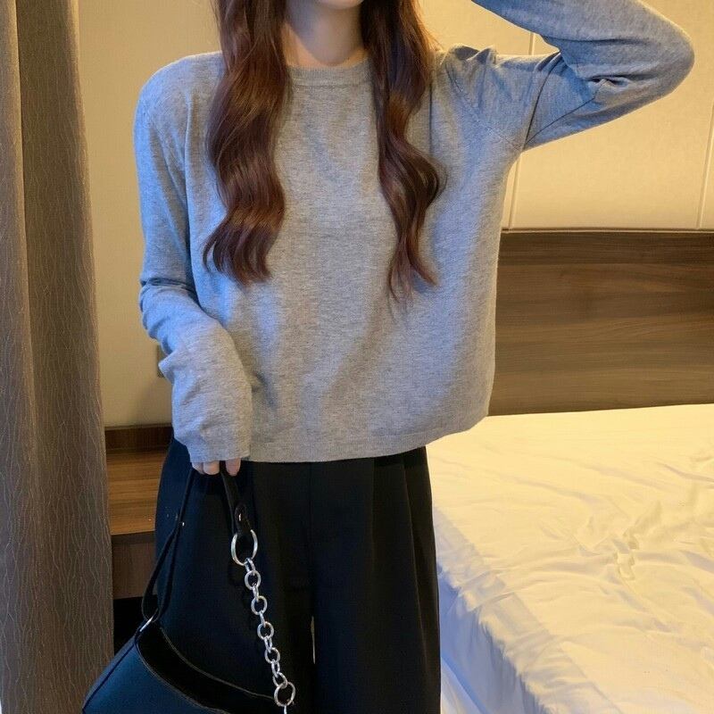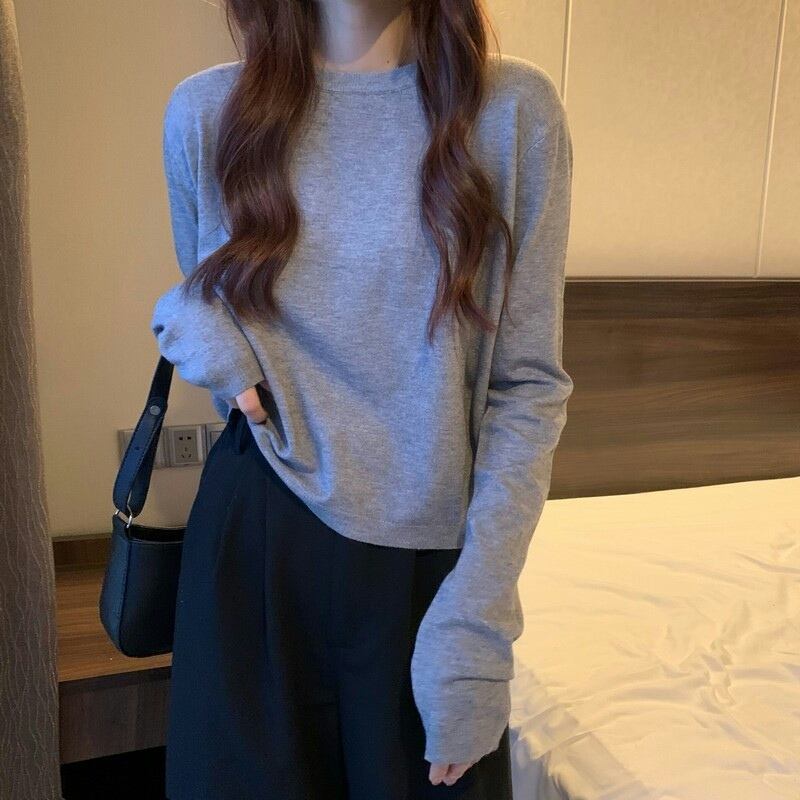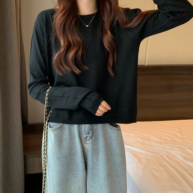 ショート丈ニット シンプル トップス 韓国流行 カットソー ニットソー ブラック 黒 ホワイト 白 グレー 灰色 ブルー 青 ピンク グリーン 緑 ショート丈 袖あり 長袖 ラウンドネック 大人女子 大人 上品 おしゃれ かっこいい クール カジュアル レトロ レトロ風 こなれ感 ラフ ルーズ シルエット 主役級 存在感 無地 春 スプリング 秋 オータム 冬 ウインター 10代 20代 30代 レディース 女性用 学生 通学 デート お出かけ 女子会 着回し 普段使い ワンサイズ