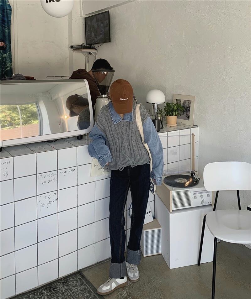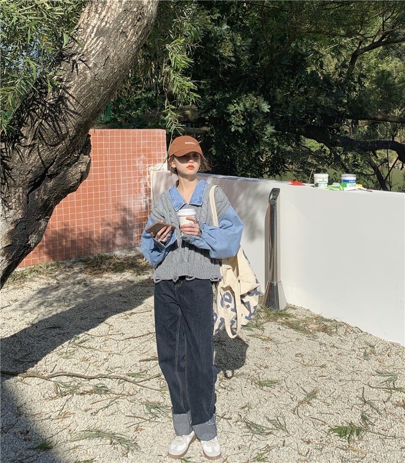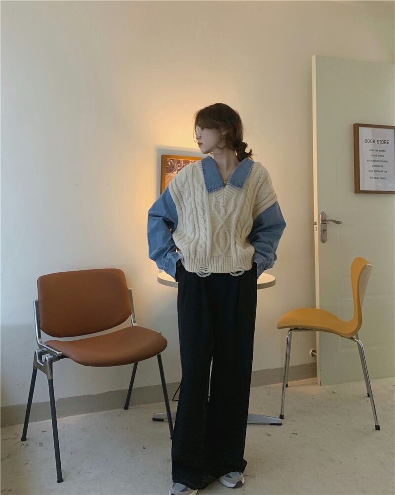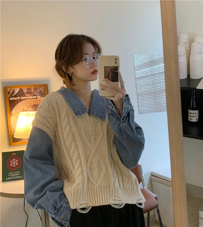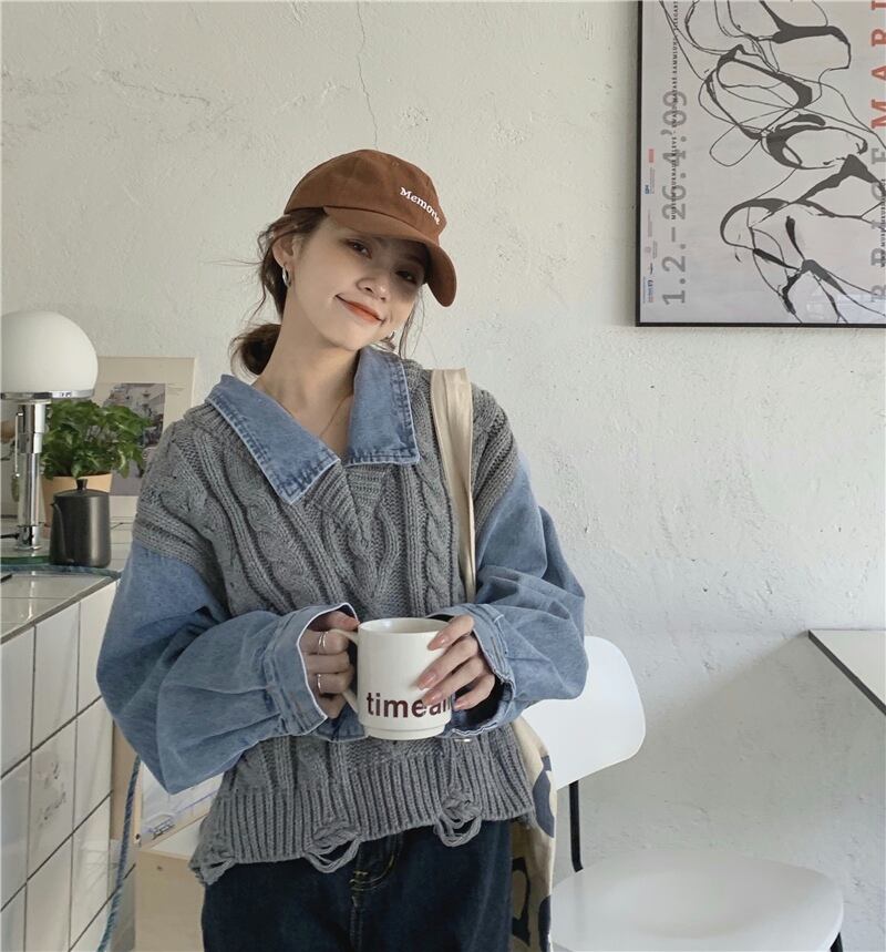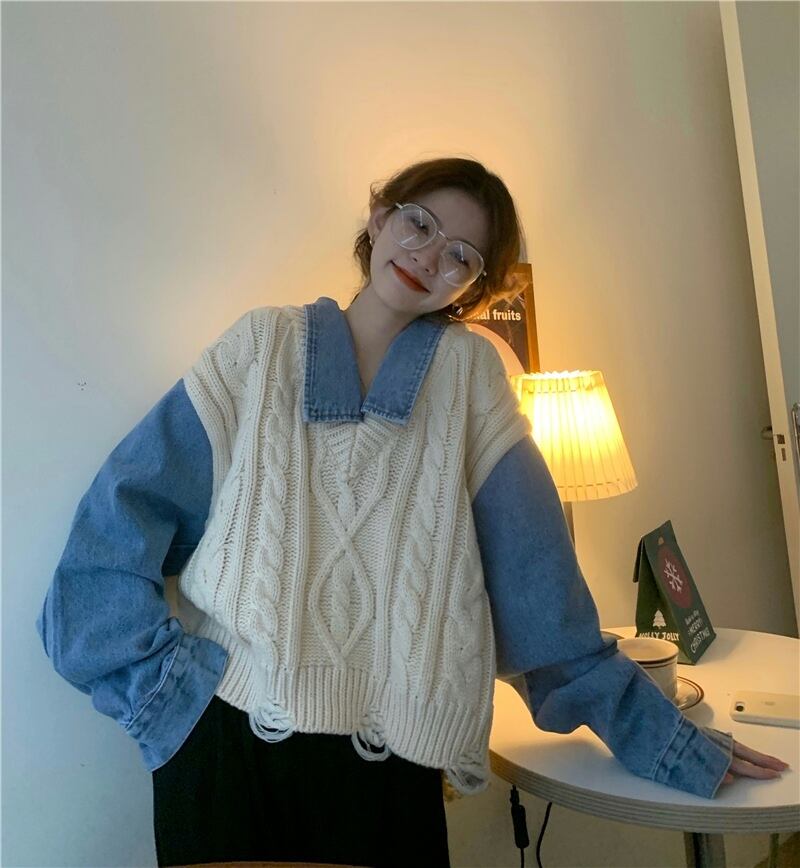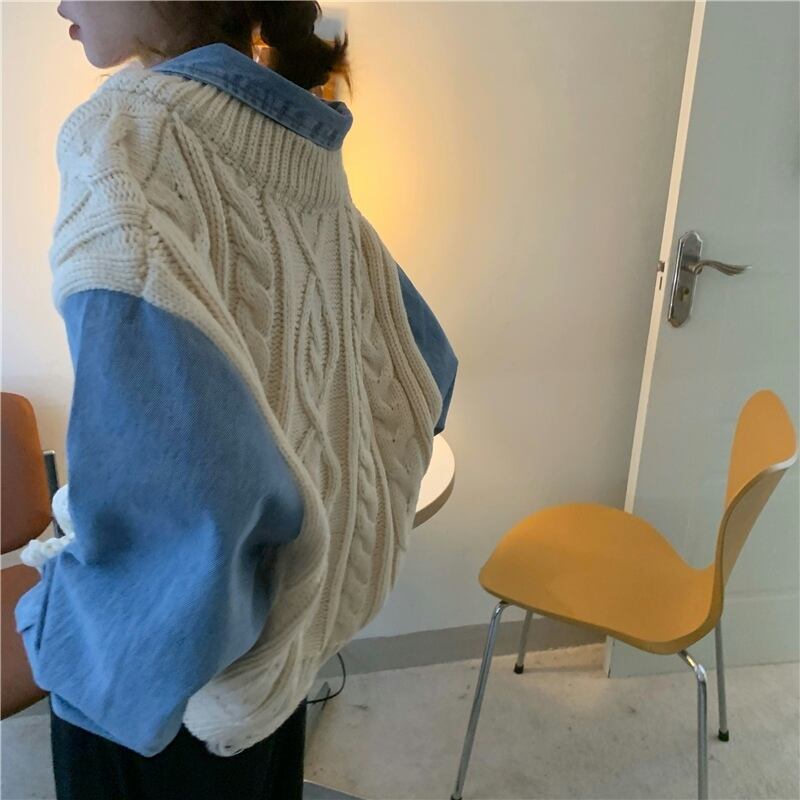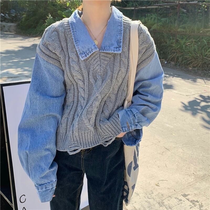 重ね着風 異素材MIX グレー オフホワイト 韓国流行 灰色 白 デニム ゆる だぼ トップス シャツ セーター 袖あり 長袖 ボリューム袖 萌袖 襟付き ワイド かわいい 大人可愛い シンプル カジュアル 大人 おしゃれ お洒落 大人女子 こなれ感 キュート 主役級 存在感 春 秋 2021 レディース 女性用 学生 デート お出かけ 女子会 イベント 旅行 着回し 普段使い 休日 定番 体型カバー 韓国系 オルチャン 楽ちん モテ トレンド 流行 インスタ映え おすすめ インポート フリーサイズ