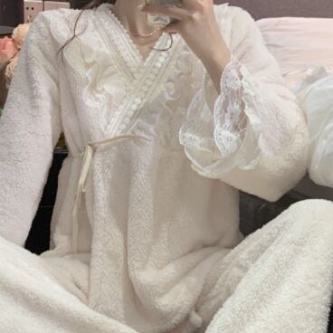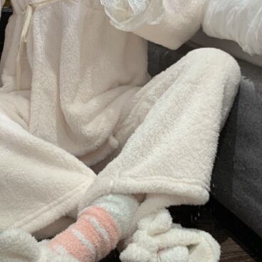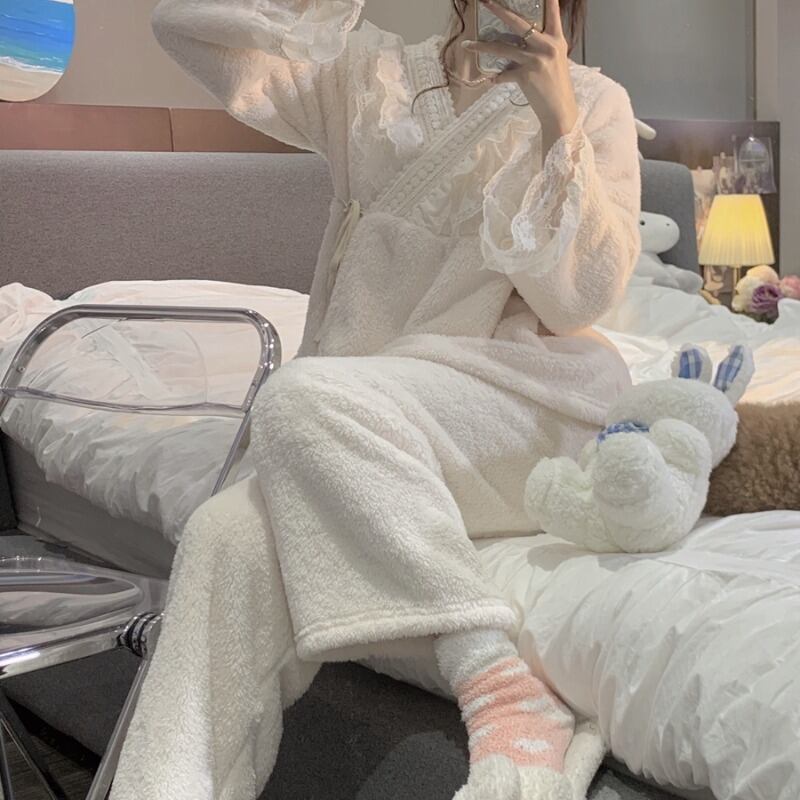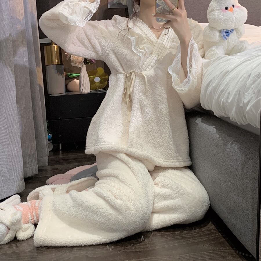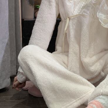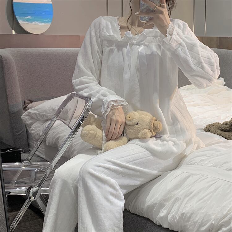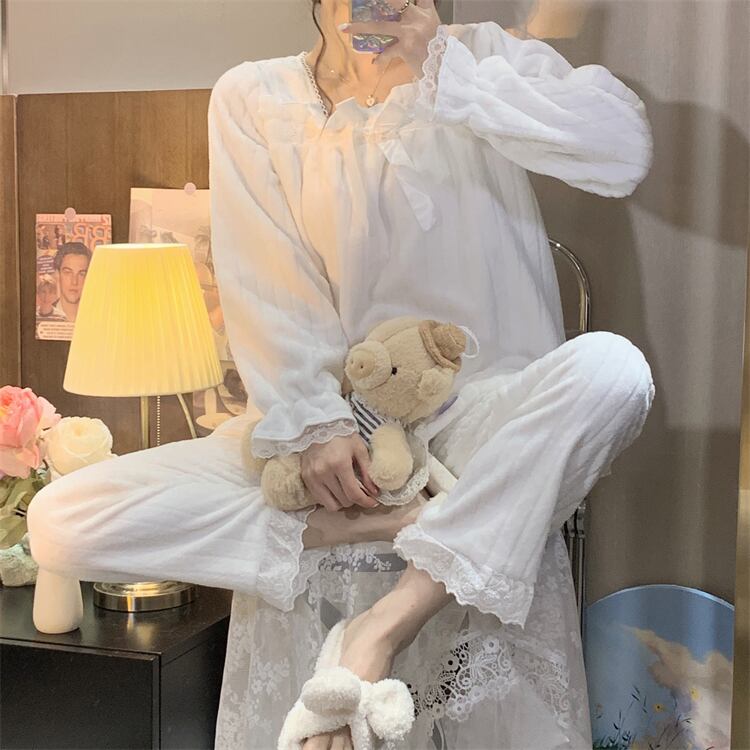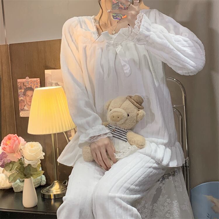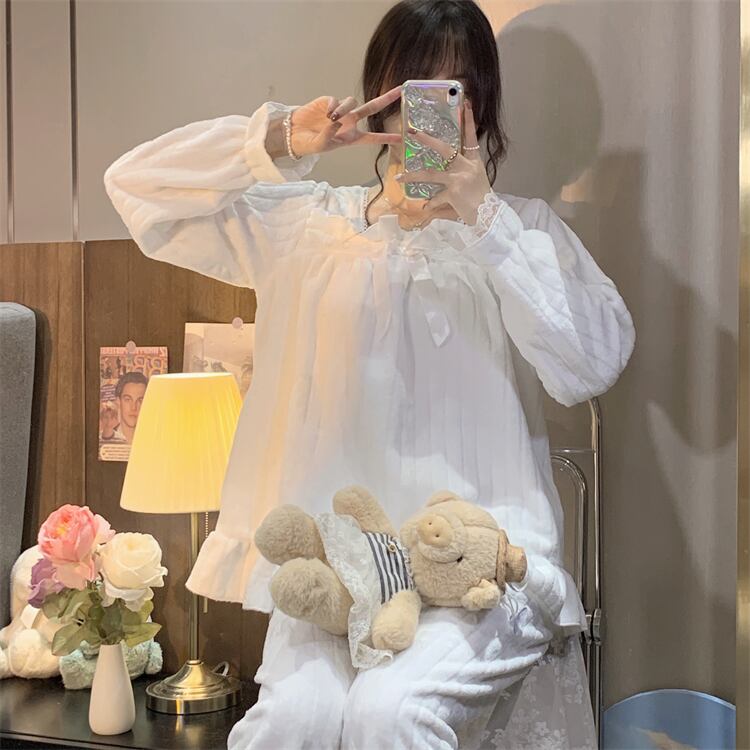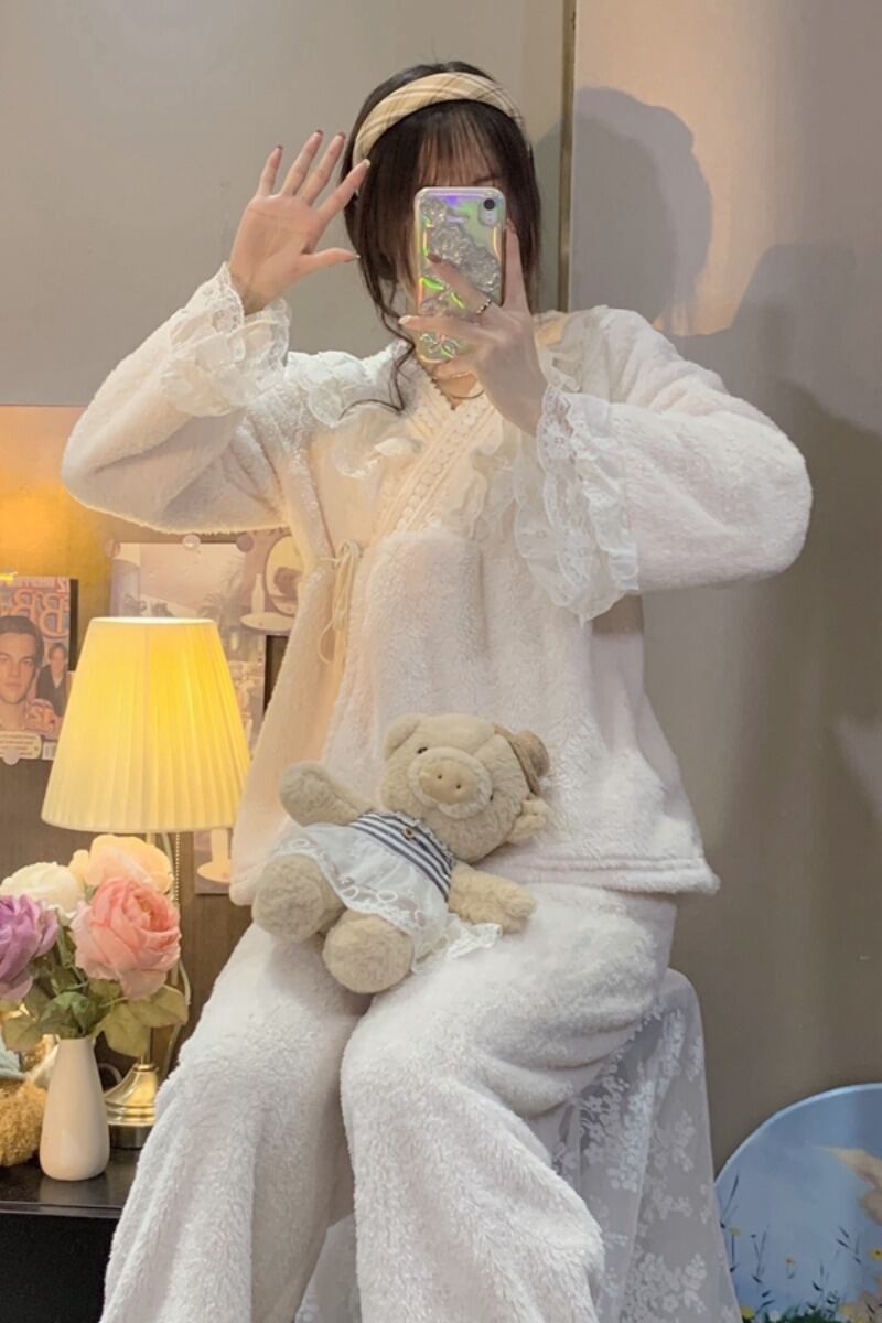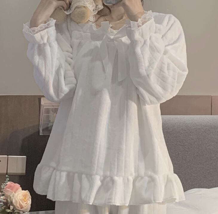 リボンやフリル、レースを使ったかわいいデザインのパジャマ。上下セットで、ゆったりとしたサイズ感なので、着心地が良く、寝心地も抜群です。また、秋に最適な素材を使用しているので、温かく快適に過ごせます。
