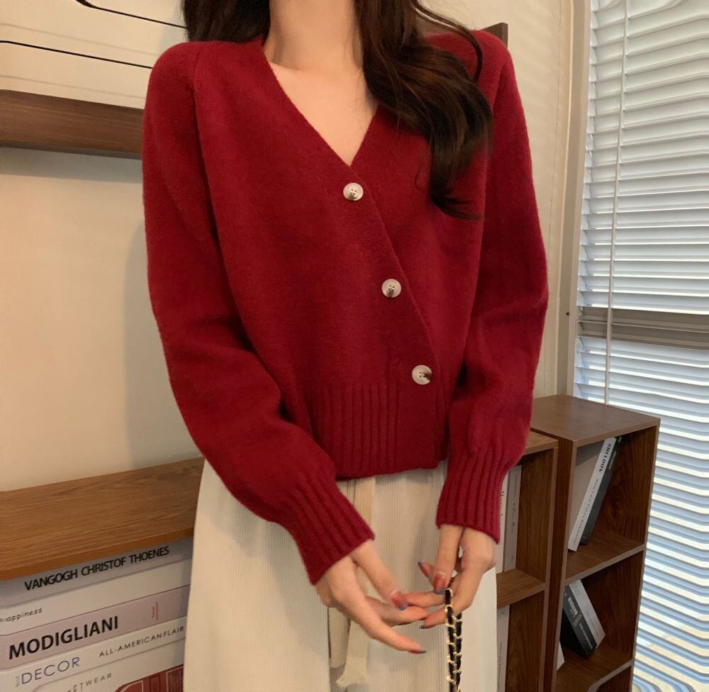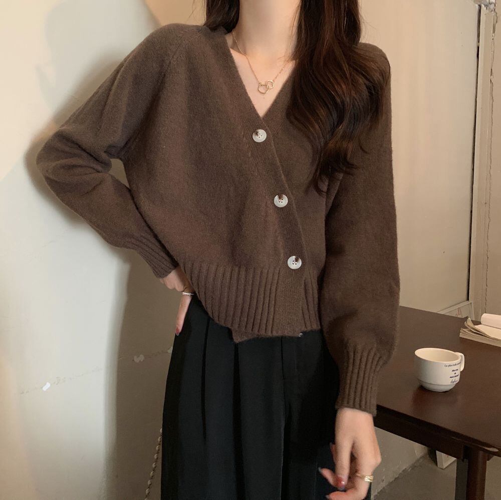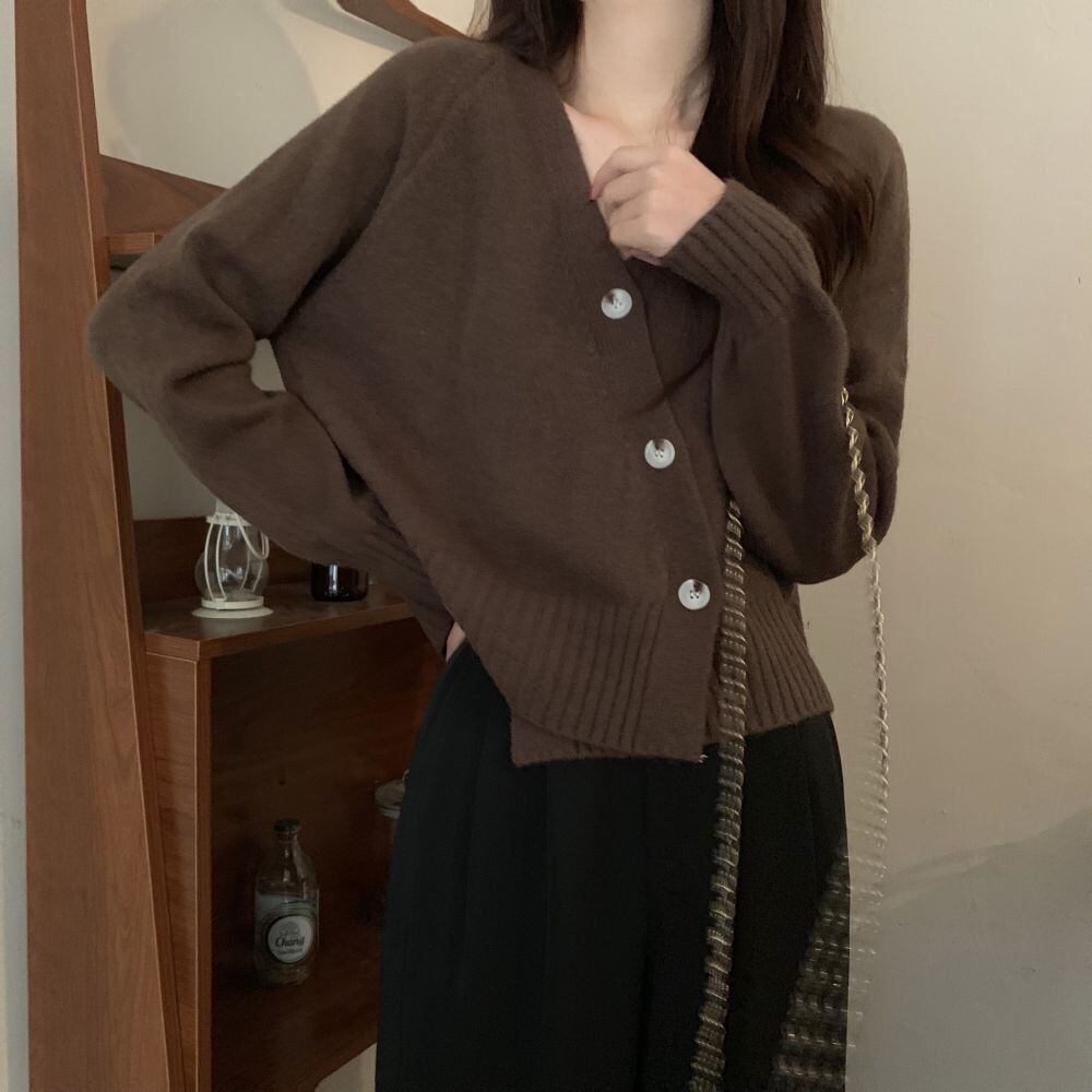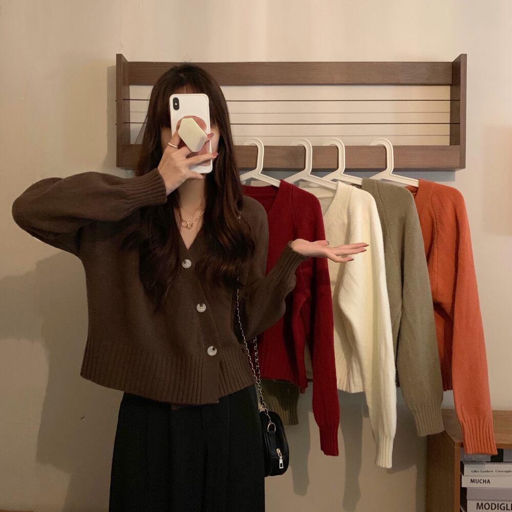 Vネック ショート ニット カーディガン ブラウン 秋新作レディース 茶色 レッド 赤 ワイン グリーン 緑 オリーブ アプリコット 白 ホワイト オレンジ トップス 袖あり 長袖 萌袖 襟なし かわいい 大人可愛い きれいめ シンプル カジュアル 大人 上品 おしゃれ お洒落 大人女子 こなれ感 セクシー エレガント 主役級 存在感 秋 冬 2021 レディース 女性用 学生 デート お出かけ 休日 女子会 イベント 旅行 着回し 定番 普段使い 韓国系 モテ トレンド 流行 インスタ映え おすすめ