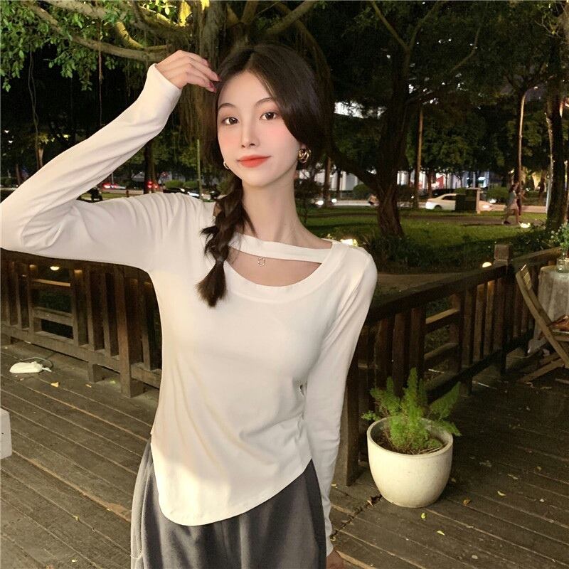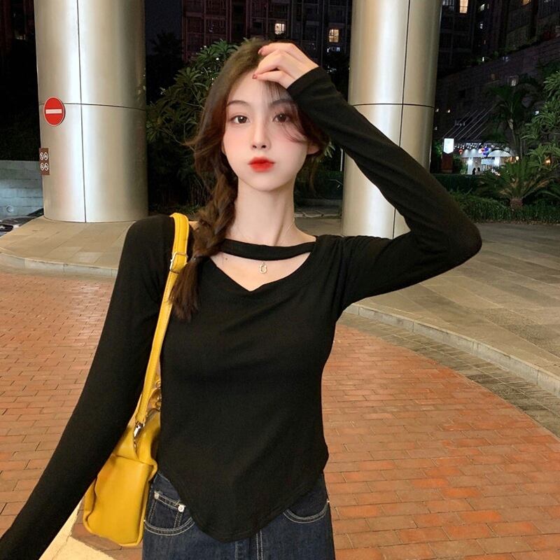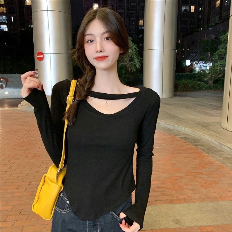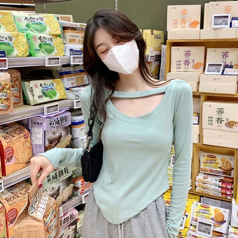 Tシャツ 魅せる トップス ブラック 黒 ホワイト 白 グリーン 韓国ファッション 緑 ショート丈 袖あり 長袖 ラウンドネック スリム 細身 カットアウト くりぬき 大人女子 大人 上品 おしゃれ かっこいい クール カジュアル レトロ レトロ風 こなれ感 ラフ キュート ガーリー かわいい 女子 個性的 デザイン 主役級 存在感 無地 春 スプリング 秋 オータム 10代 20代 レディース 女性用 学生 通学 デート お出かけ 女子会 着回し 普段使い トレンド ワンサイズ