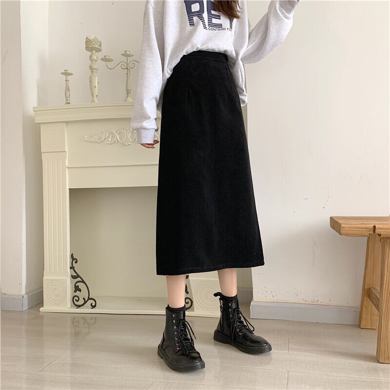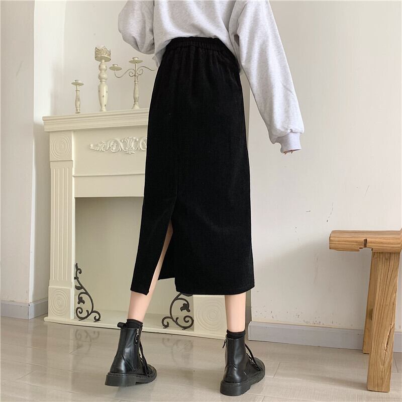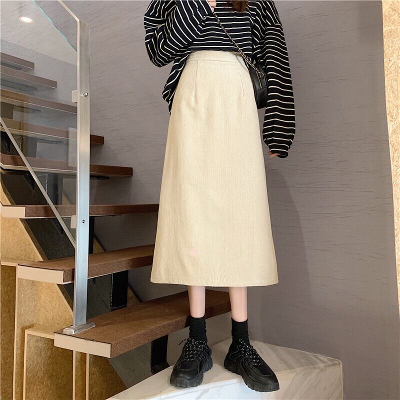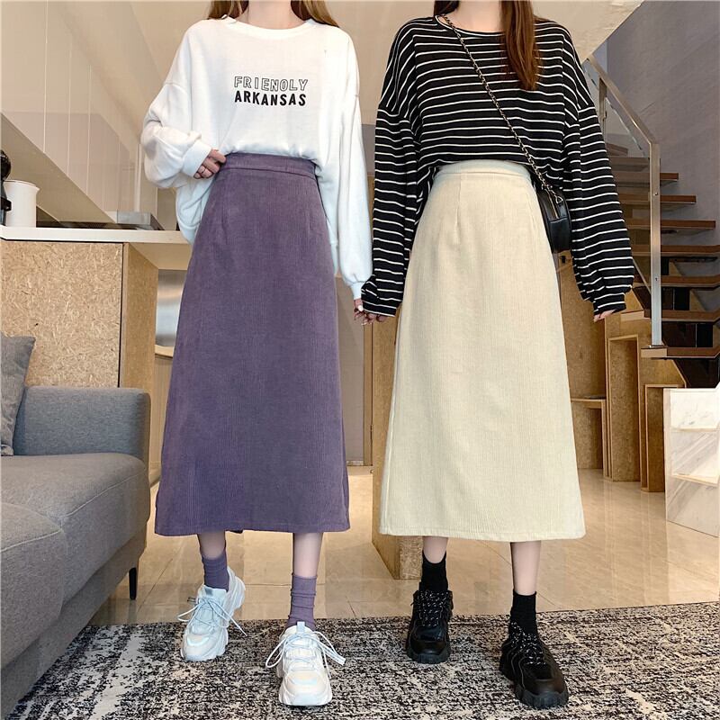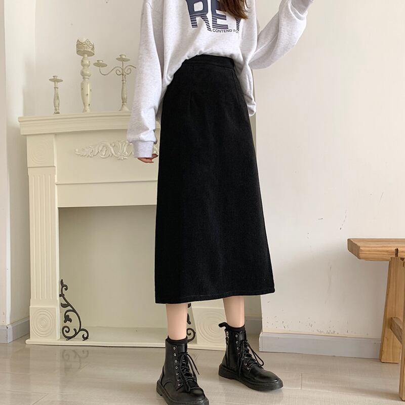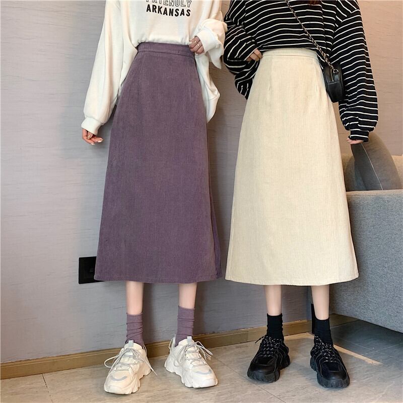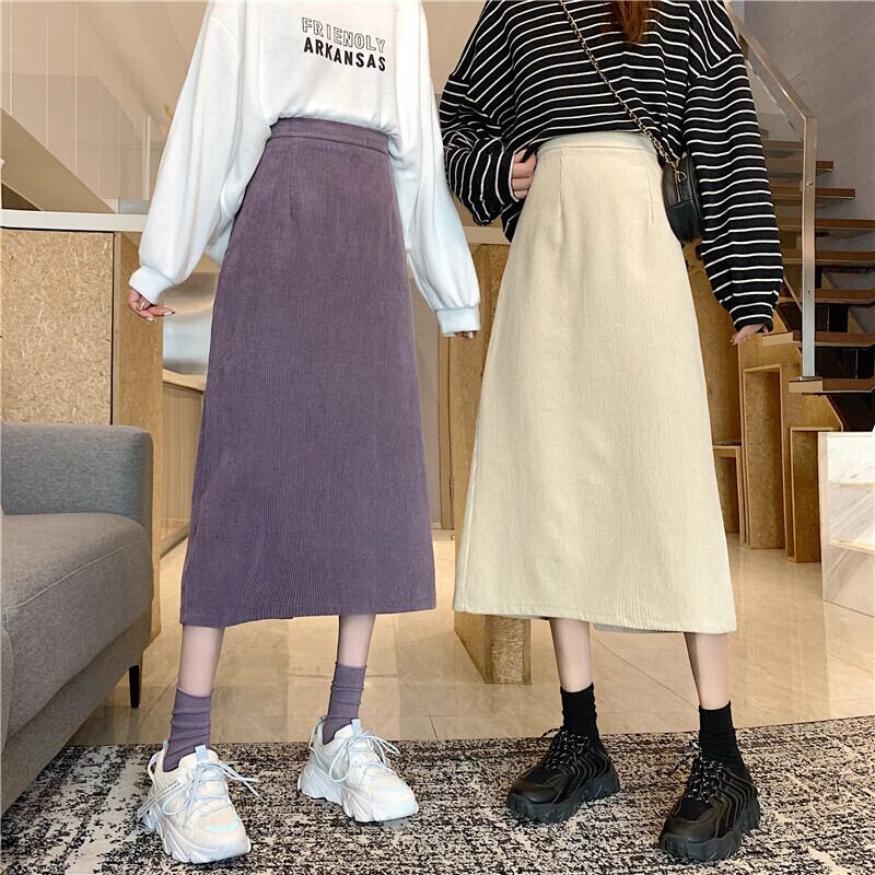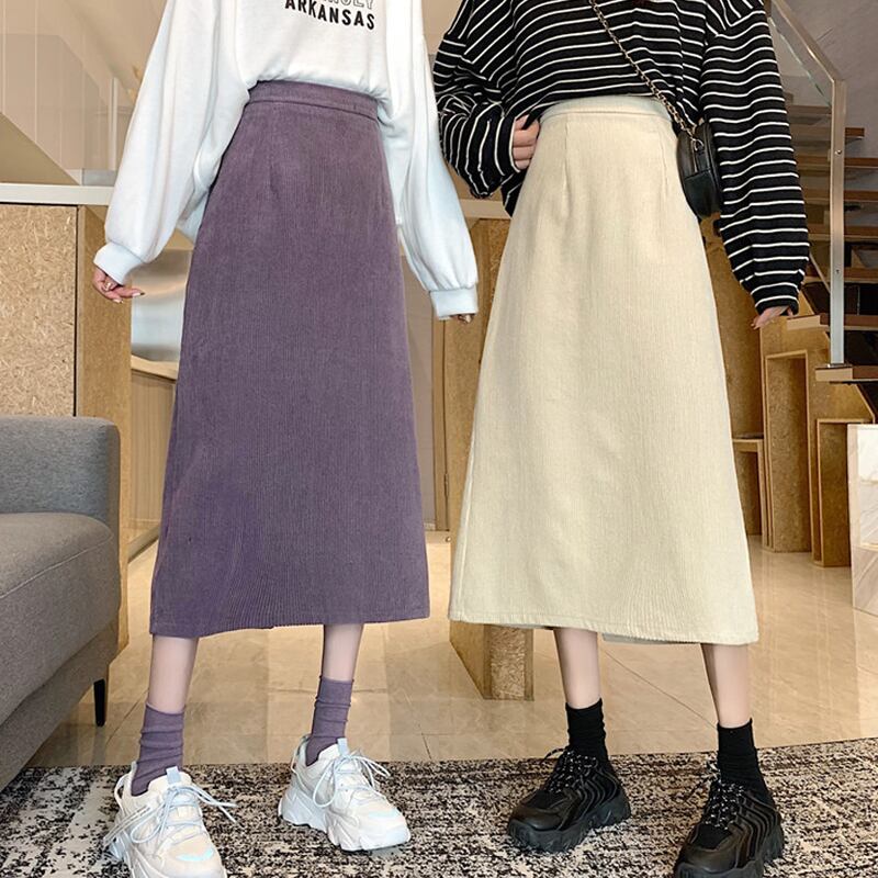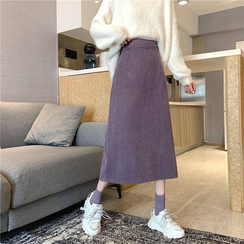 Aラインスカート シンプル スカート ロングスカート 韓国ファッション ブラック 黒 アプリコット パープル 紫 ミドル丈 Aライン スリム 細身 スリット コーデュロイ 大人女子 大人 上品 おしゃれ かっこいい クール きれいめ シンプル エレガント レトロ レトロ風 こなれ感 ラフ 主役級 存在感 無地 春 スプリング 秋 オータム 10代 20代 30代 レディース 女性用 オフィス ビジネス OL 通勤 学生 通学 着回し 普段使い トレンド ファッション コーデ M L XL