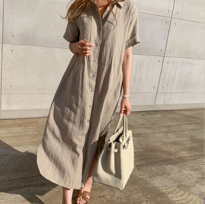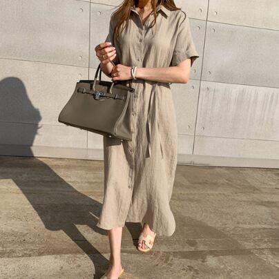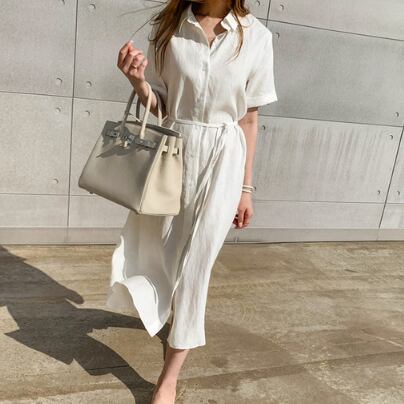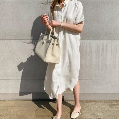 シャツワンピースは、一枚でさまざまな着こなしを楽しめる大人女子の強い味方です。本商品は、シンプルなデザインでどんなシーンにもマッチし、Vネックと襟のデザインがフェミニンな雰囲気を演出してくれます。ホワイト、カーキの2色展開で、どちらもミディアム丈で、半袖と袖ありの選べるタイプとなっています。どちらもストレートなシルエットで、主役級の存在感があるのに、ラフに着られるゆるかわさもキープできます。