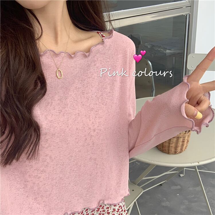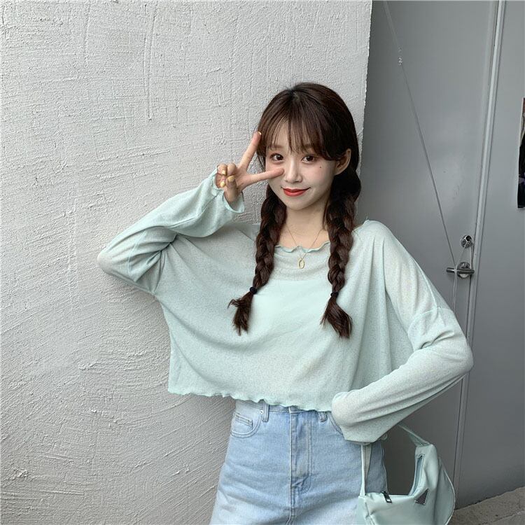 シアートップス トップス カットソー ショート ショート丈 長袖 萌袖 ラウンドネック フリル 透け感 シースルー 薄手 春 夏 10代 20代 30代 レディース 女性用 女の子 学生 通学 デート お出かけ 女子会 休日 着回し 普段使い 重ね着 韓国 韓国系 ファッション コーデ スタイル 楽ちん モテ トレンド 流行 パステルカラー 春カラー ニュアンスカラー カラバリ 個性的 女の子プレゼント 安いお得 合わせやすい 低価格 コスパ 値段重視 低予算 インポート 海外 イメチェン 好感度