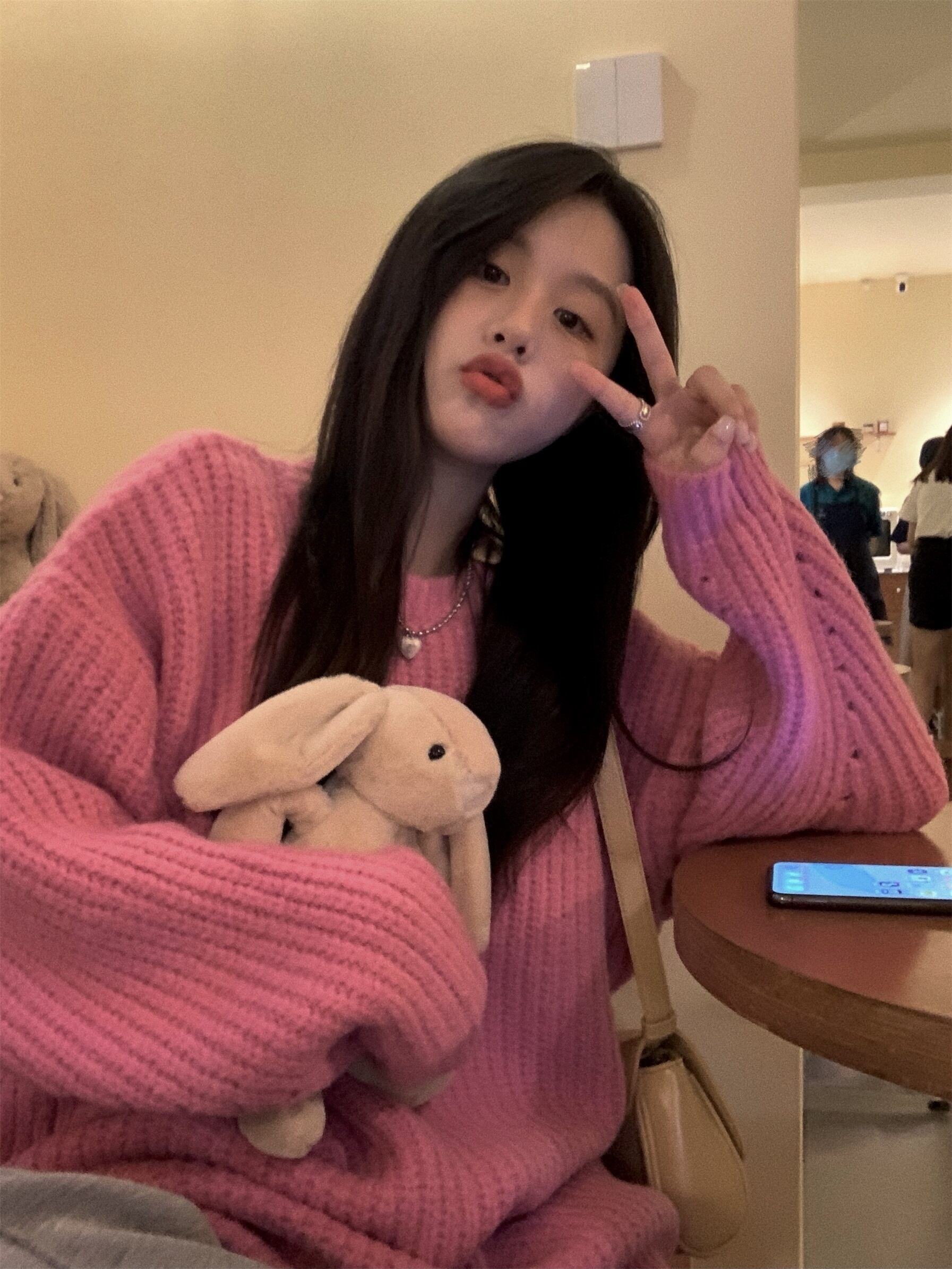 こちらは、フリーサイズで着用可能なトップスセーターです。ピンクアプリコットの無地で、長袖のボリューム袖とドロップショルダーが特徴的です。Uネックとラウンドネックの2タイプを選べ、どちらもワイドリブニットで厚手なので、寒い季節にも活躍してくれます。