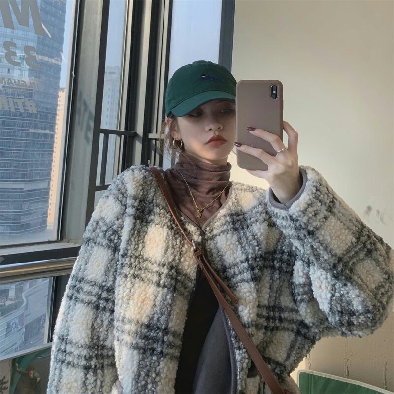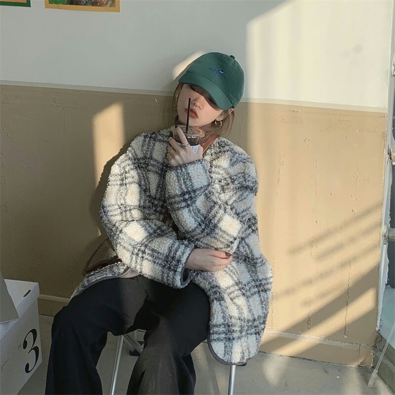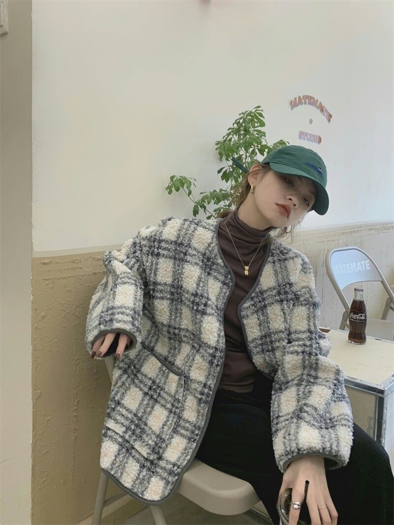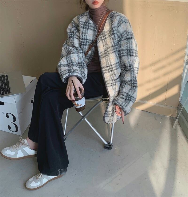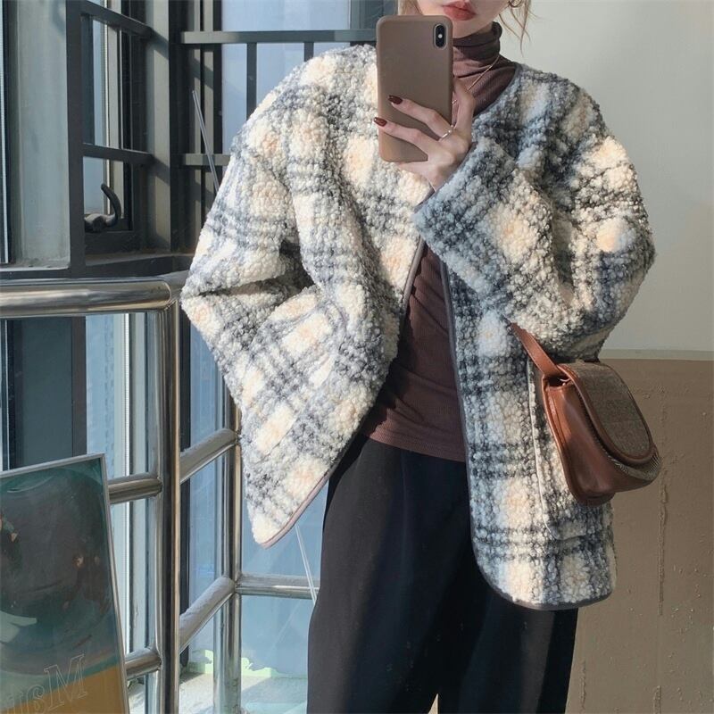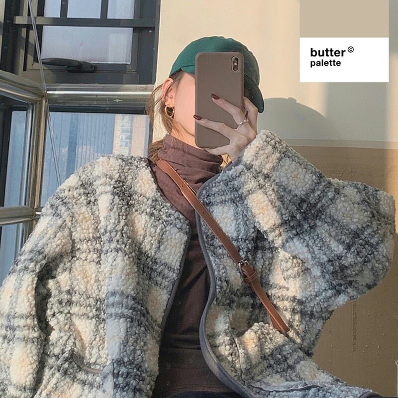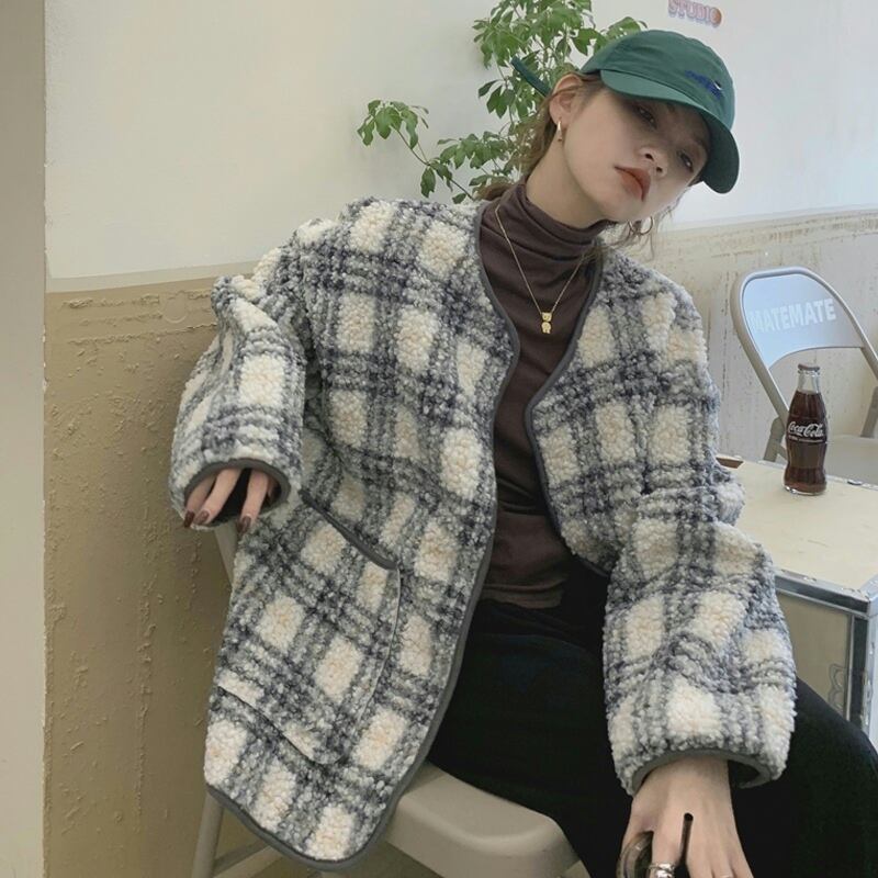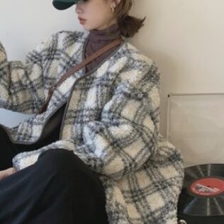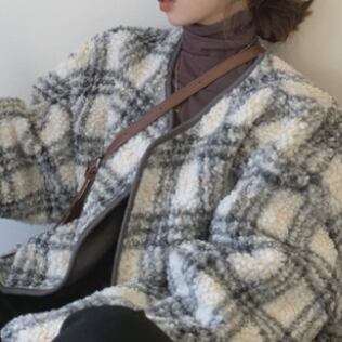 ラムウールジャケット アウター ジャケット もこもこアウター ボアブルゾン 袖あり 長袖 襟なし もこもこ モコモコ 前開き かわいい 大人可愛い カジュアル おしゃれ お洒落 大人可愛い 大人女子 こなれ感 ラフ キュート ガーリー 個性的 主役級 存在感 チェック柄 秋 冬 10代 20代 30代 レディース 女性用 女の子 デート お出かけ 公園デビュー 女子会 お泊まり 休日 韓国 韓国系 ファッション コーデ 楽ちん 暖かい 防寒 モテ トレンド 流行 インスタ映え 個性的 インポート 海外