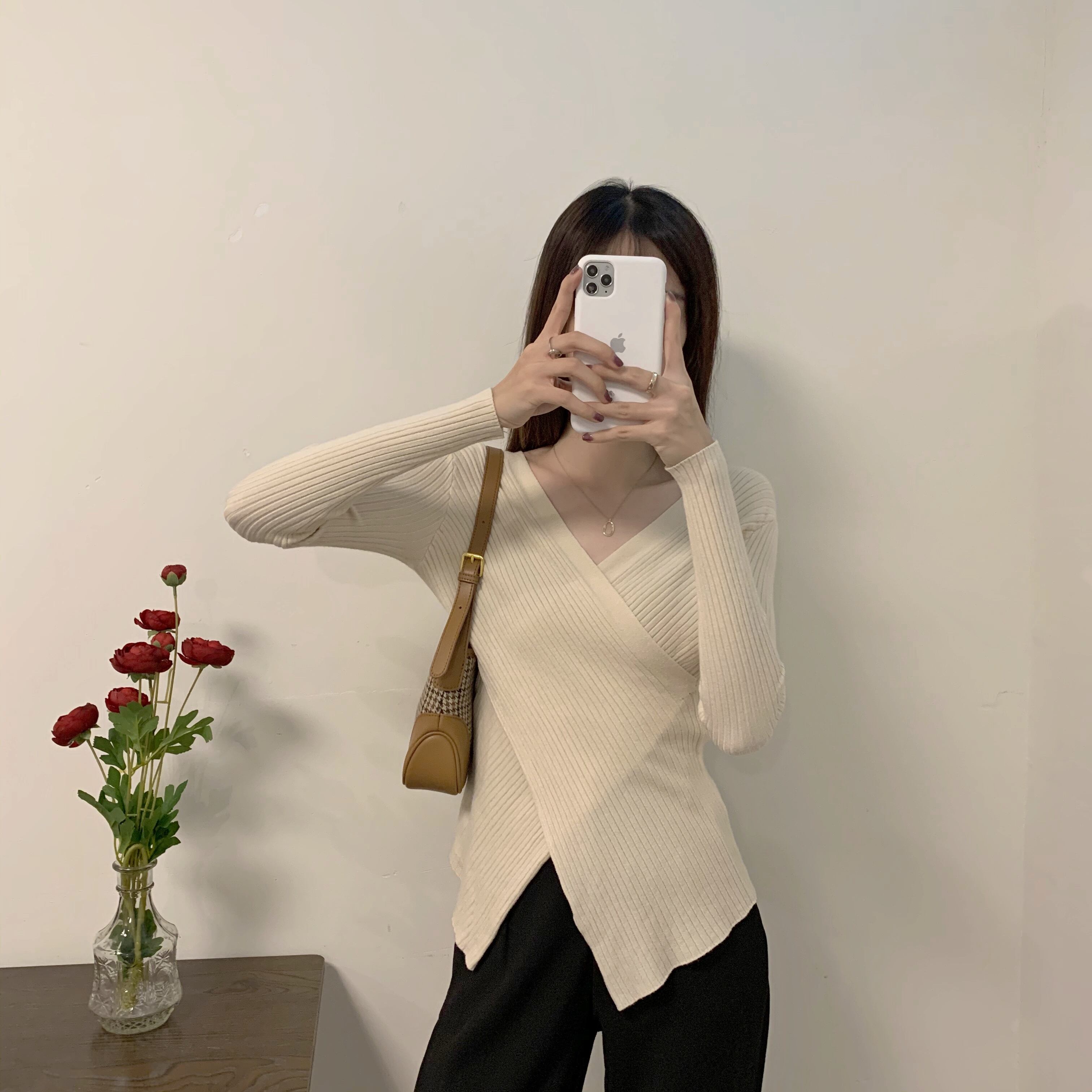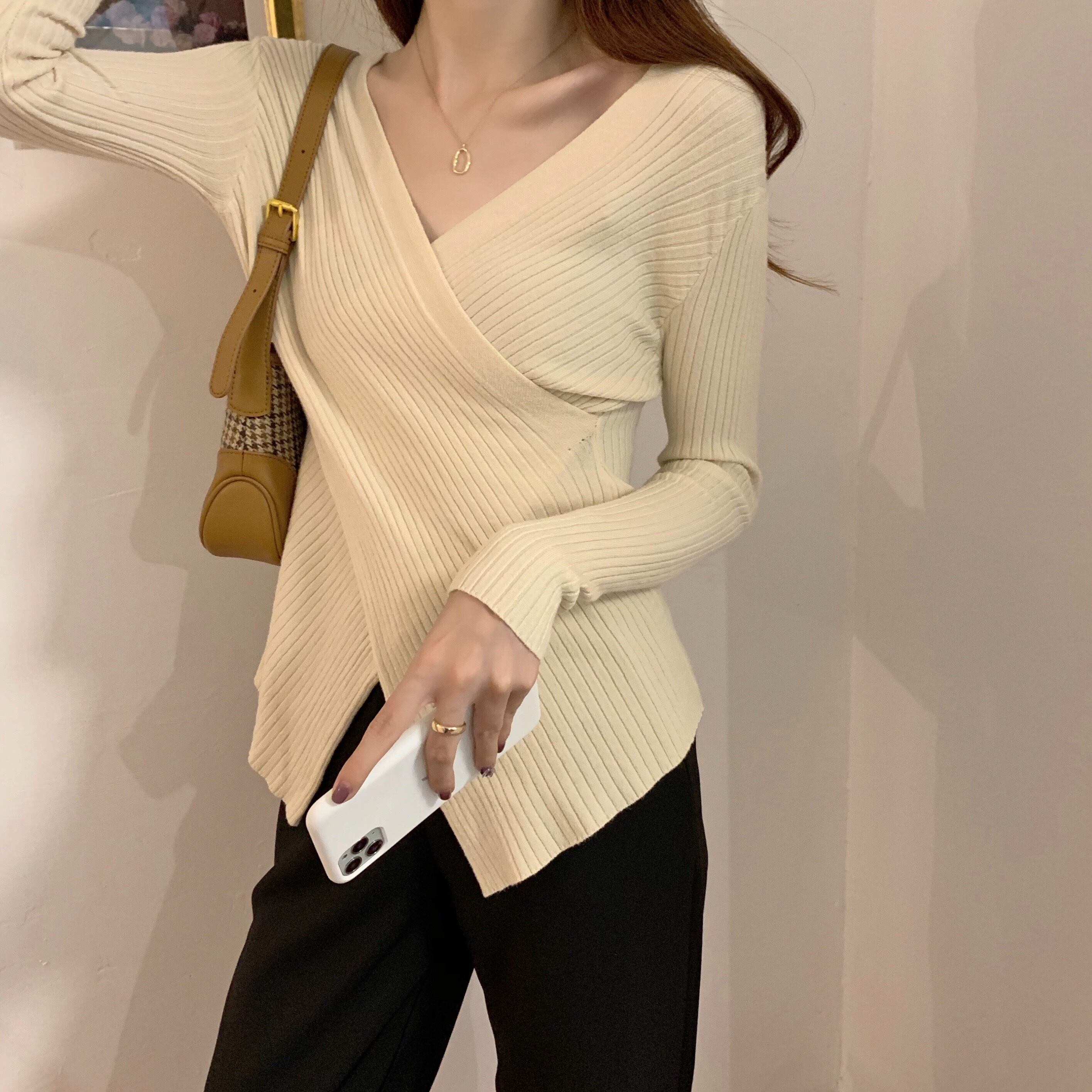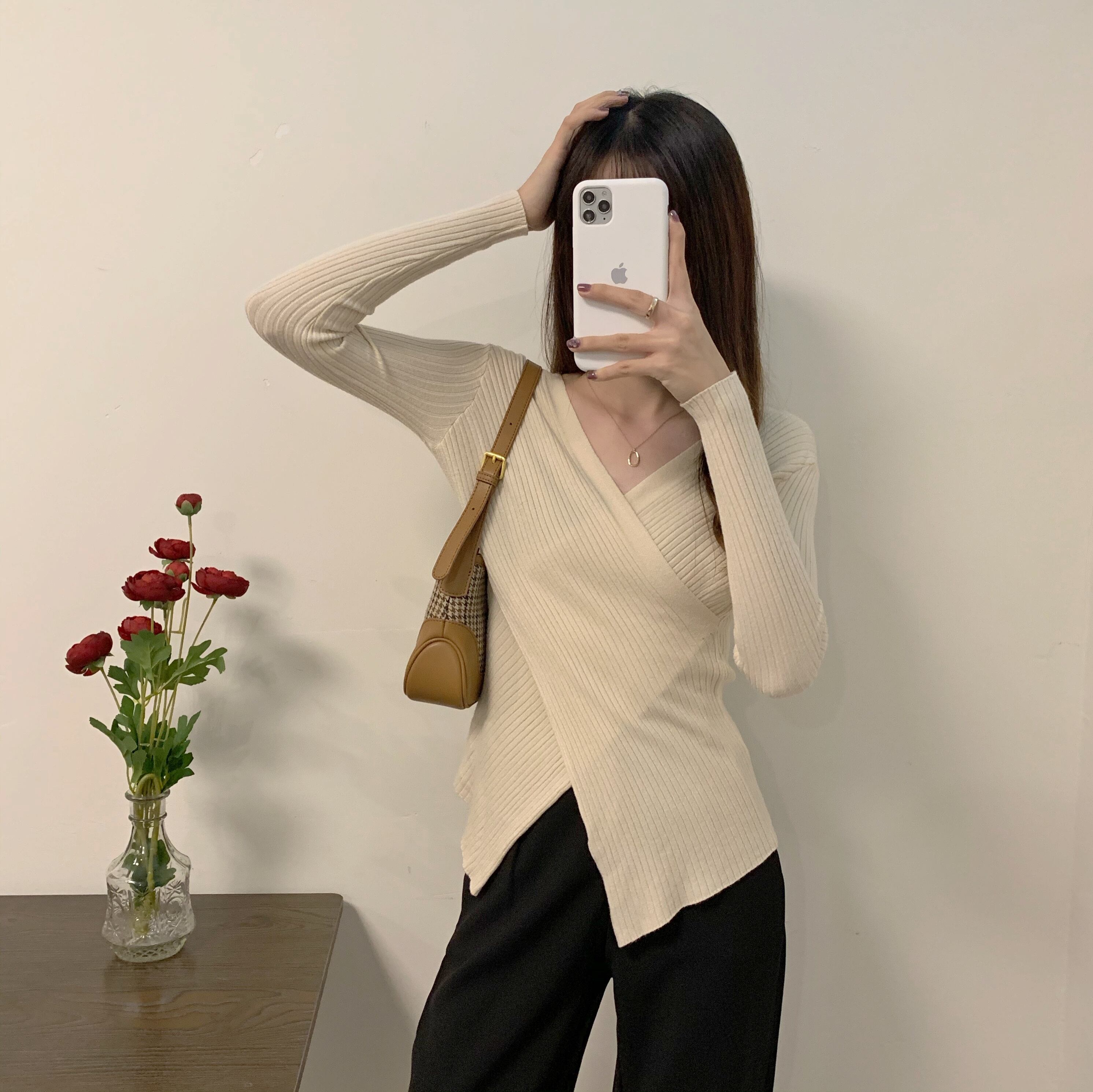 カットソー 魅せる トップス ニットソー セーター ブラック 黒 グレー 灰色 ブラウン 茶色 アプリコット レギュラー丈 袖あり 長袖 Vネック スリム タイト 細身 大人女子 大人 上品 おしゃれ かっこいい クール きれいめ シンプル エレガント レトロ レトロ風 こなれ感 ラフ 個性的 デザイン 主役級 存在感 無地 秋 冬 10代 20代 30代 レディース 女性用 オフィス ビジネス OL 通勤 学生 通学 着回し 普段使い ファッション コーデ ワンサイズ
