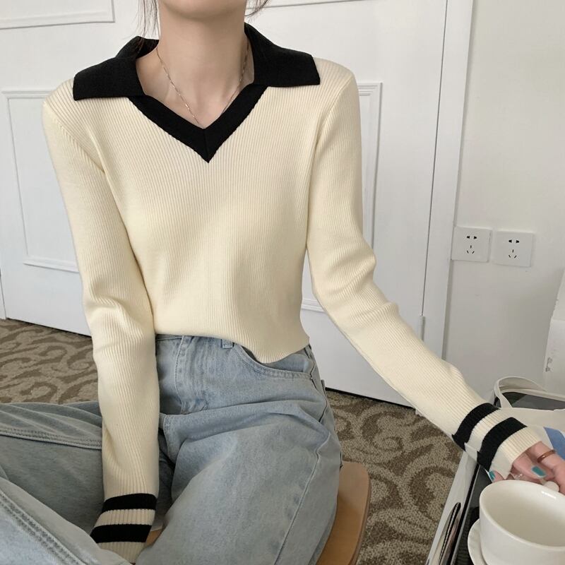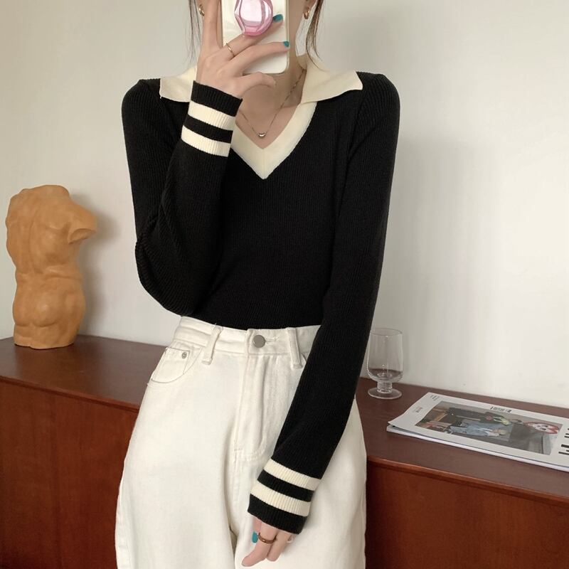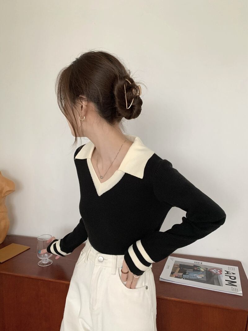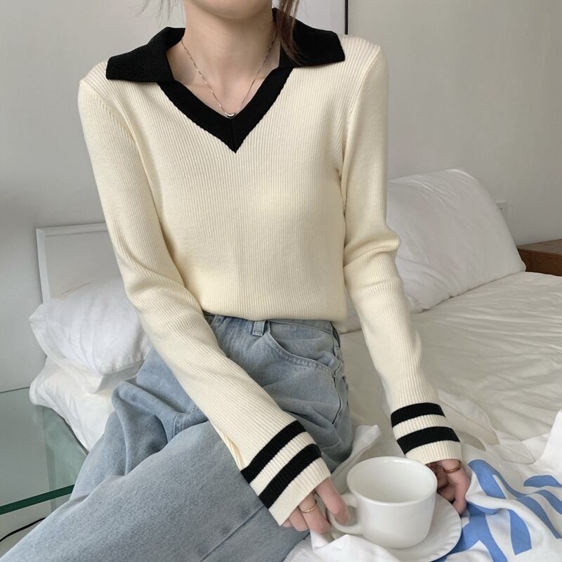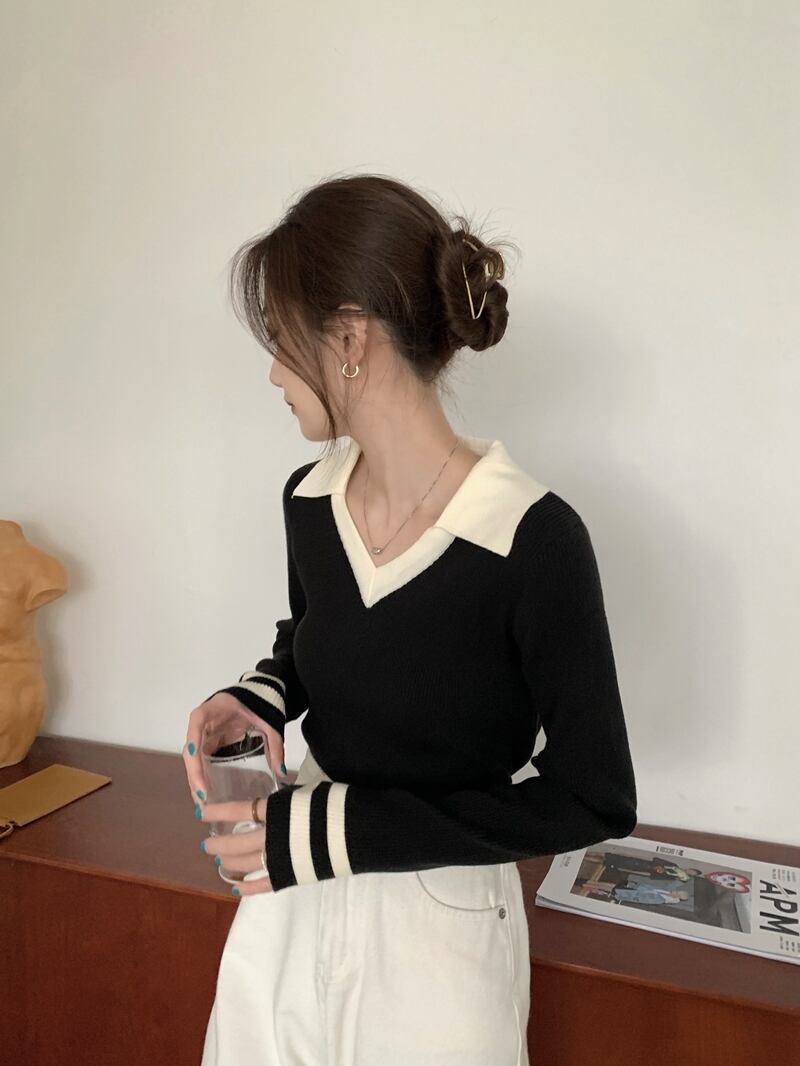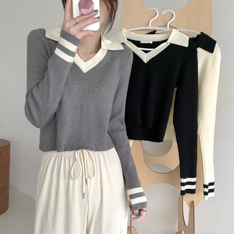 スキッパー 袖ライン 配色 トップス ニットソー セーター ショート丈 長袖 Vネック 襟付き スリム タイト 細身 スマート リブ ニット シンプル カジュアル 大人 おしゃれ かっこいい 大人女子 スポーティー クール 春 秋 冬 2021 10代 20代 30代 40代 レディース 女性用 ママ 通学 お出かけ 公園デビュー 休日 着回し 普段使い 韓国 韓国系 オルチャン 新作 トレンド フリーサイズ ブラック グレー ベージュ 安いお得 合わせやすい 低価格 コスパ 値段重視 低予算