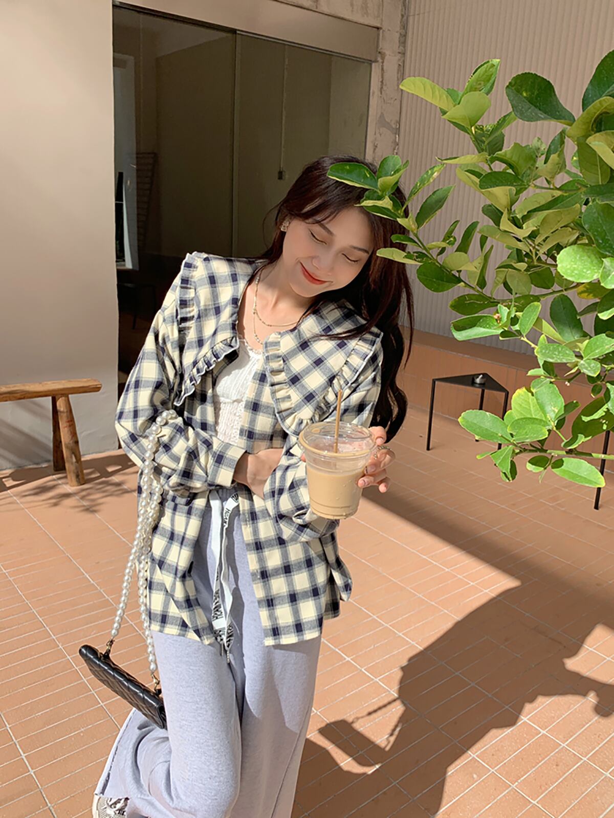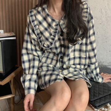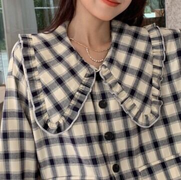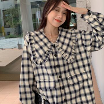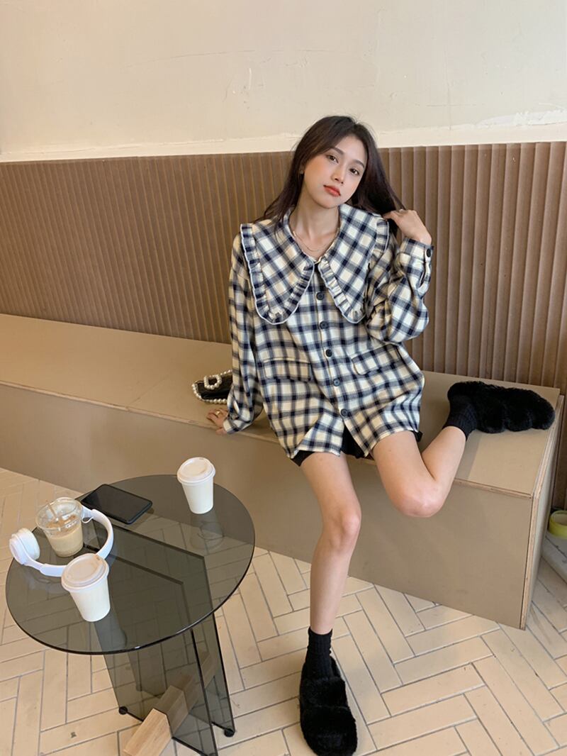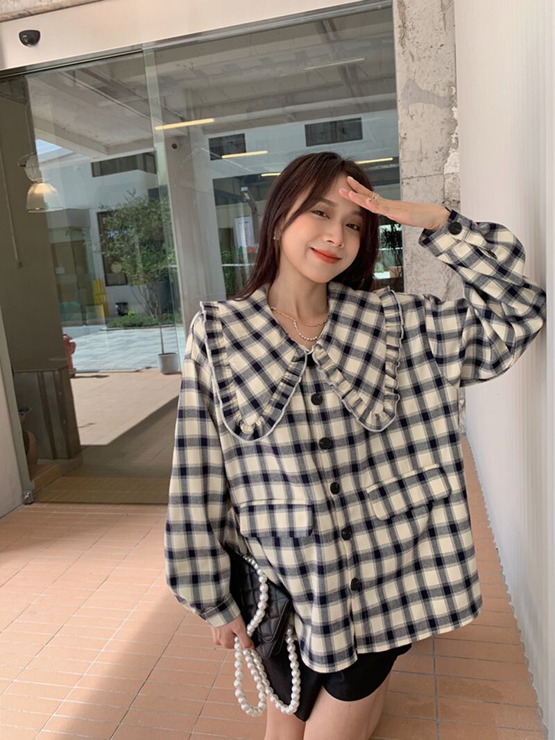 シャツ トップス アウター ブラウス カーディガン チュニック コート 上着 ミディアム丈 長袖 襟付き ドールカラー フリル ポケット 前開き ボタン 薄手 かわいい カジュアル おしゃれ レトロ 大人可愛い こなれ感 ラフ キュート ガーリー ルーズ 存在感 抜け感 チェック柄 春 秋 誕生日 バレンタイン 10代 20代 レディース 通勤 学生 通学 デート お出かけ 女子会 休日 旅行 着回し 普段使い 重ね着 ファッション コーデ モテ S M L ゆる 韓国 韓国系 お揃い 双子コーデ