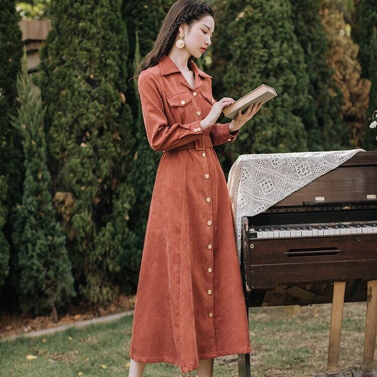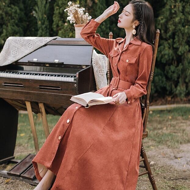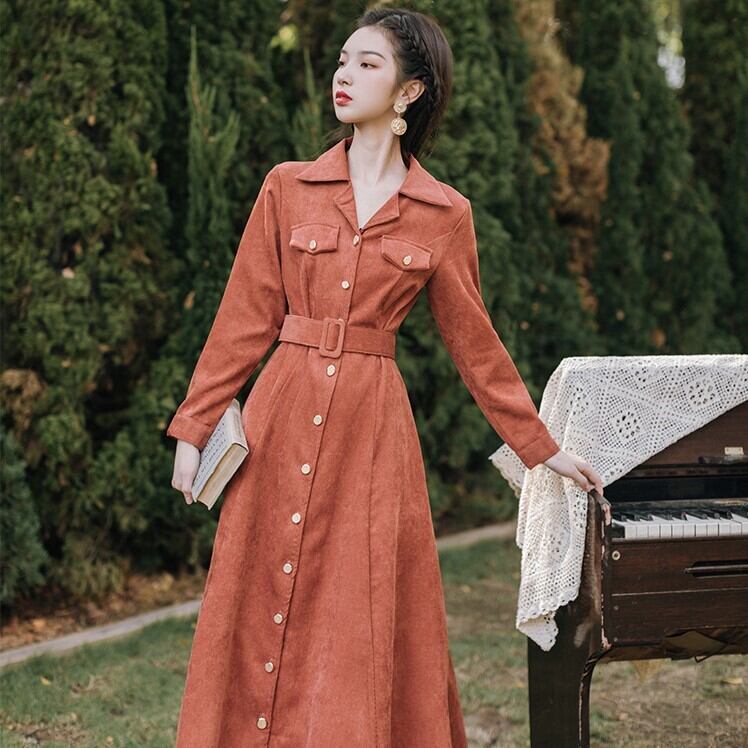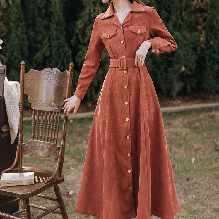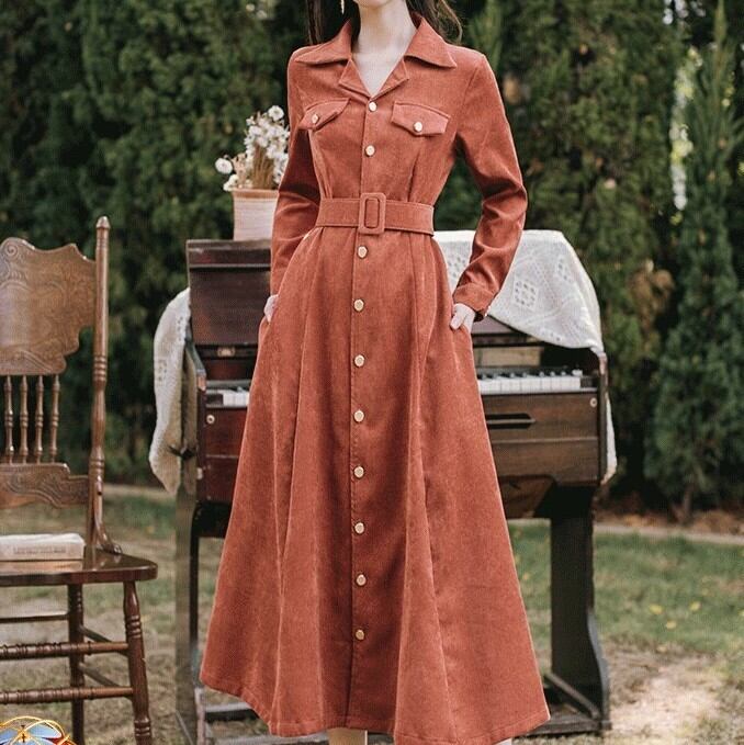 コーデユロイワンピース トレンチ風 オレンジ ワンピース オールインワン ミモレ ミモレ丈 ロング ロング丈 長袖 Vネック 襟付き ベルト コーデュロイ かわいい きれいめ シンプル カジュアル 大人 上品 レトロ 大人可愛い こなれ感 ラフ ラブリー キュート ガーリー クール 主役級 無地 春 秋 冬 誕生日 謝恩会 結婚式 二次会 ハロウィン クリスマス バレンタイン レディース 女性用 デート お出かけ 女子会 お泊まり 休日 アウトドア パーティー イベント リゾート 旅行 ホテル レストラン